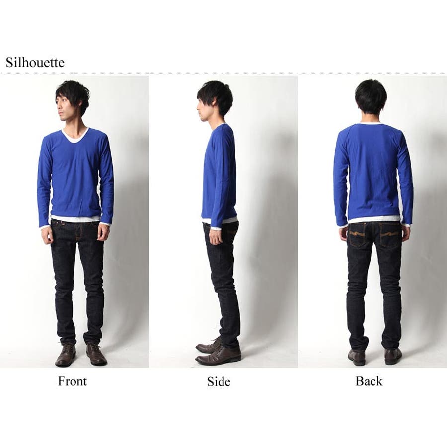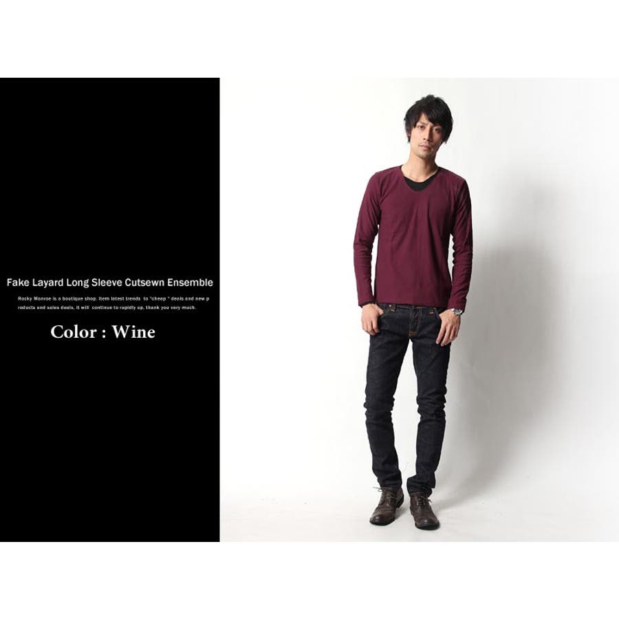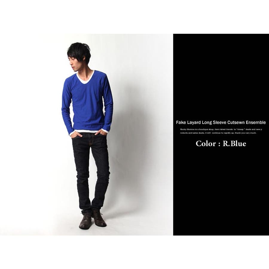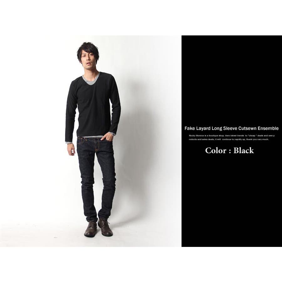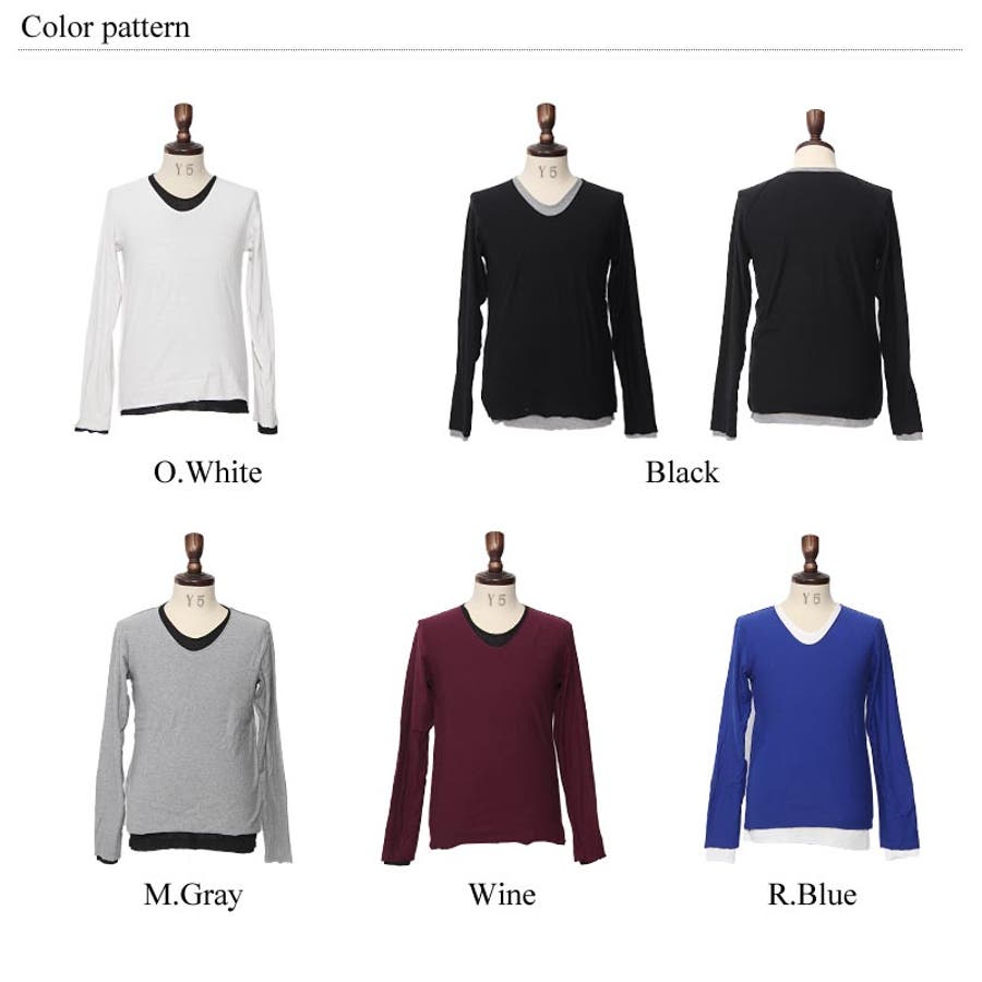 フェイクレイヤード長袖無地Uネックカットソー メンズ ロンTシャツ