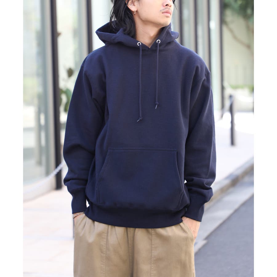 ザラ感のあるざっくりした風合い、乾いた硬い肌ざわりが特徴の厚手生地を使用したプルオーバーフーディーです。