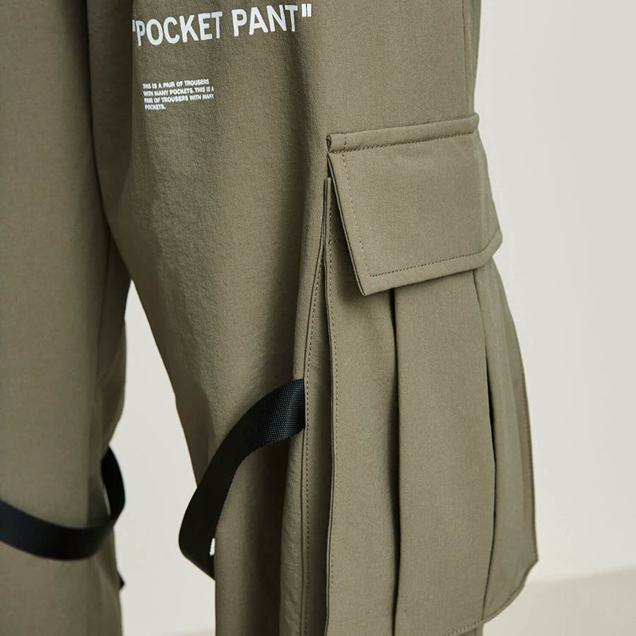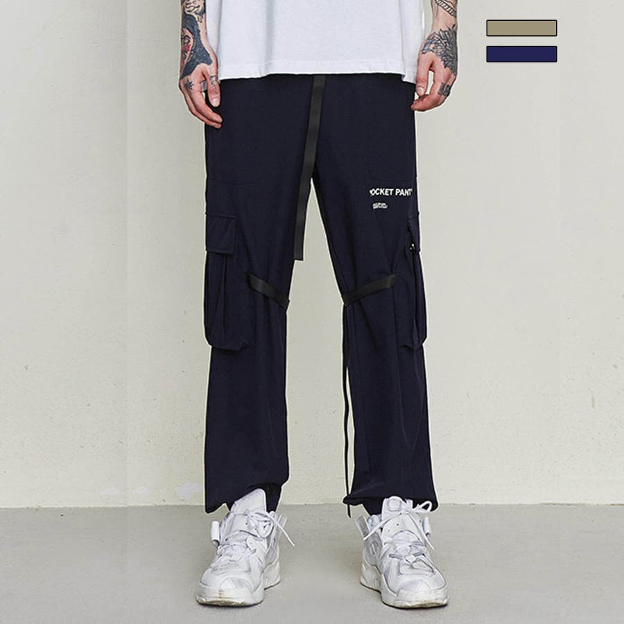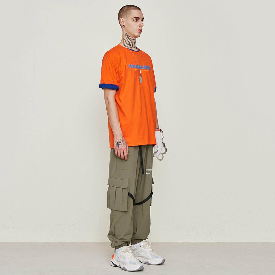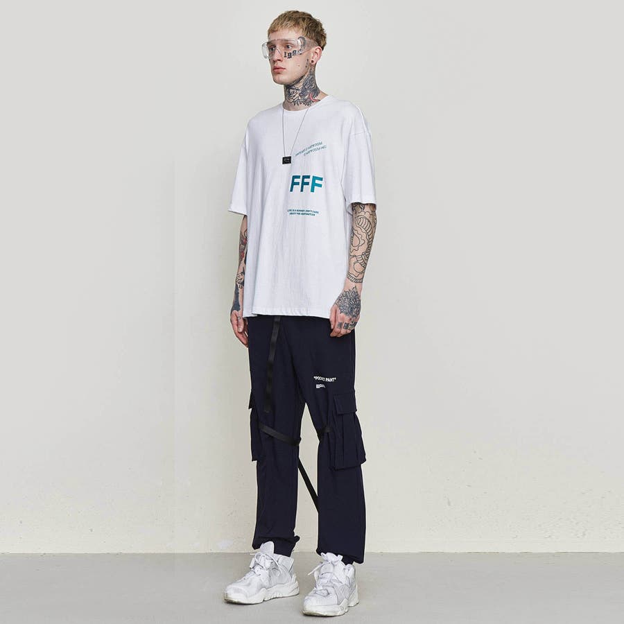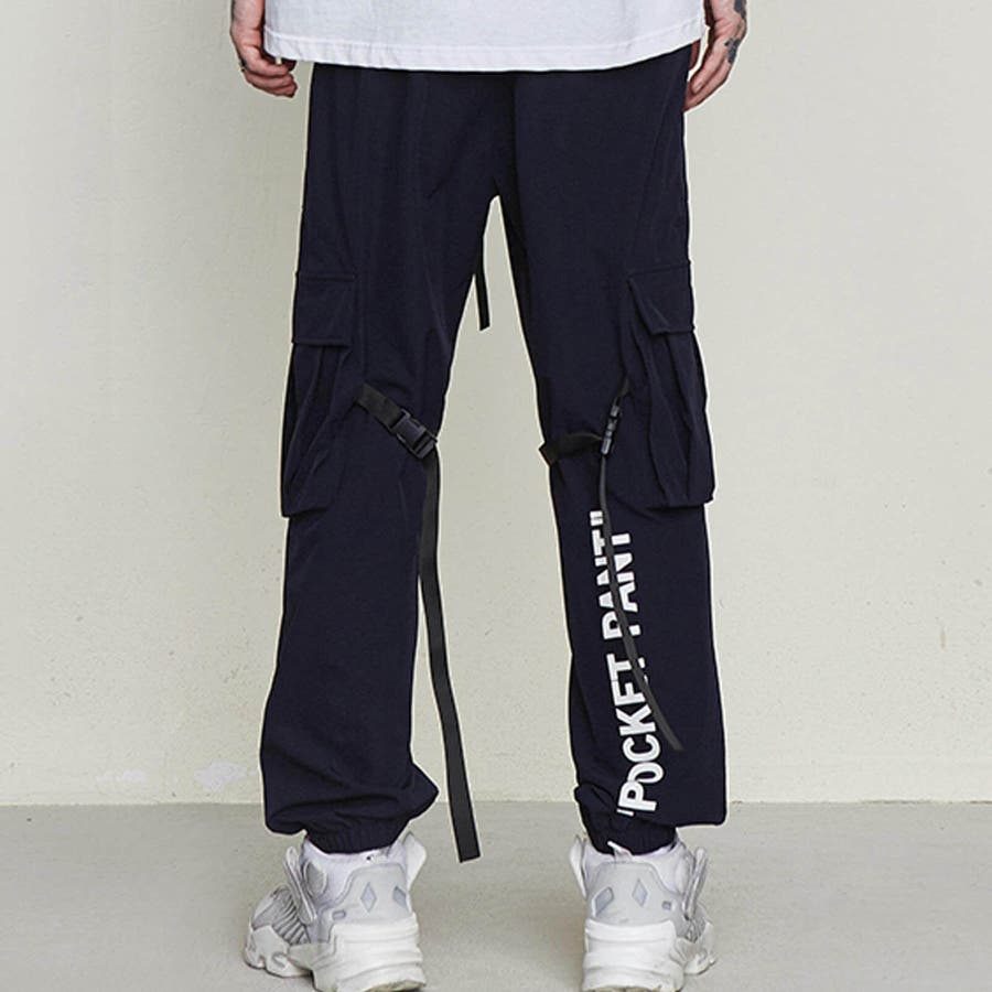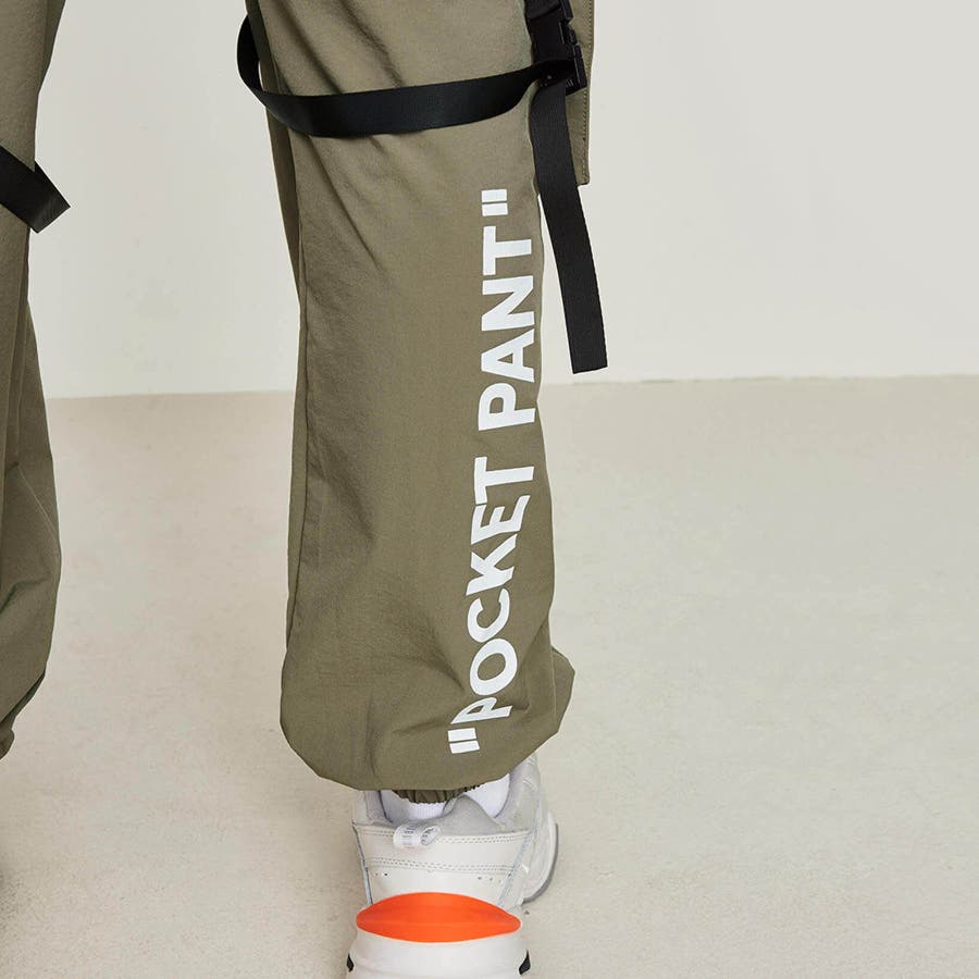 膝周りのバックルベルトがパンキッシュな雰囲気ながらも、ゆったりめのシルエットと適宜施されたタイポグラフィがストリート調の雰囲気に仕上げています。