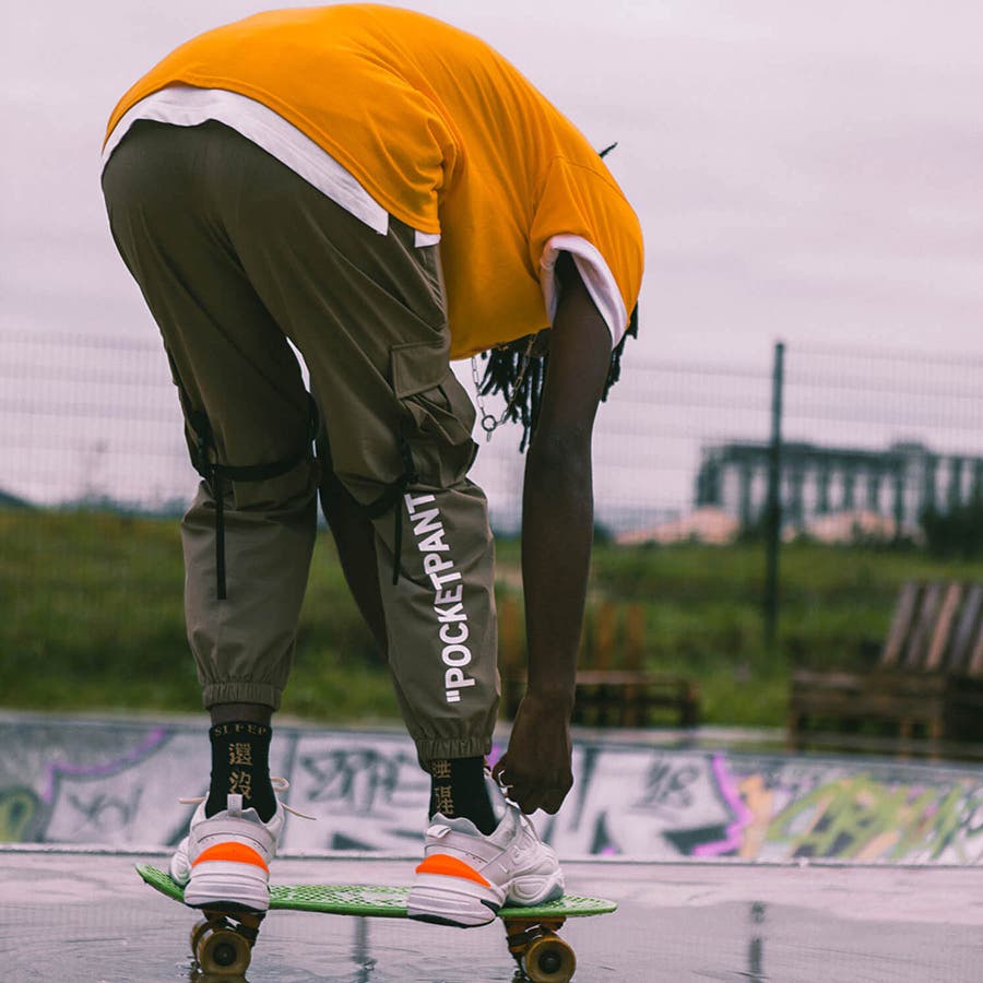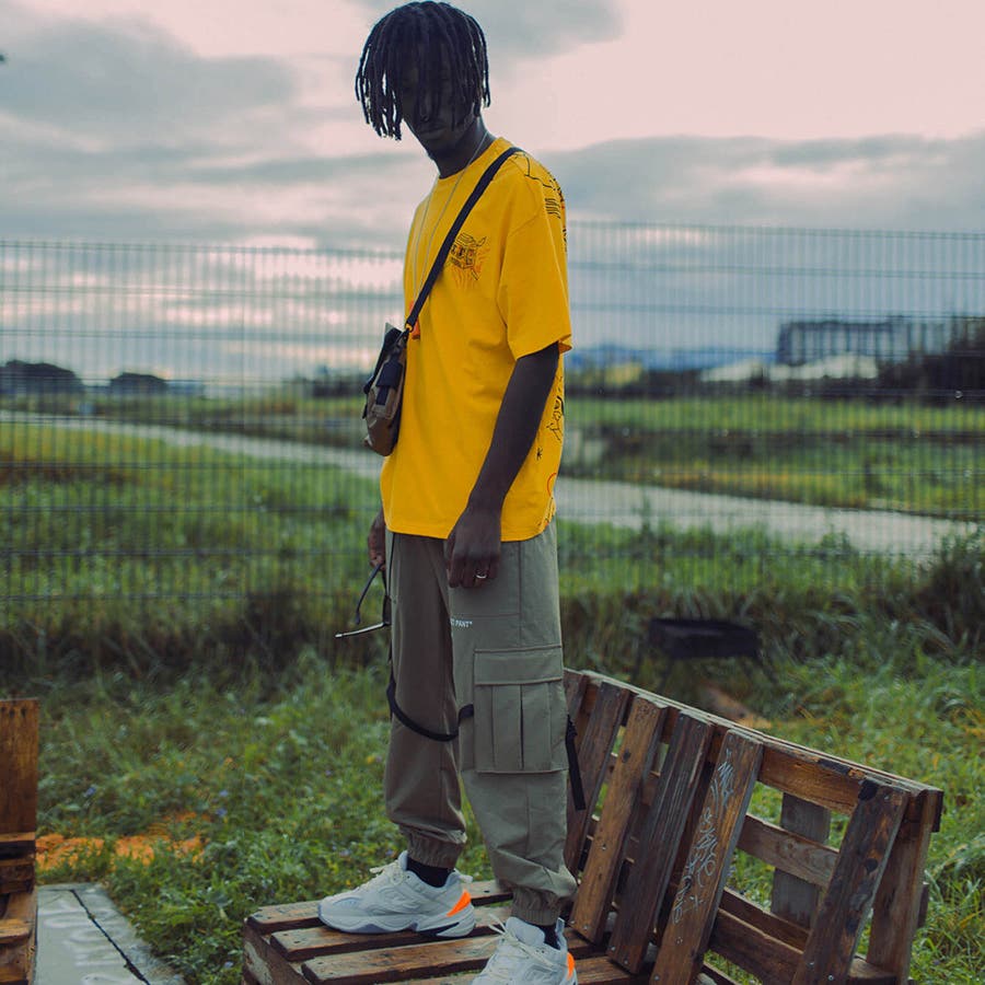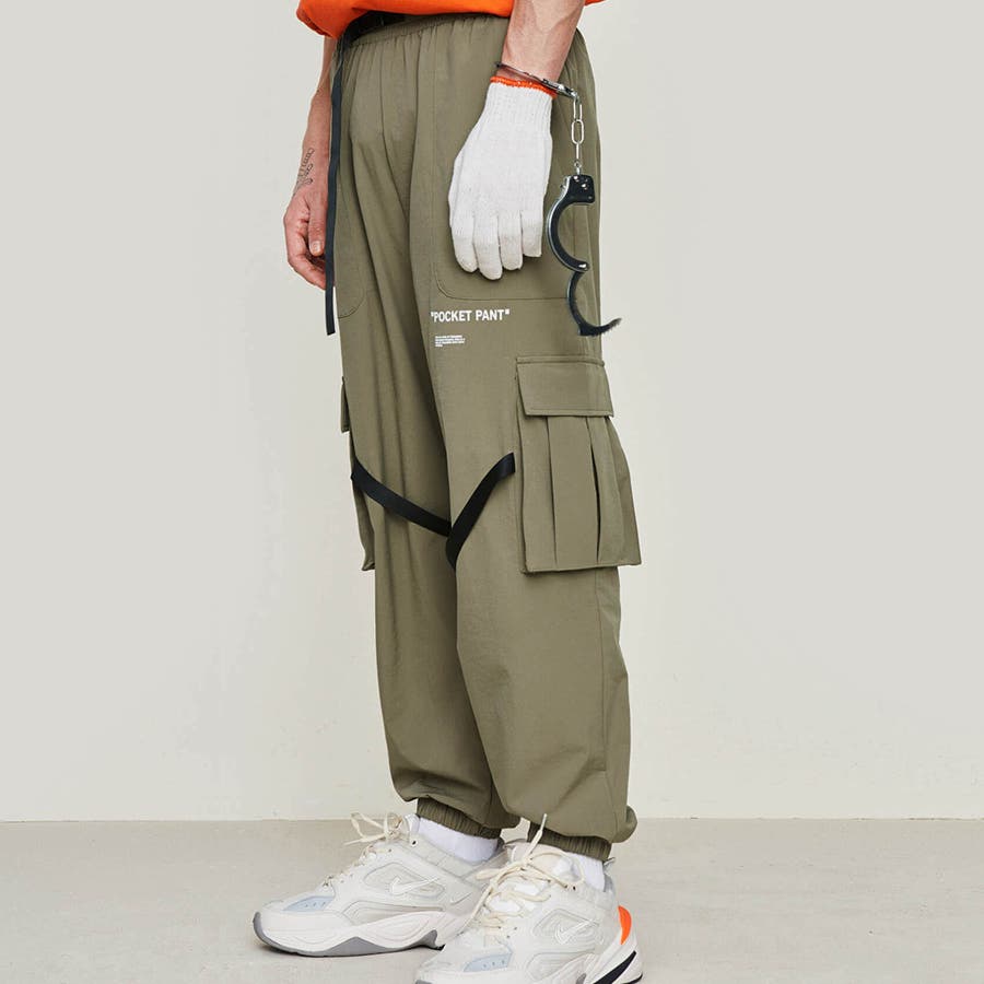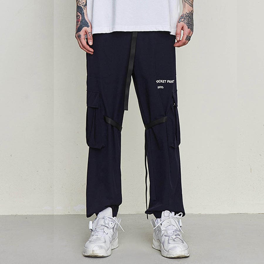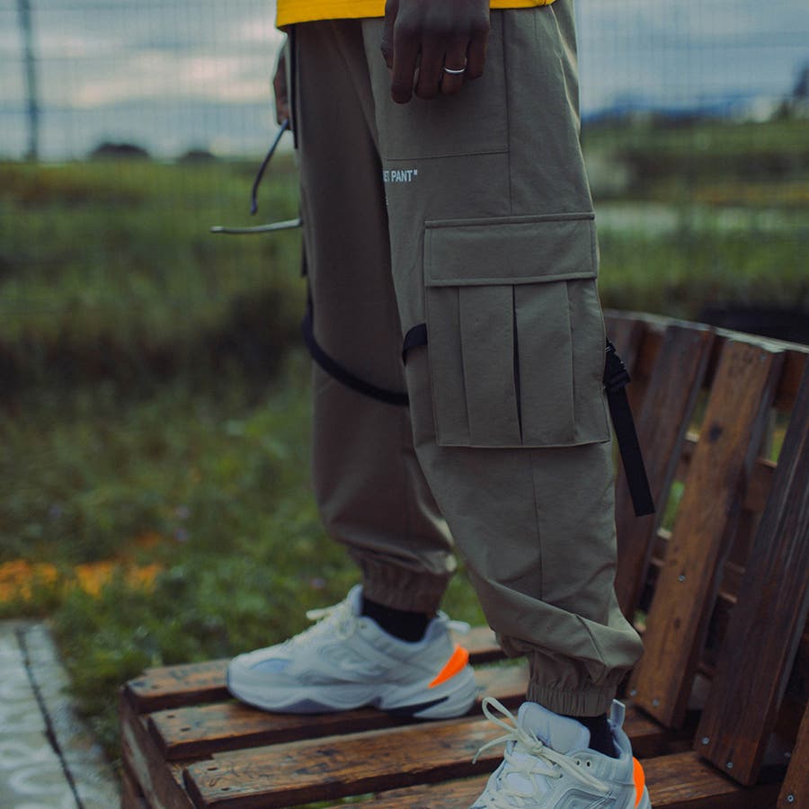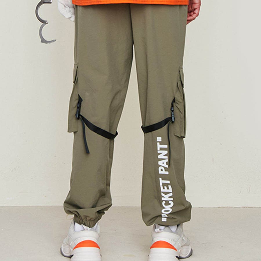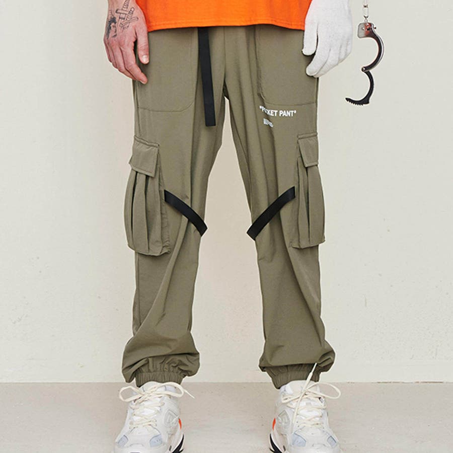 膝周りのバックルベルトがパンキッシュな雰囲気ながらも、ゆったりめのシルエットと適宜施されたタイポグラフィがストリート調の雰囲気に仕上げています。