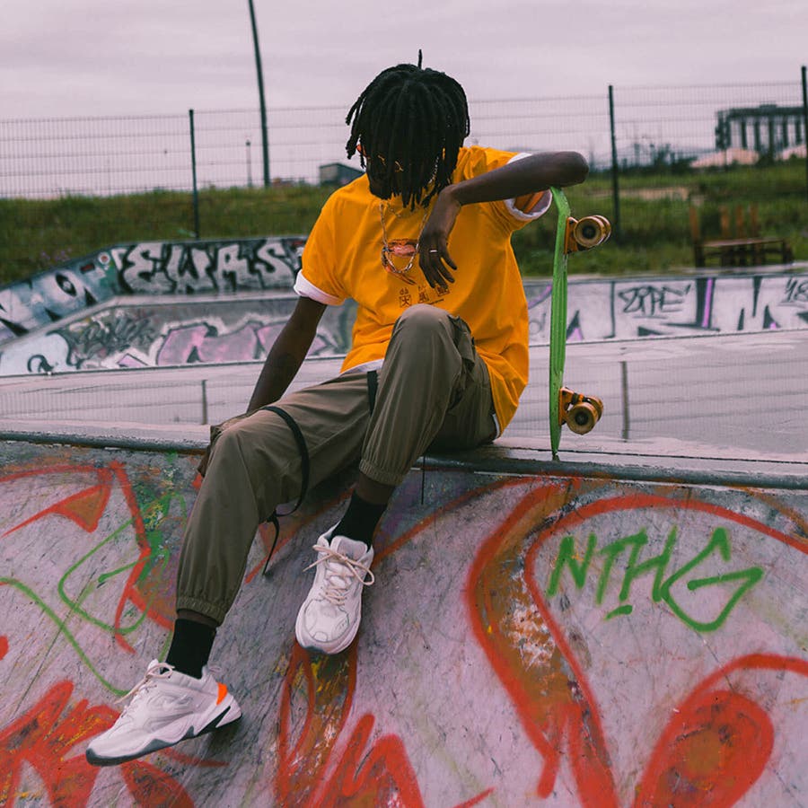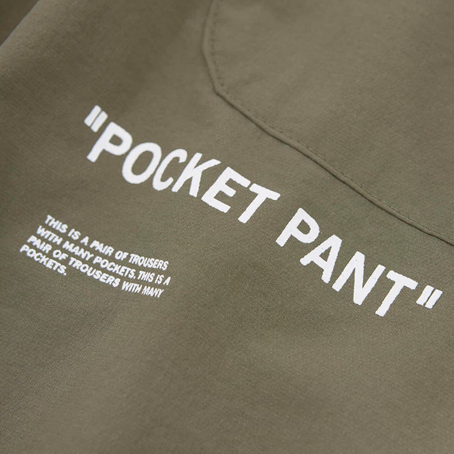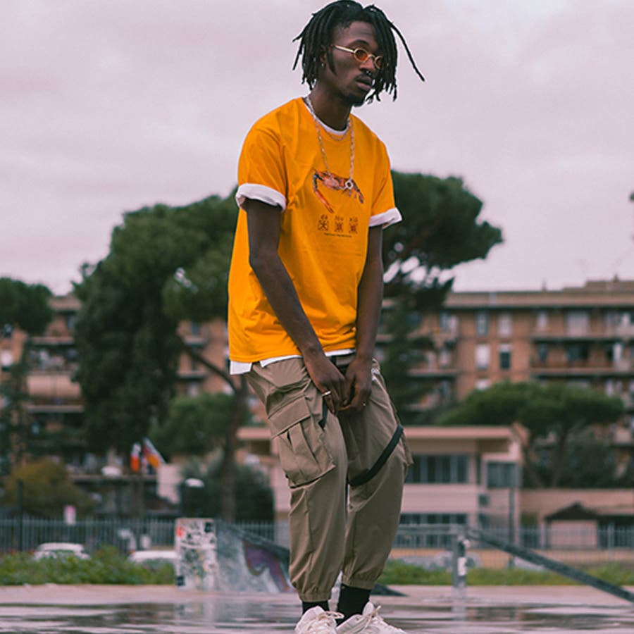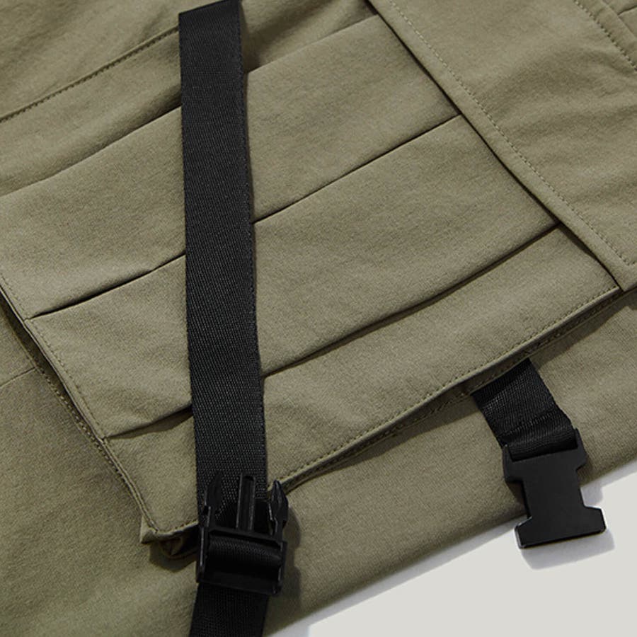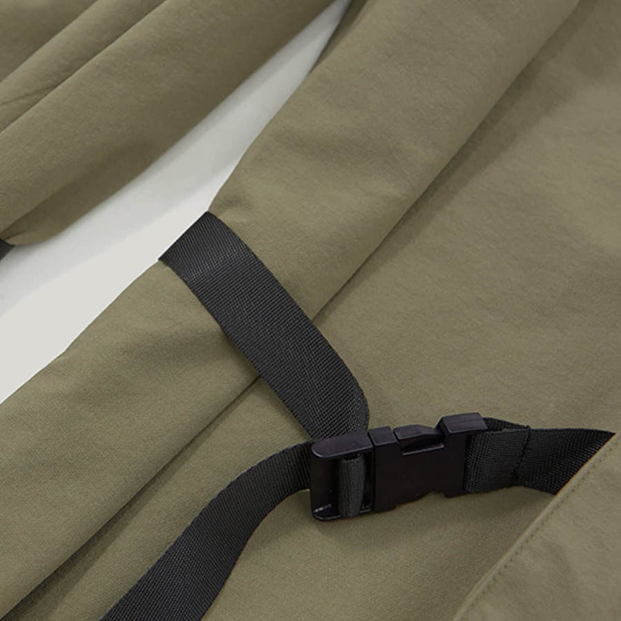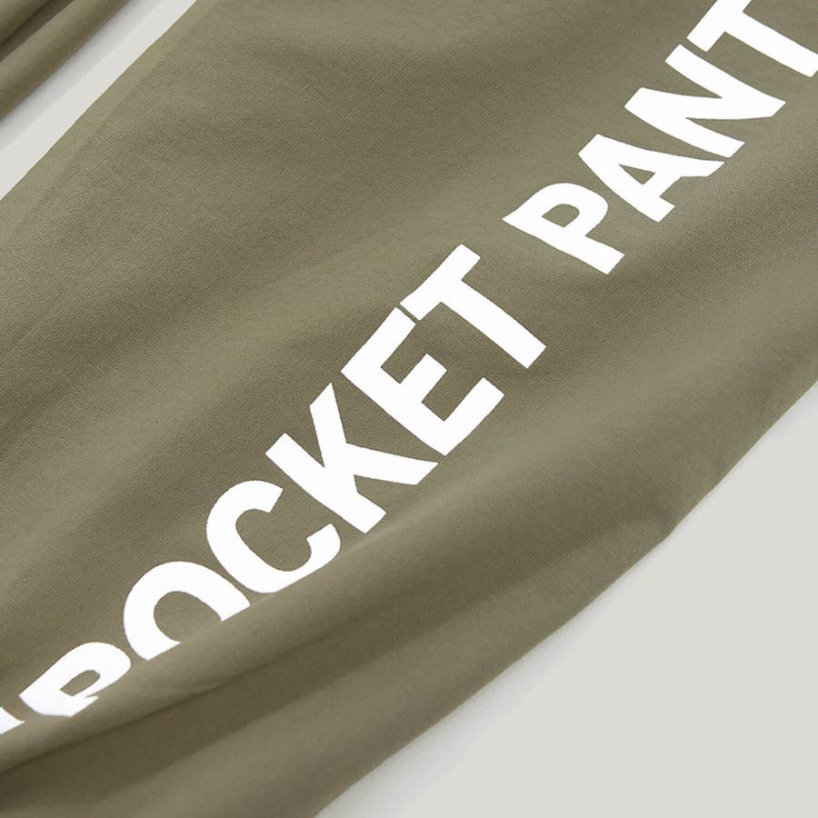 膝周りのバックルベルトがパンキッシュな雰囲気ながらも、ゆったりめのシルエットと適宜施されたタイポグラフィがストリート調の雰囲気に仕上げています。