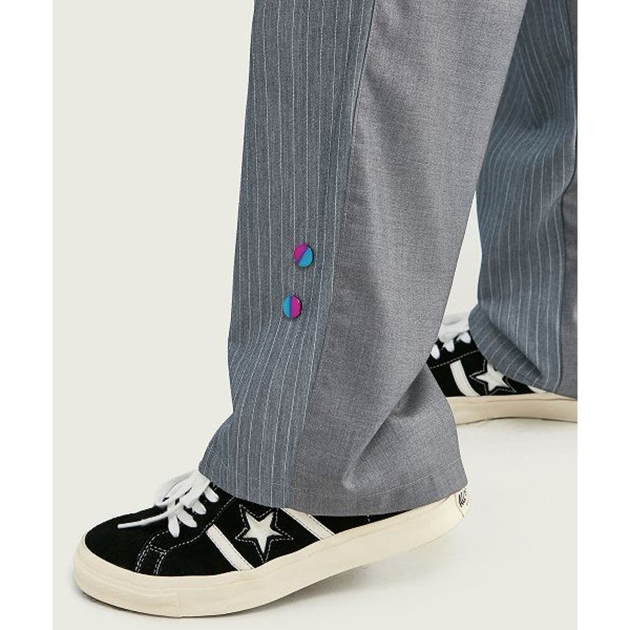 右腿のタグと左裾に施された玉虫色に光る飾りボタンがデザインのアクセントとなり、コーディネートの要として活躍が期待できるアイテムです。