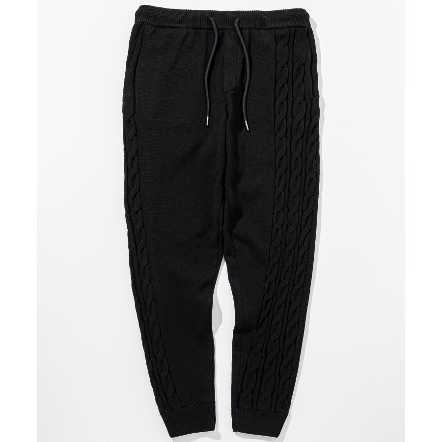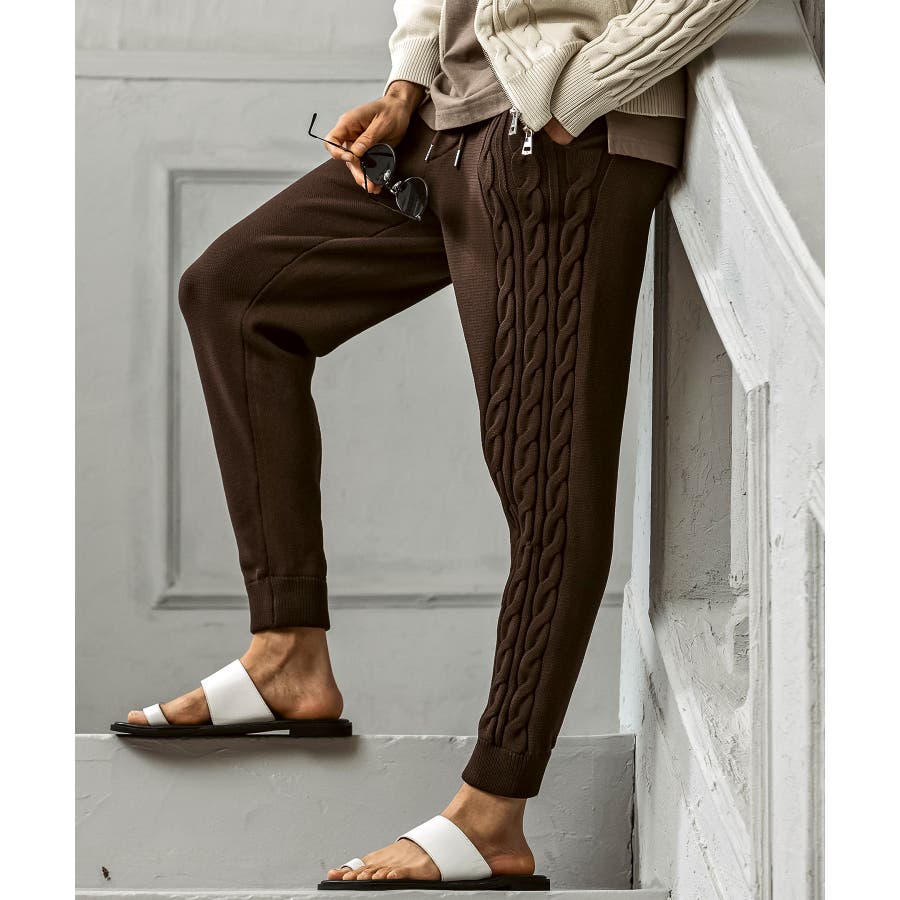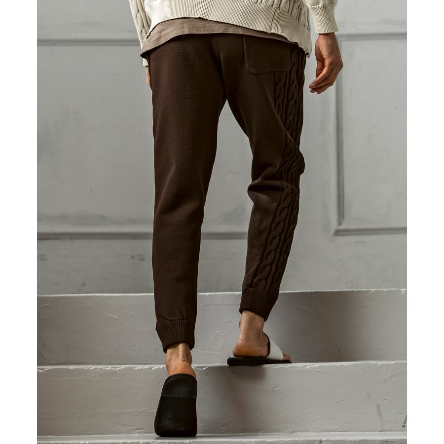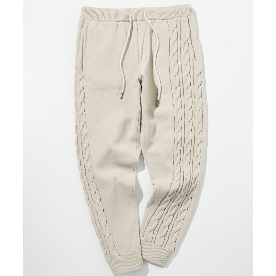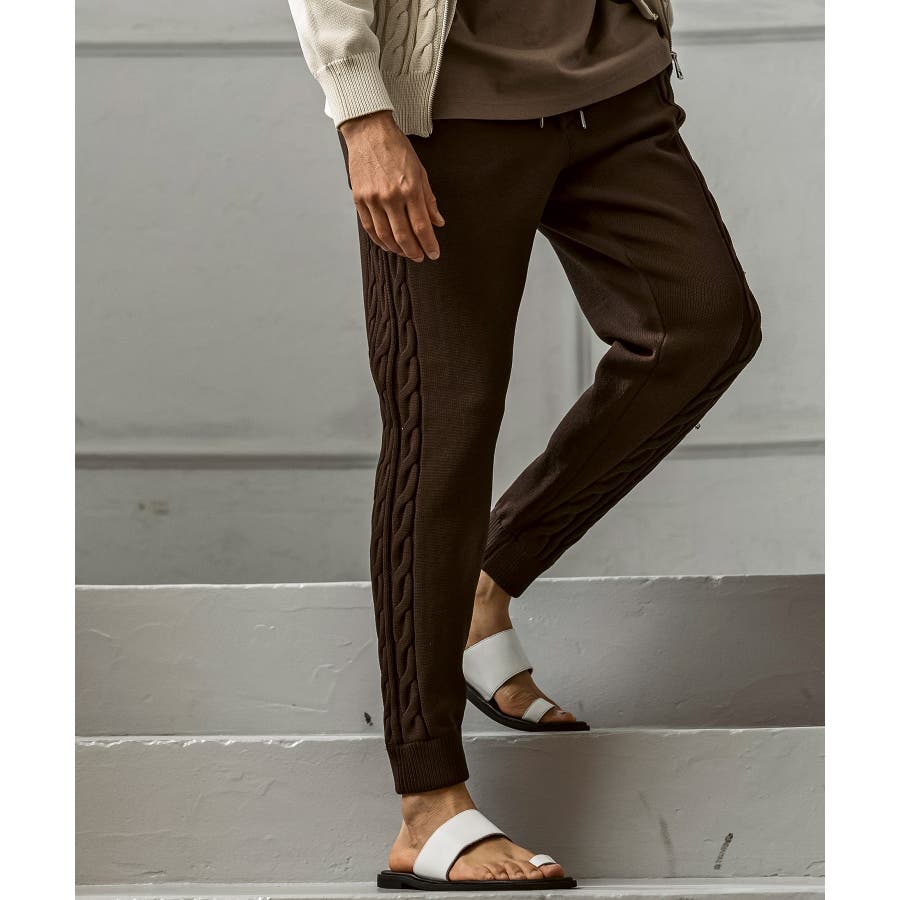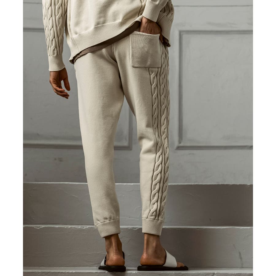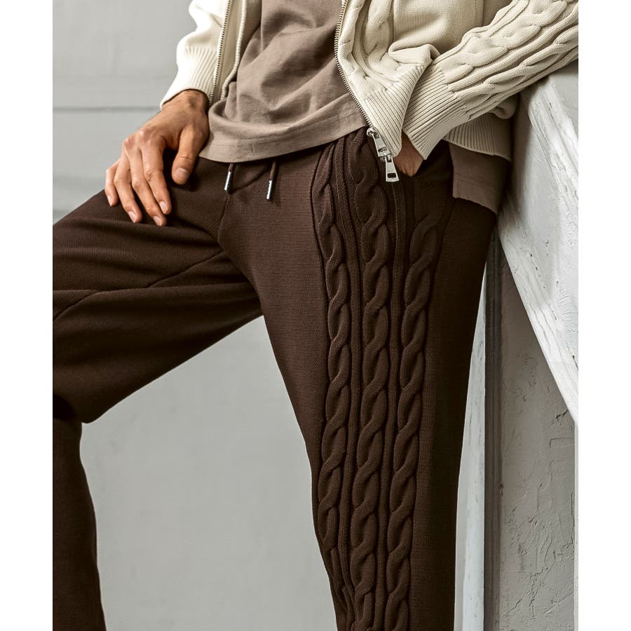 立体感のあるクレイジーパターンケーブルが目を引くニットパンツ。
