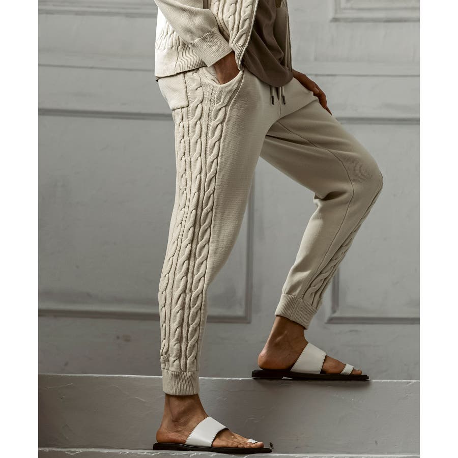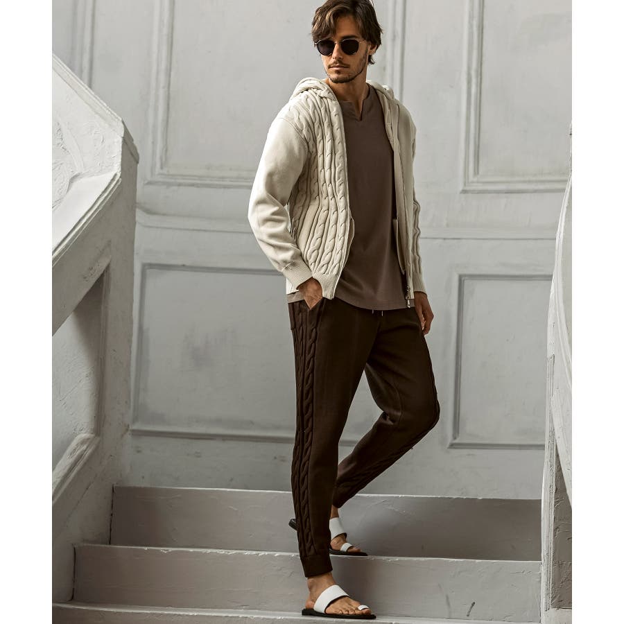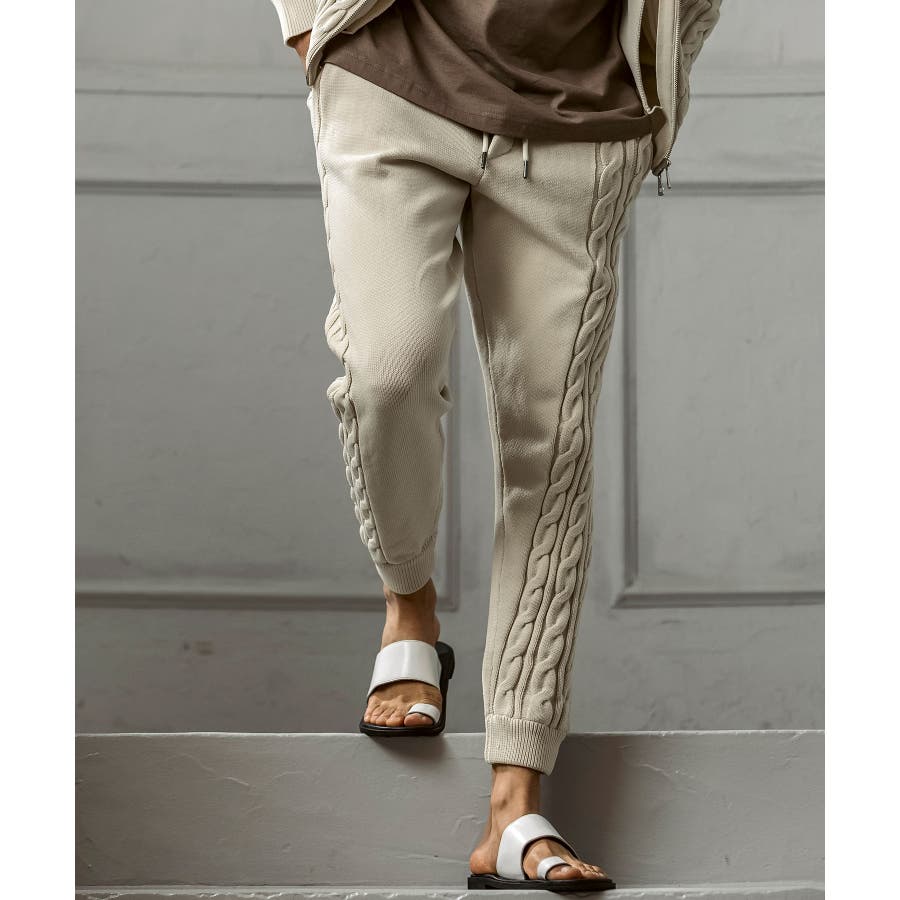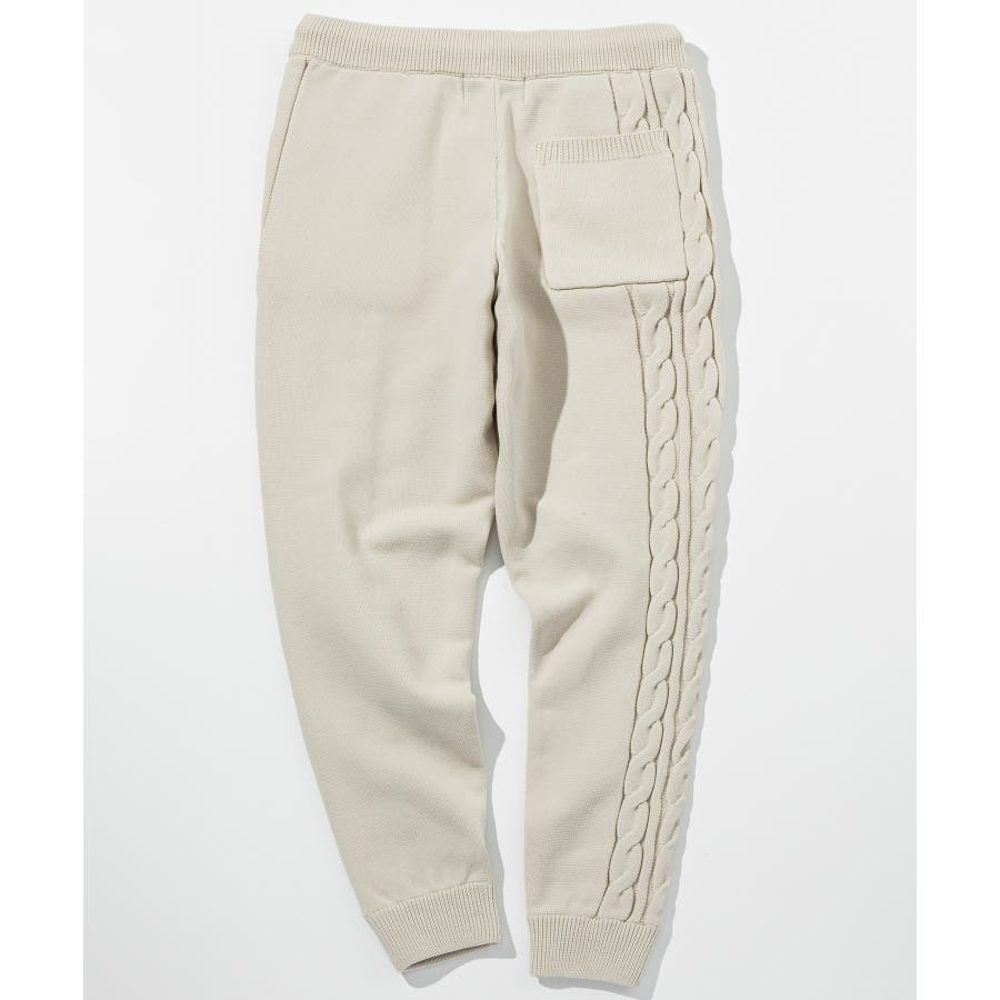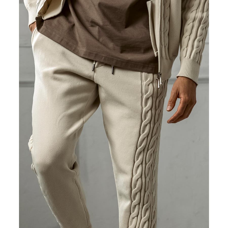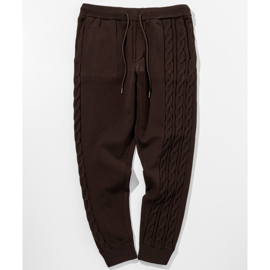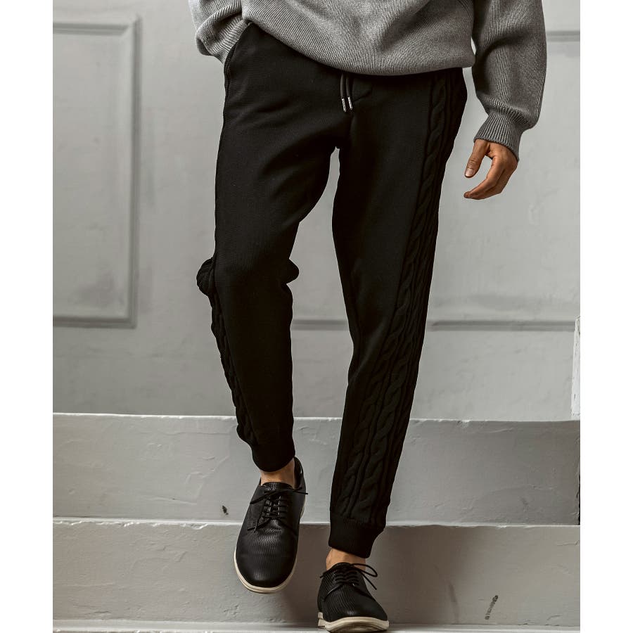 立体感のあるクレイジーパターンケーブルが目を引くニットパンツ。