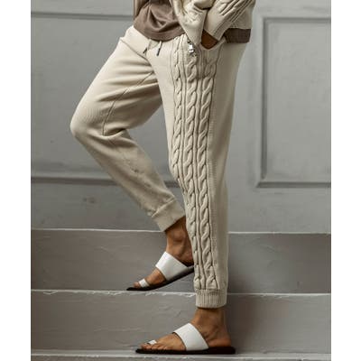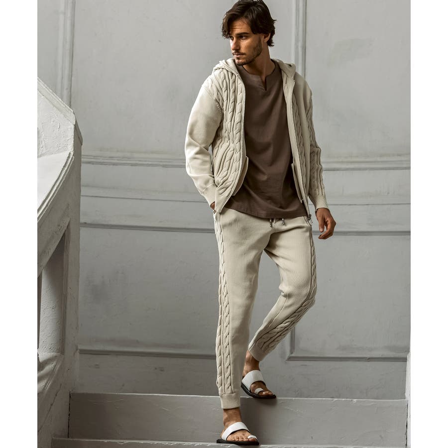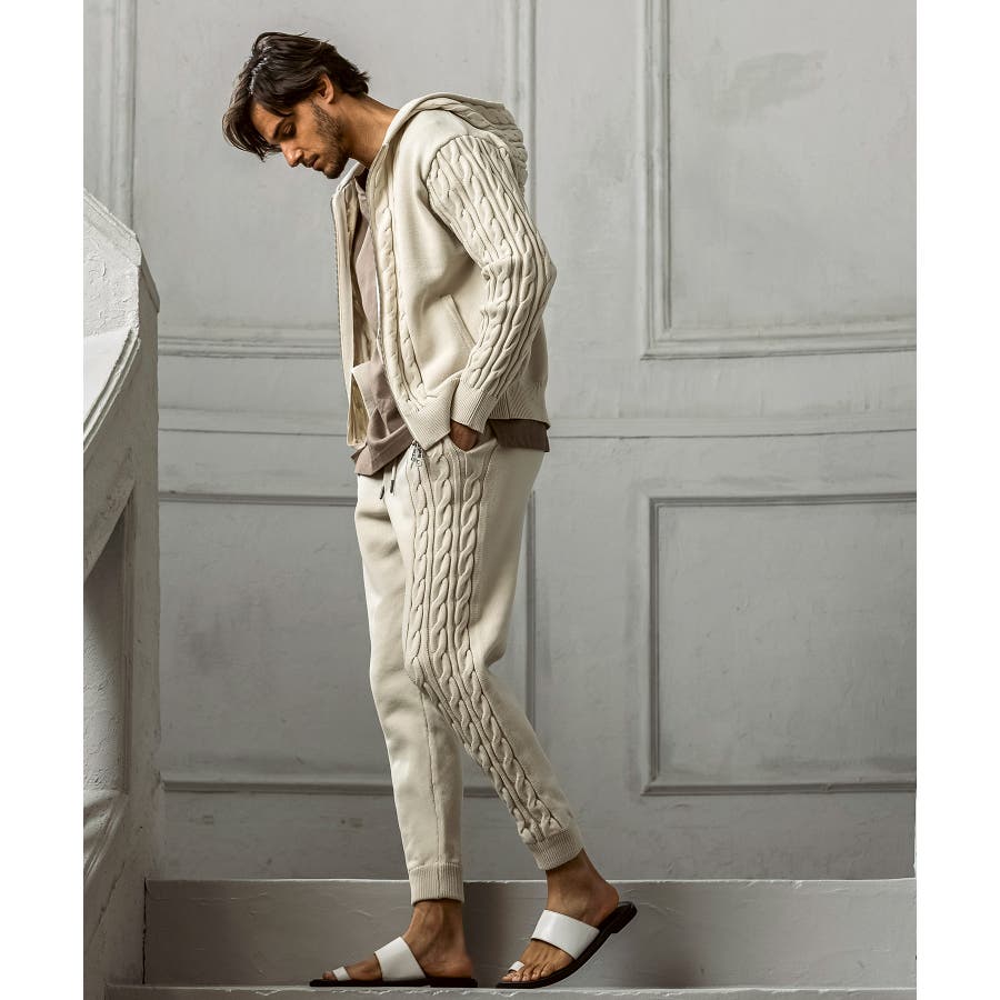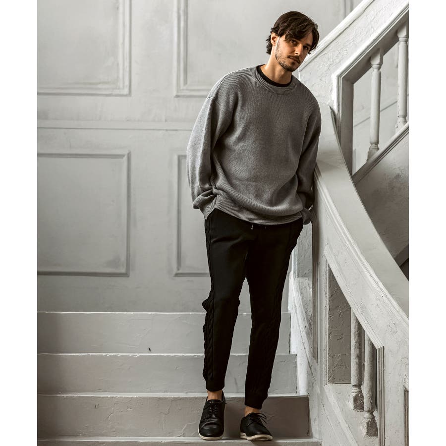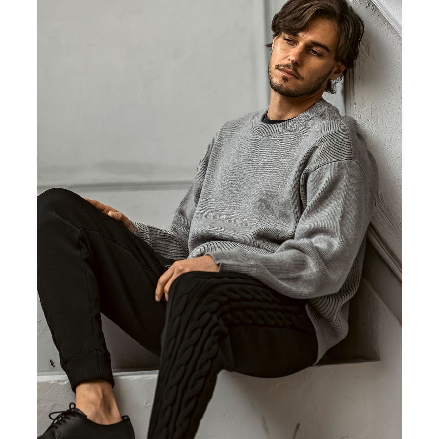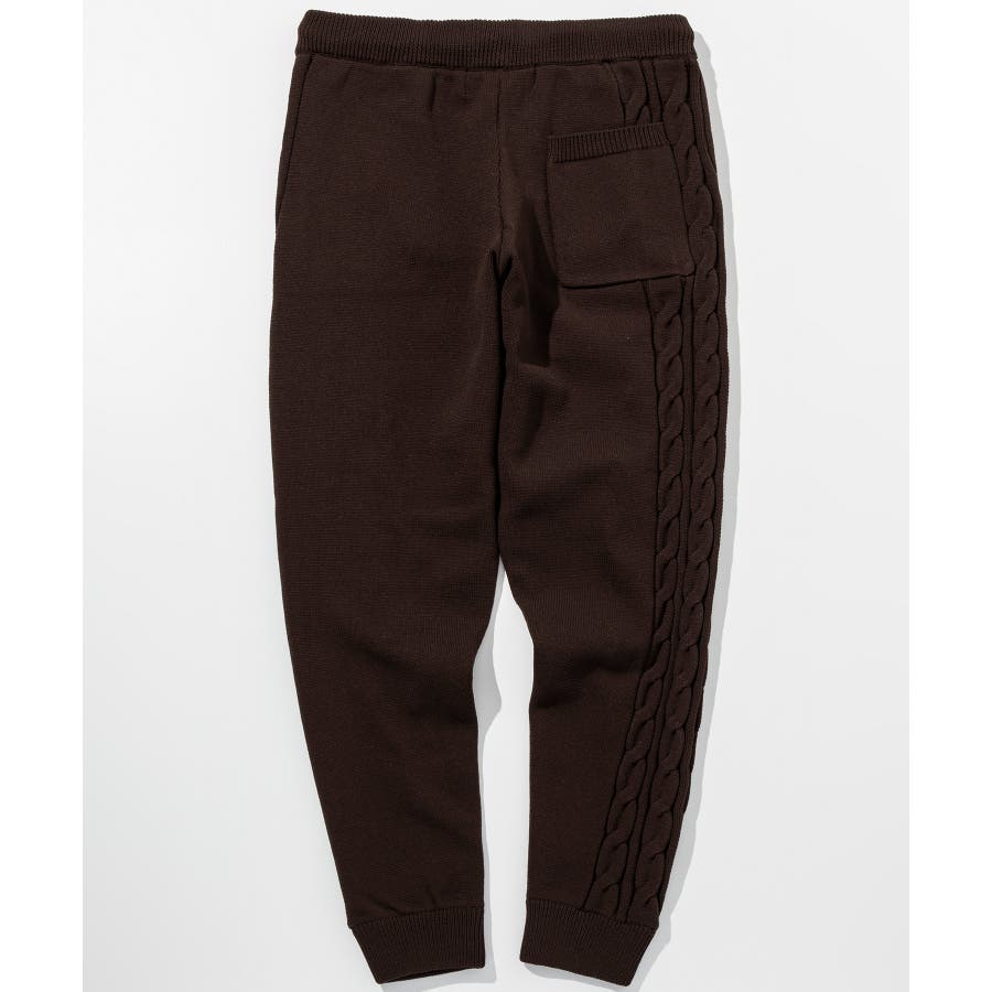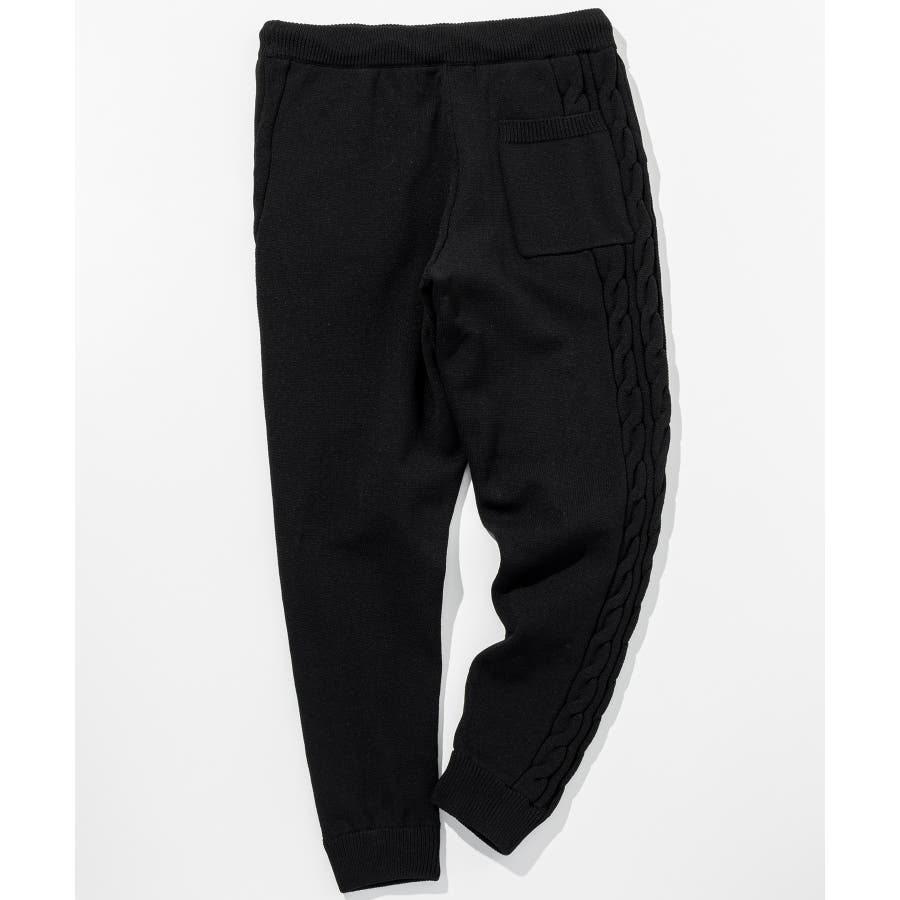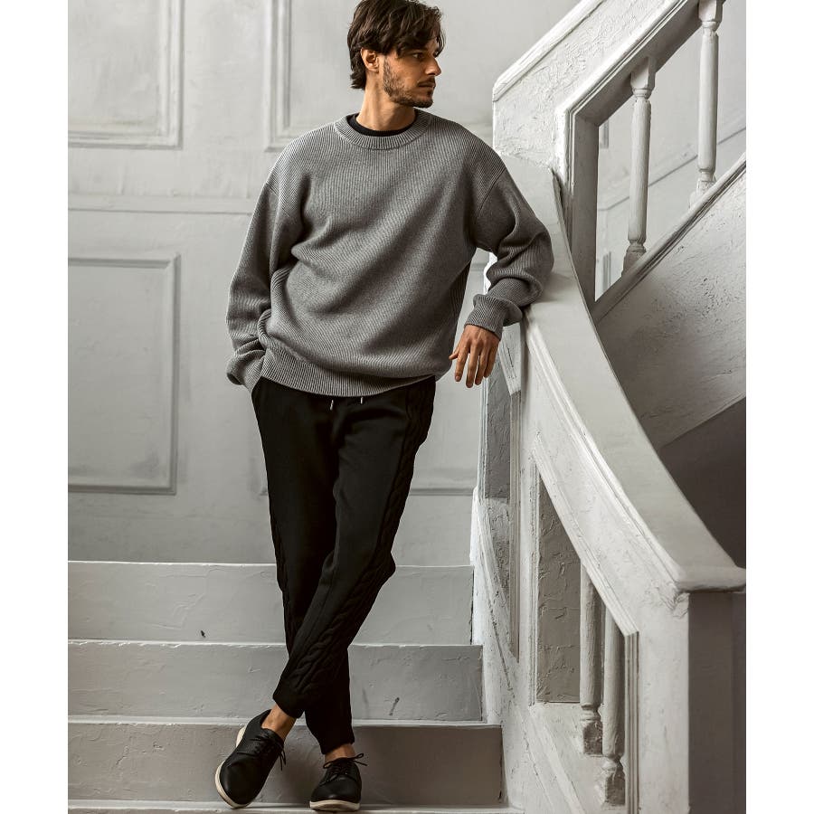立体感のあるクレイジーパターンケーブルが目を引くニットパンツ。