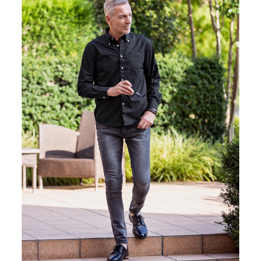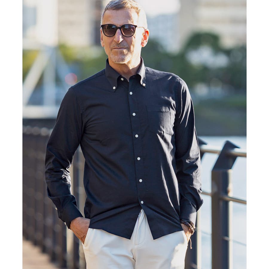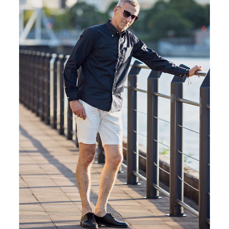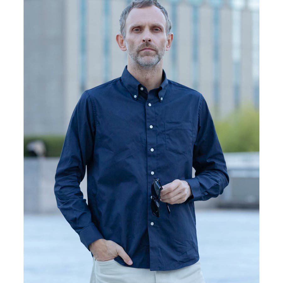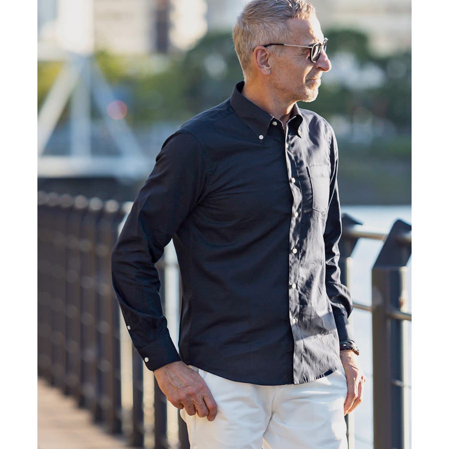 一般的にはビジネスカジュアルなイメージが強いボタンダウンシャツですが、やや細めのシルエットに加え、袖丈やシャツテールを絶妙なサイジングに設定することで、しっかりとしたアイテムでありながらも親しみやすい雰囲気を生み出してくれます。