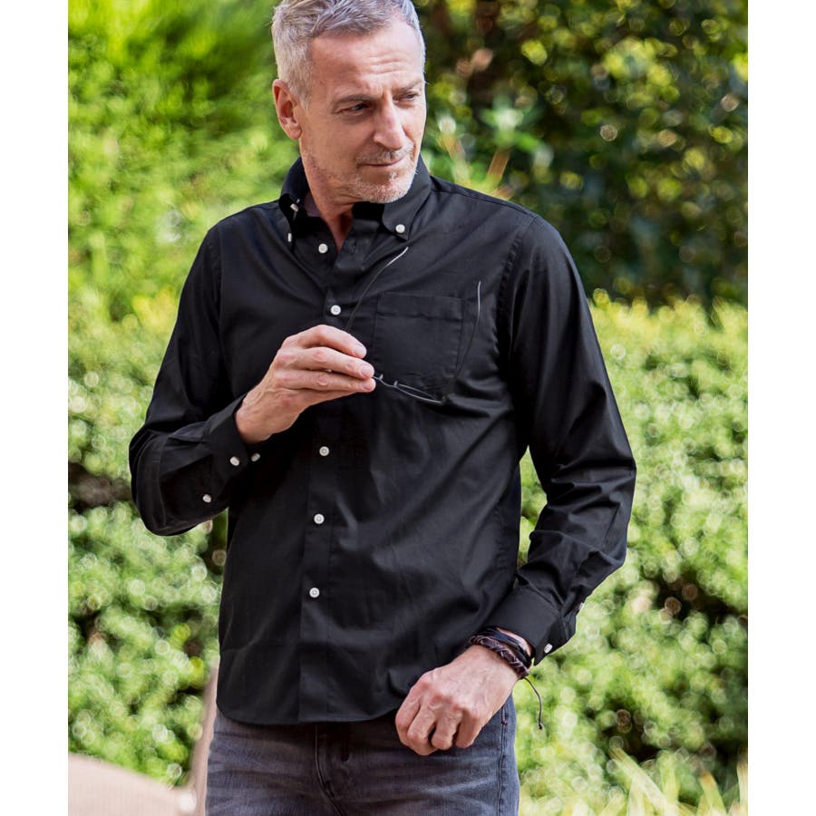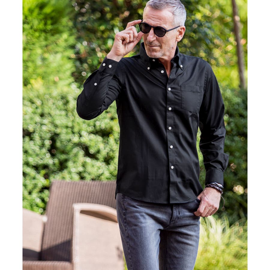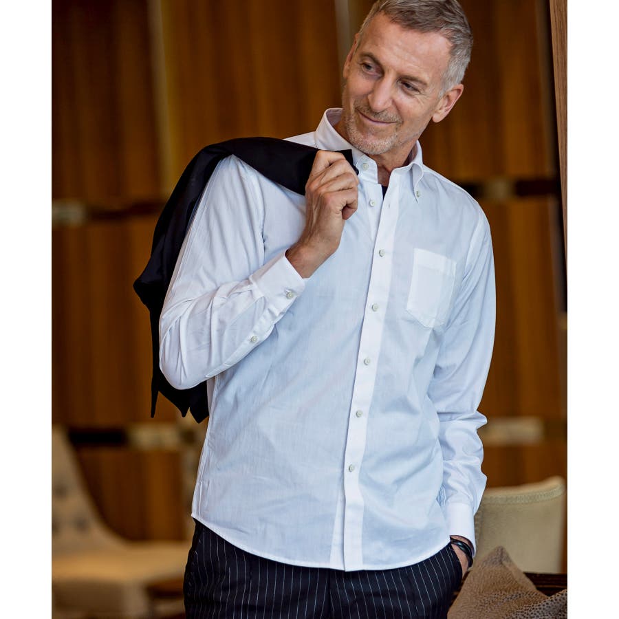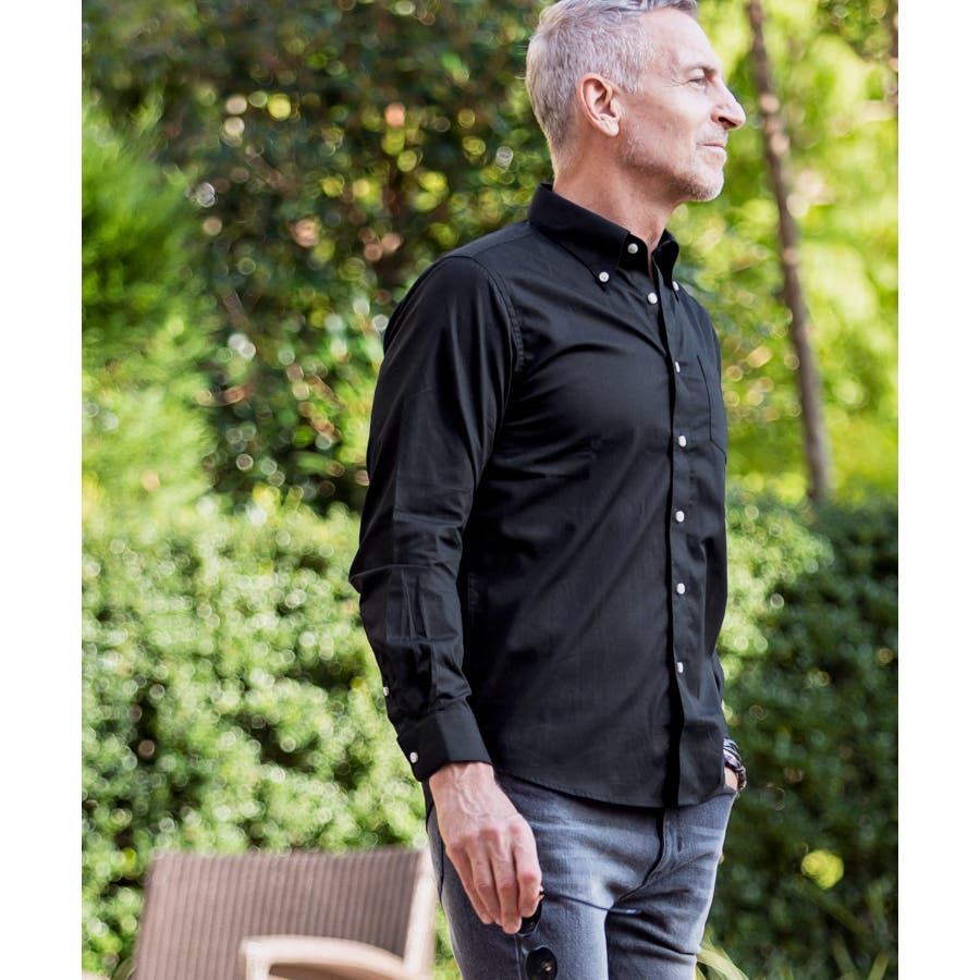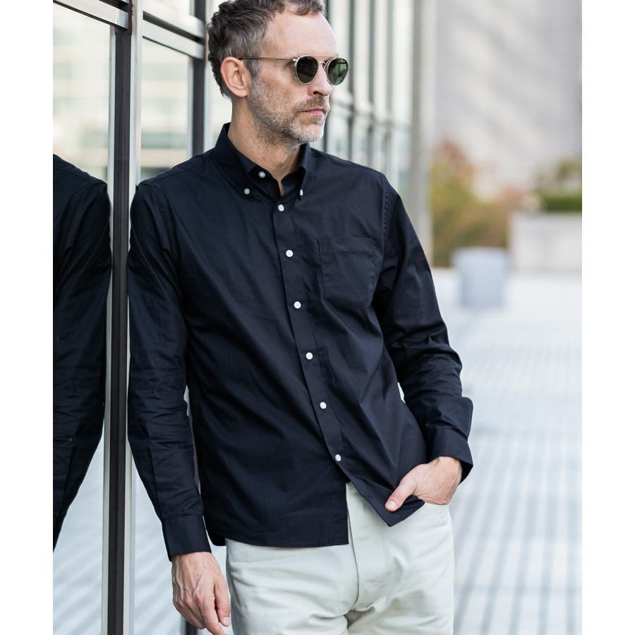 一般的にはビジネスカジュアルなイメージが強いボタンダウンシャツですが、やや細めのシルエットに加え、袖丈やシャツテールを絶妙なサイジングに設定することで、しっかりとしたアイテムでありながらも親しみやすい雰囲気を生み出してくれます。