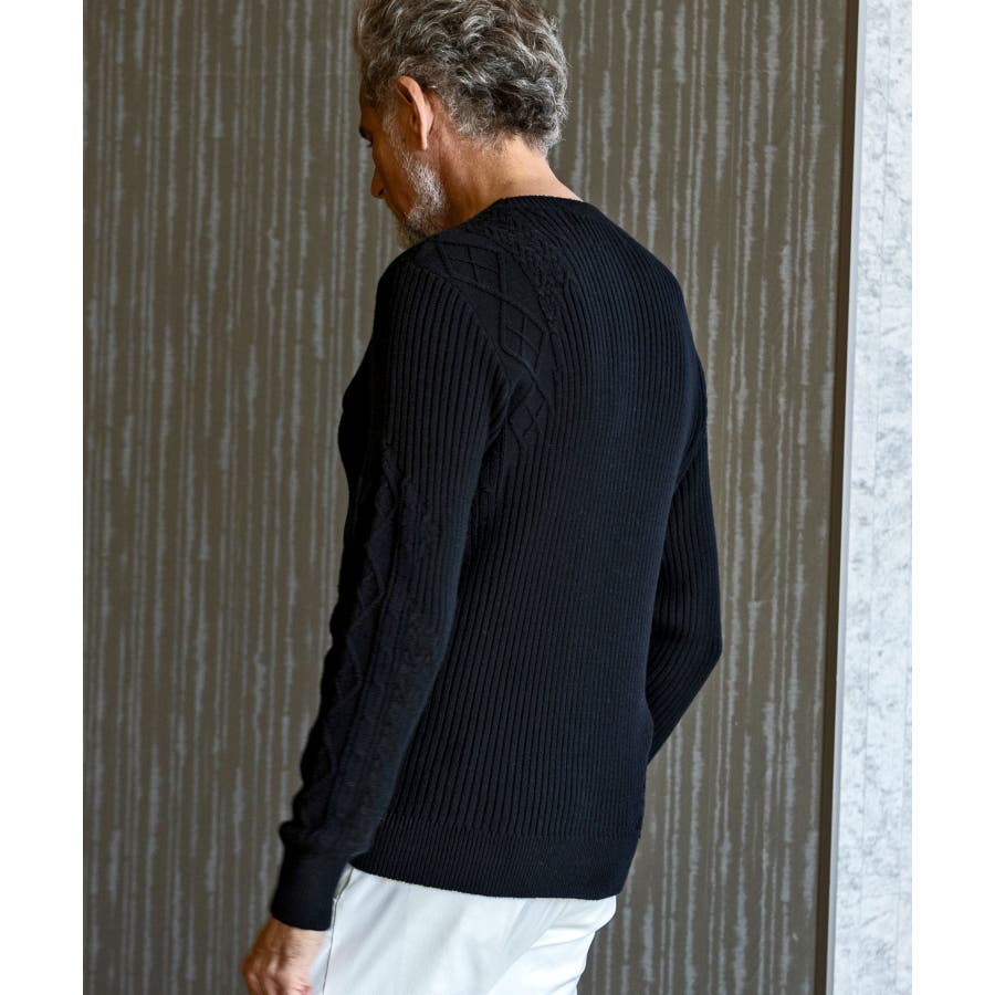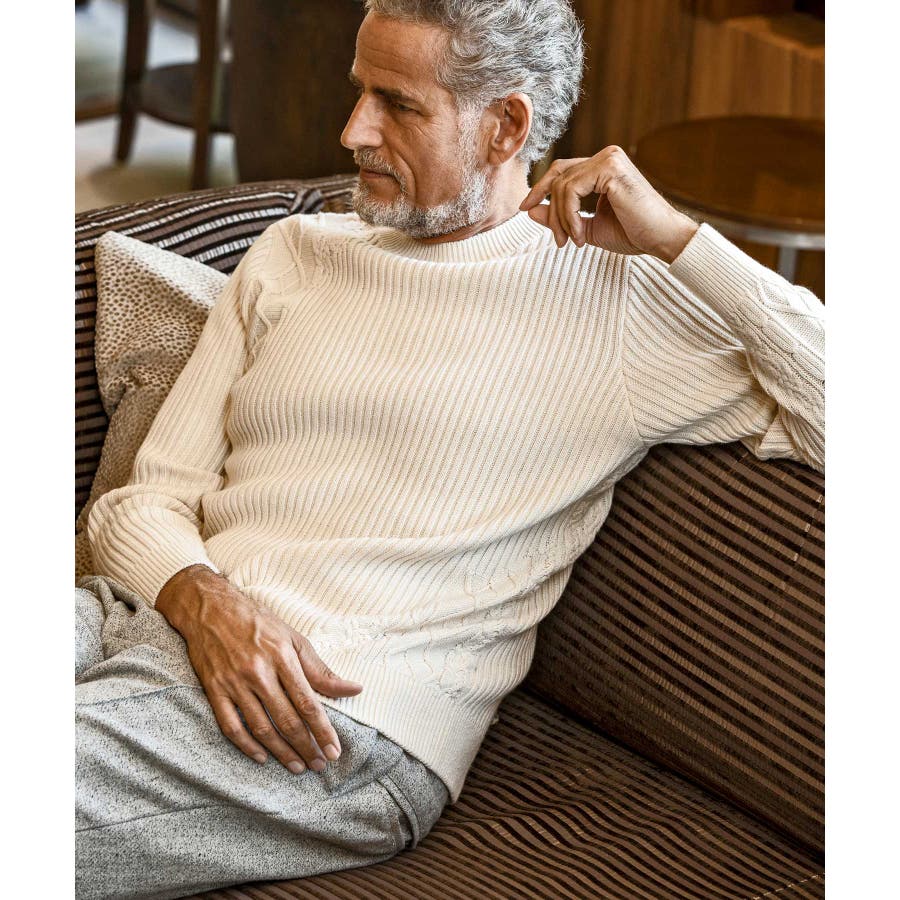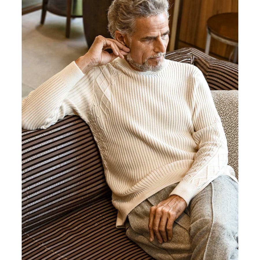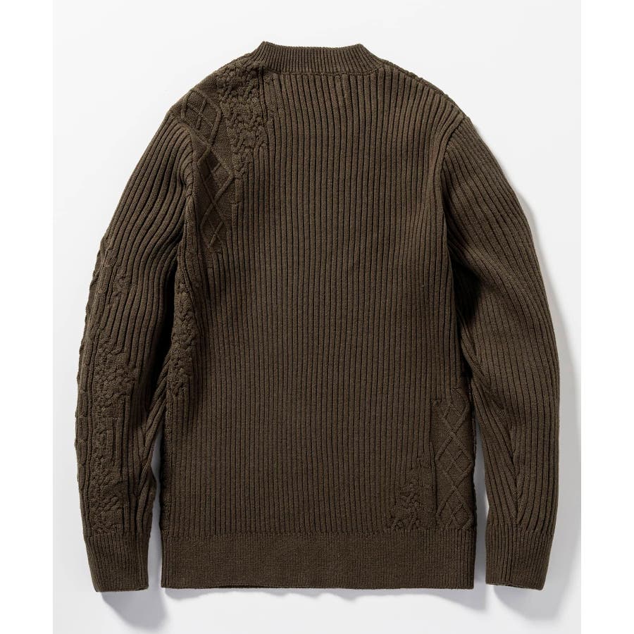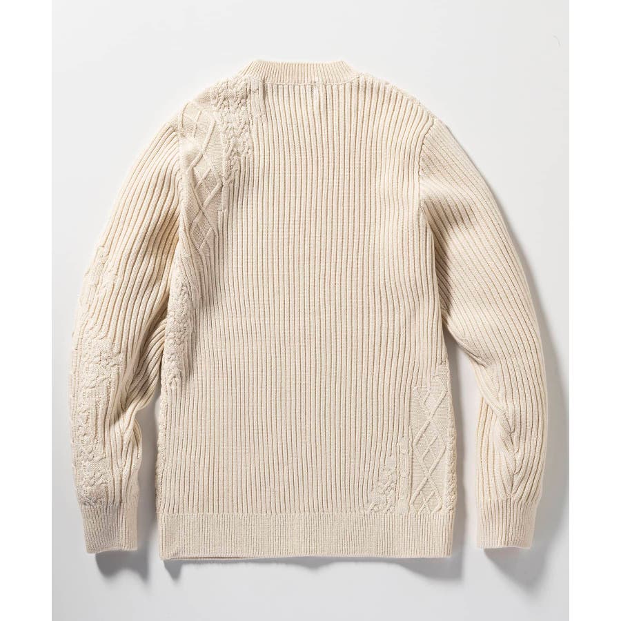 シンプルな畦編みと表情豊かなアラン柄の切り替えによるブロッキングデザインが、アイテムに立体感を生み出し、大人の遊び心をくすぐる逸品に仕上がりました。