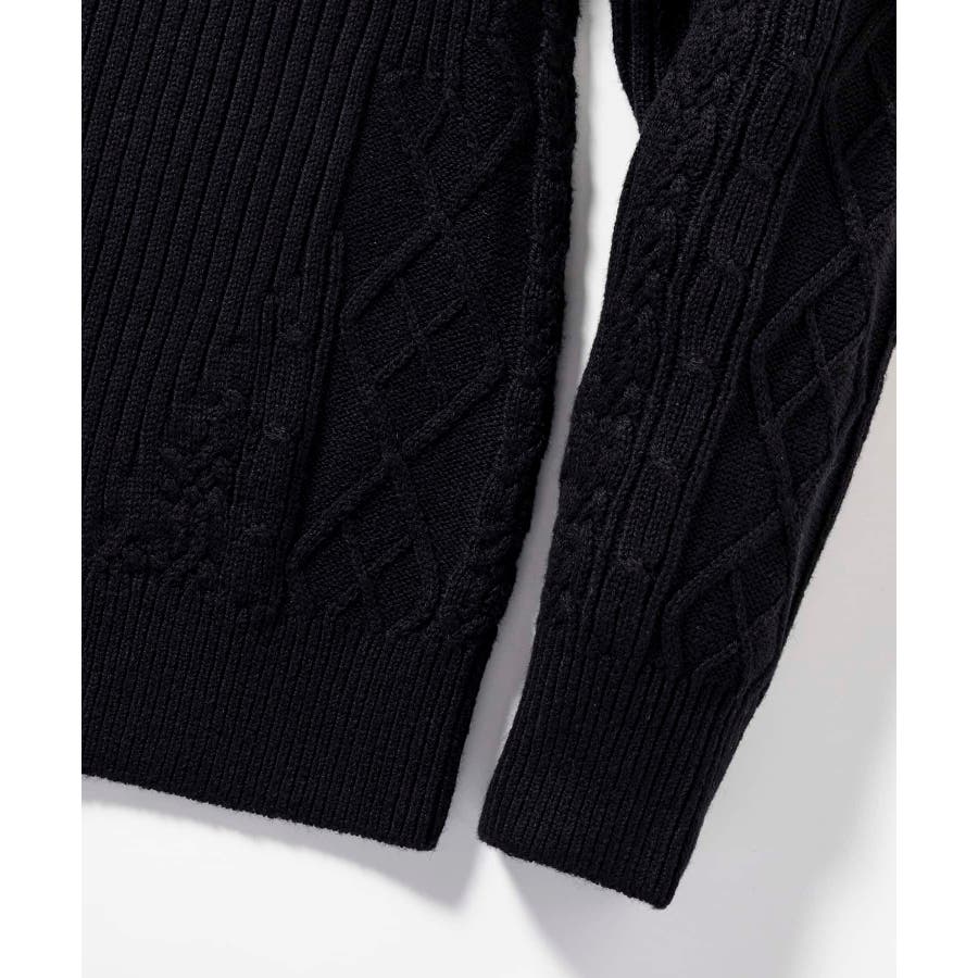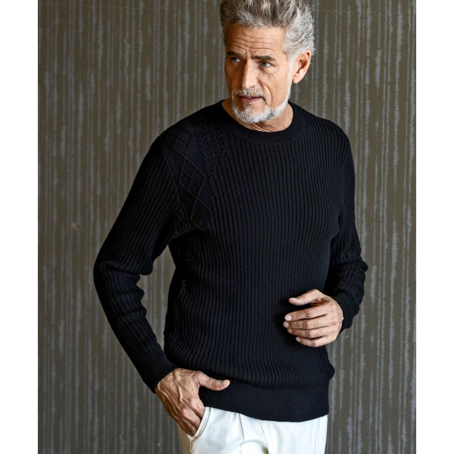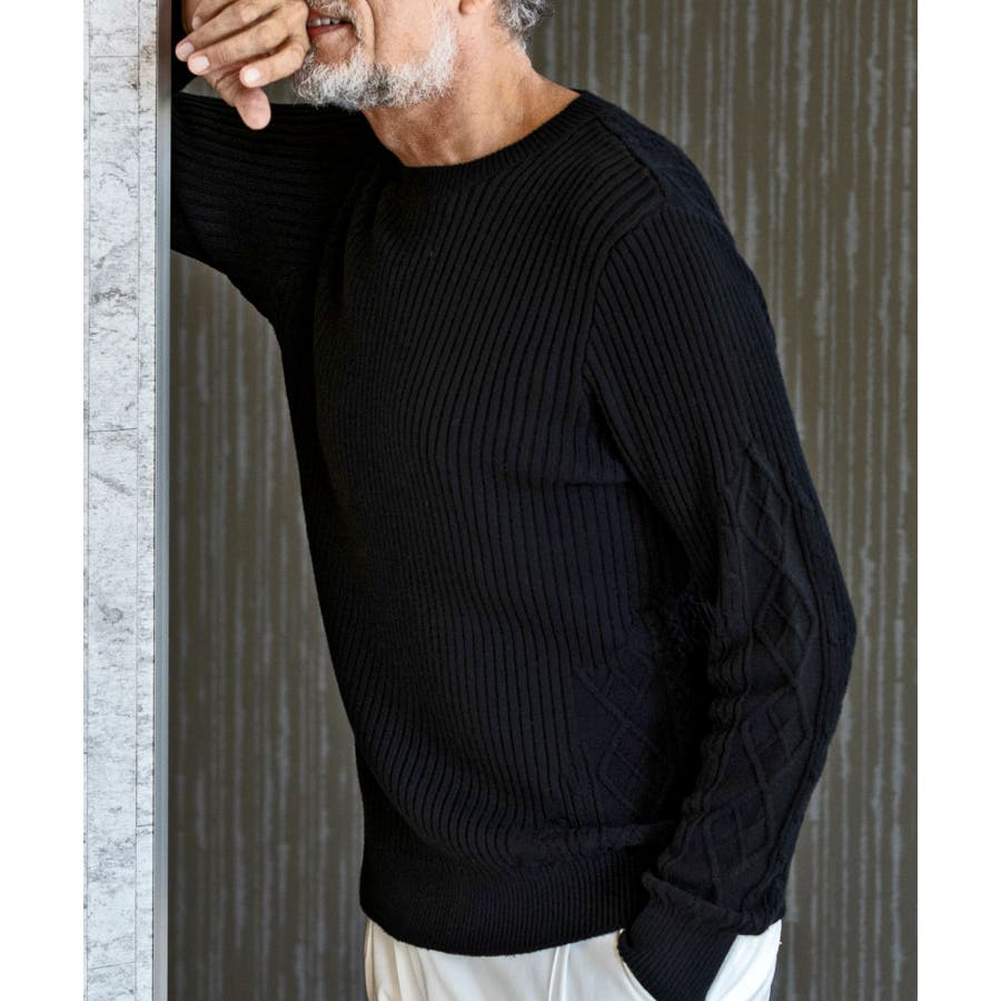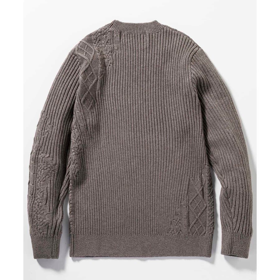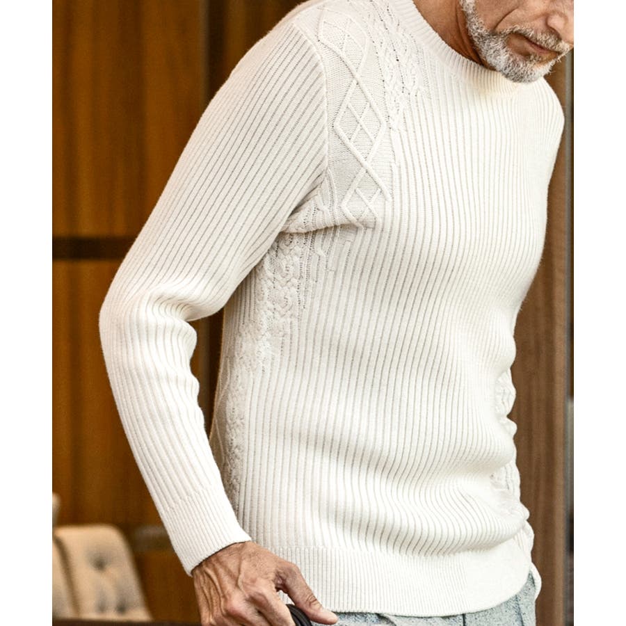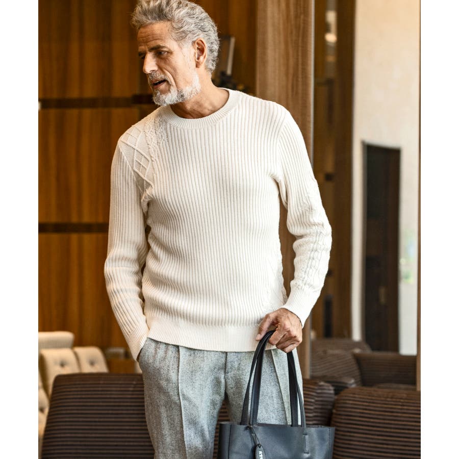 シンプルな畦編みと表情豊かなアラン柄の切り替えによるブロッキングデザインが、アイテムに立体感を生み出し、大人の遊び心をくすぐる逸品に仕上がりました。