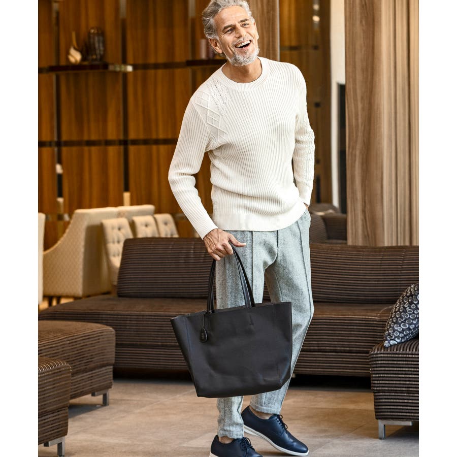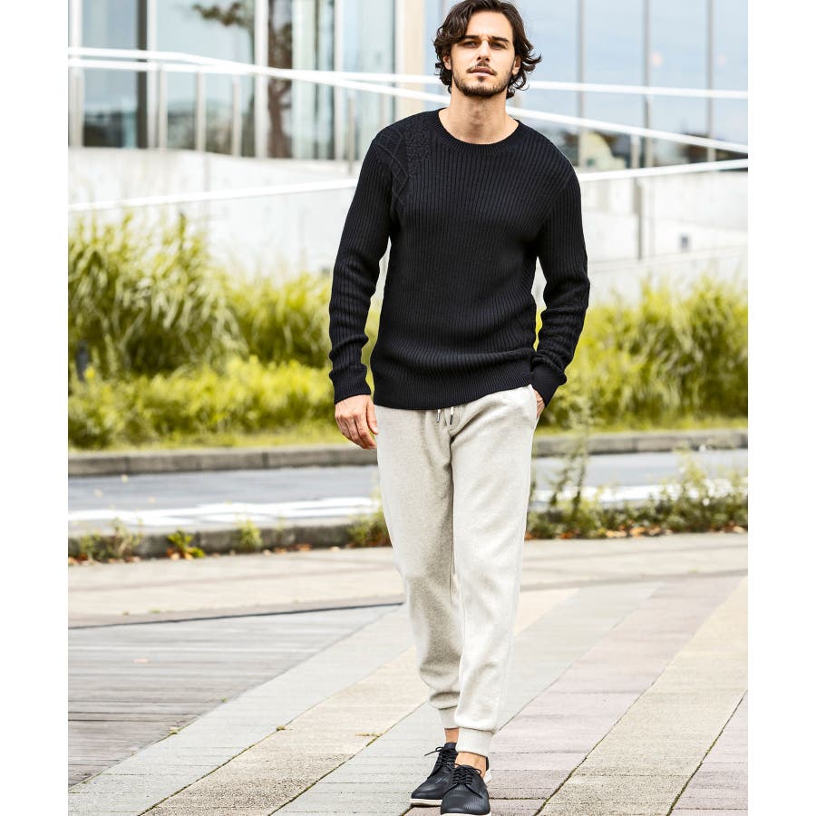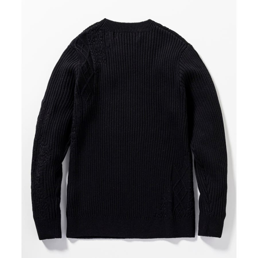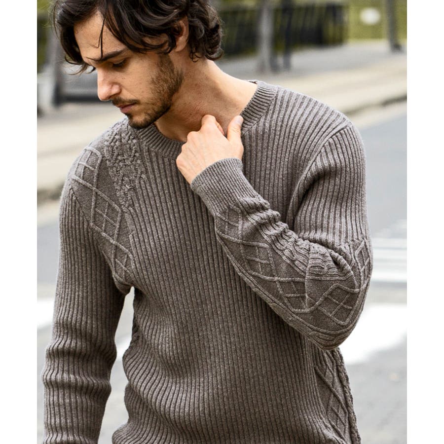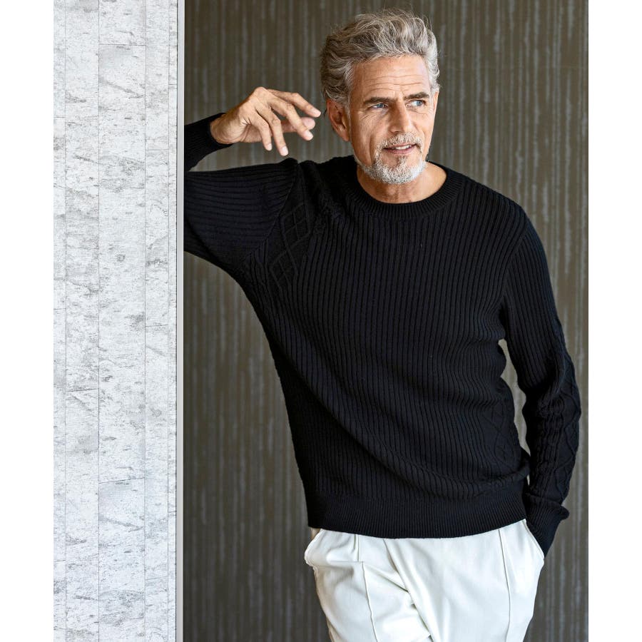 シンプルな畦編みと表情豊かなアラン柄の切り替えによるブロッキングデザインが、アイテムに立体感を生み出し、大人の遊び心をくすぐる逸品に仕上がりました。