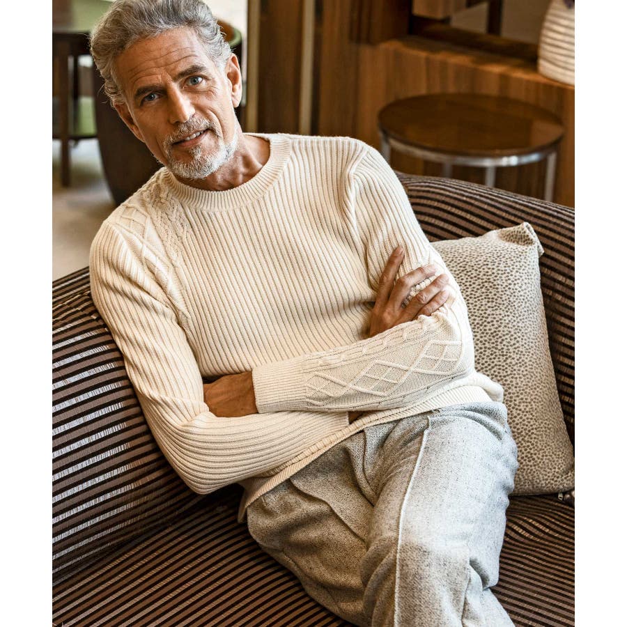 上質なコットンをベースに、やわらかな風合いと艶感をもつカシミヤをブレンドしたクオリティの高さが感じられるニット。