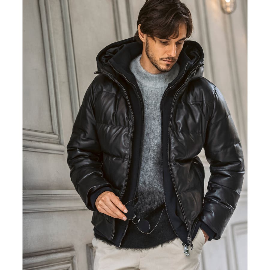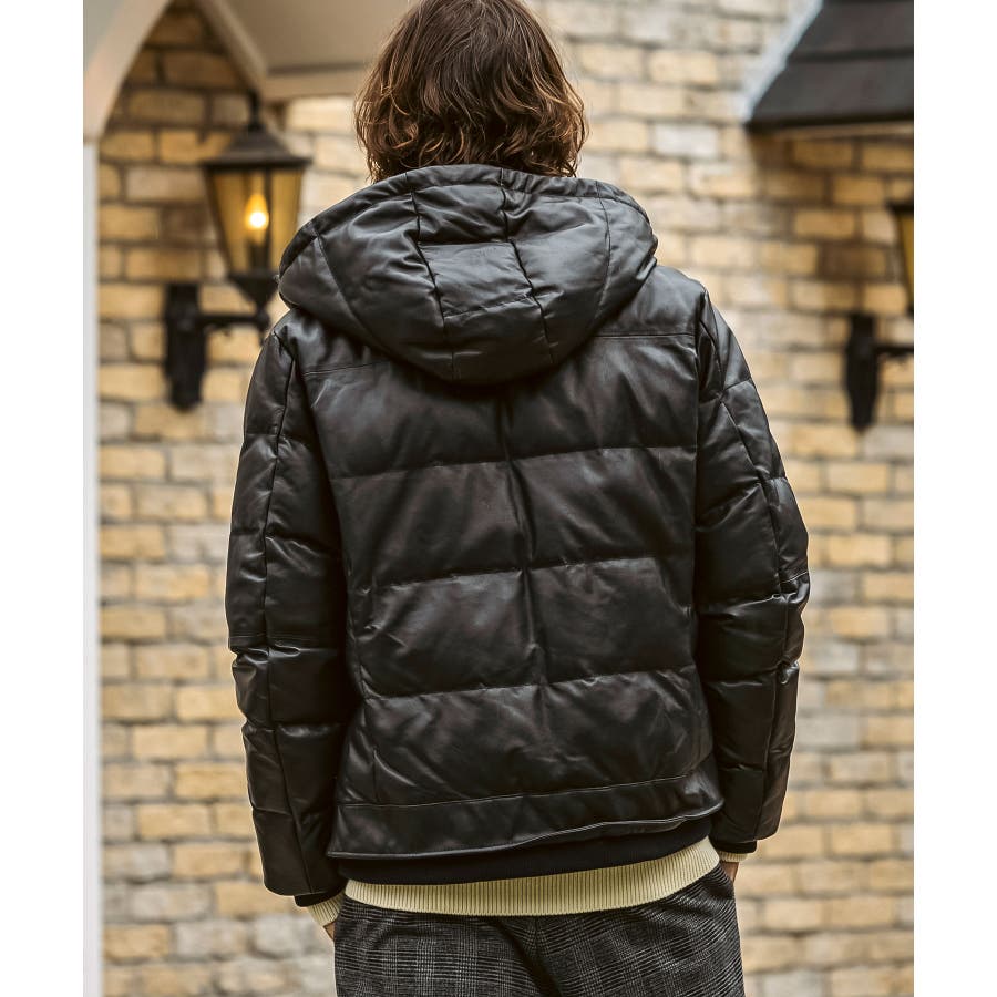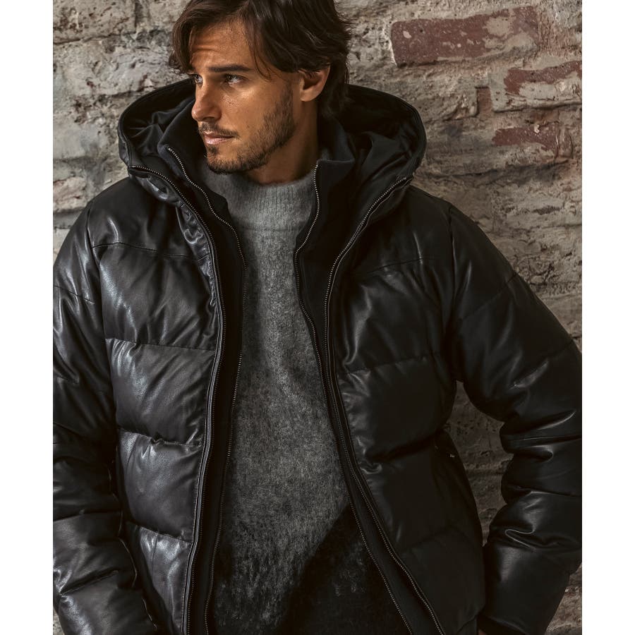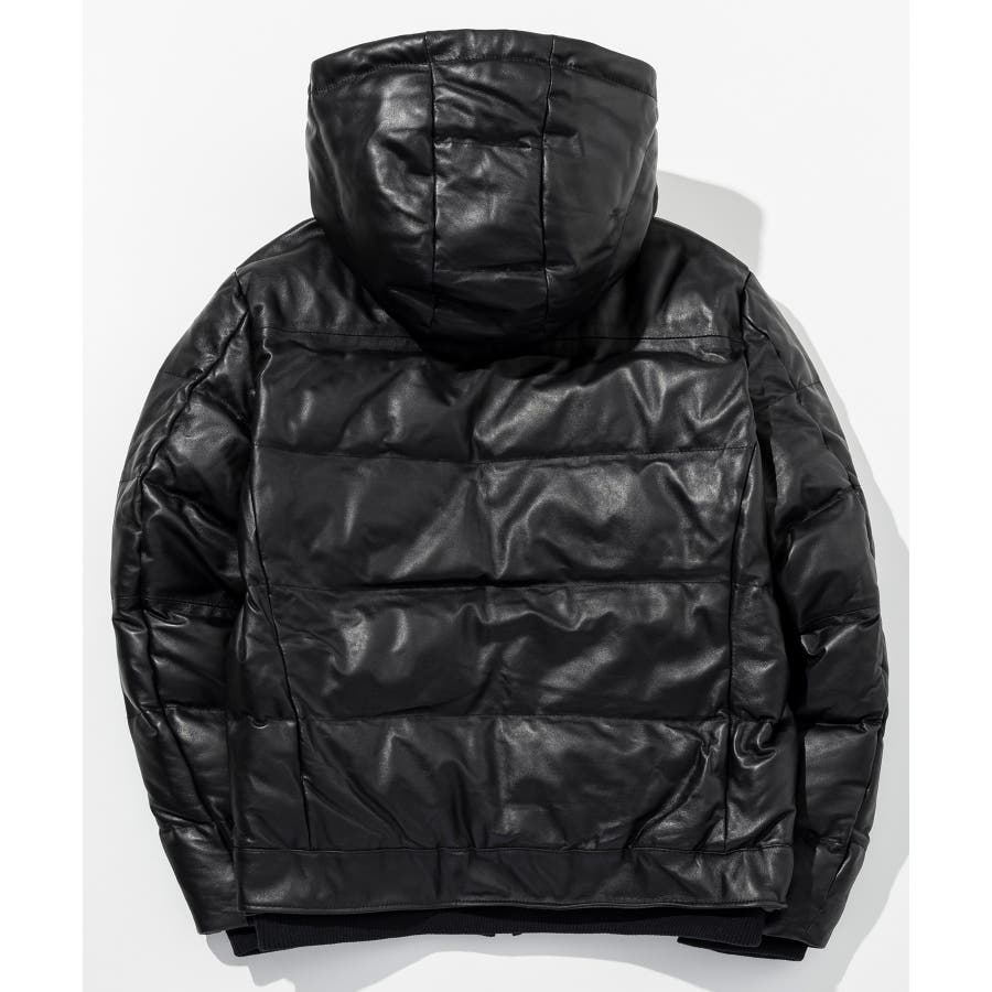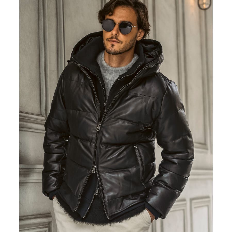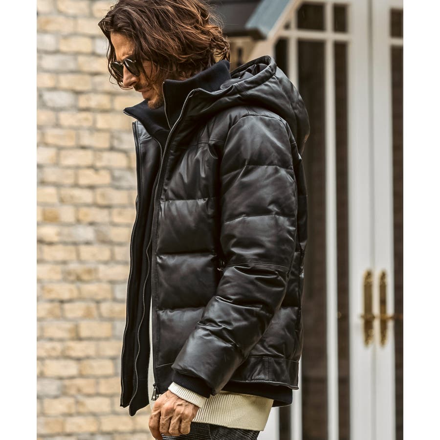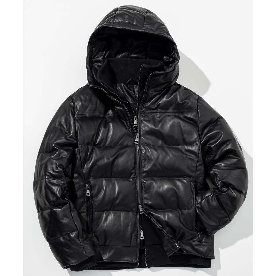 キルティングによって無骨なレザーに艶と軽やかさを宿した、フード付きレザーダウンジャケット。
