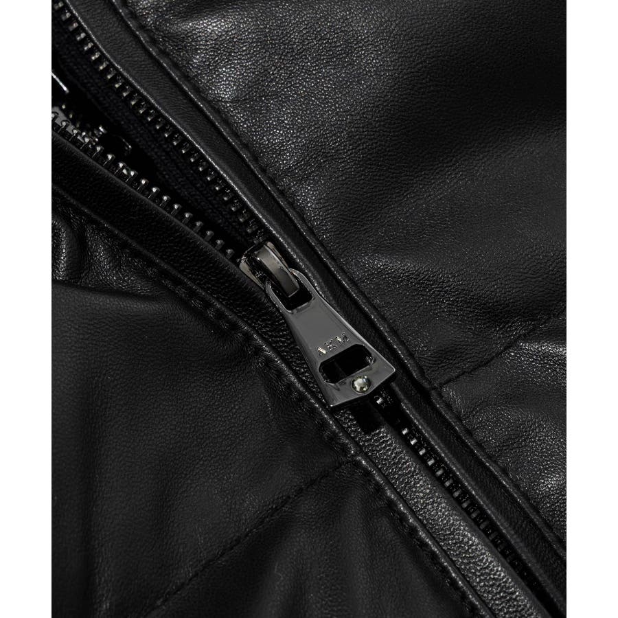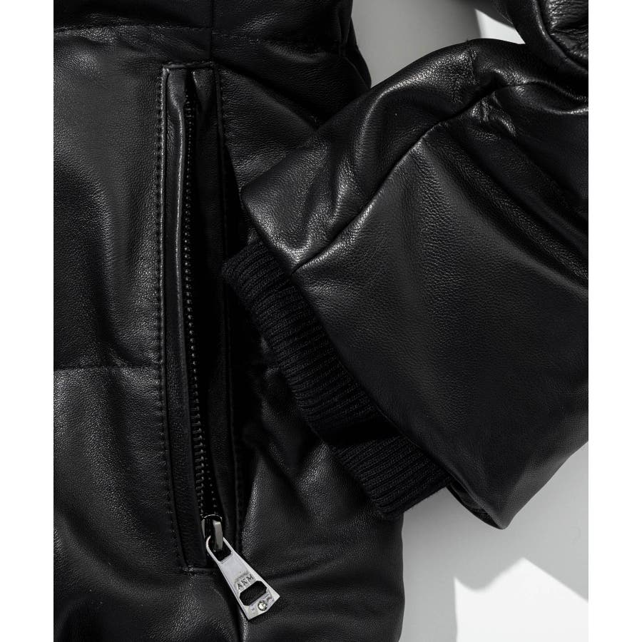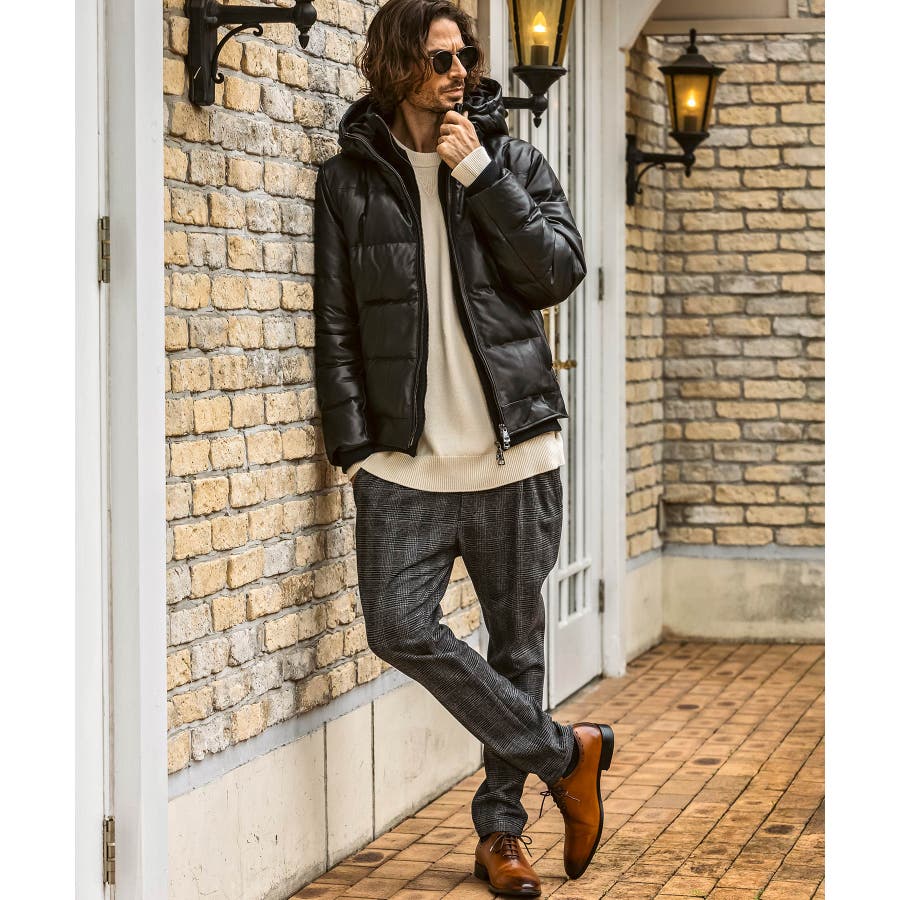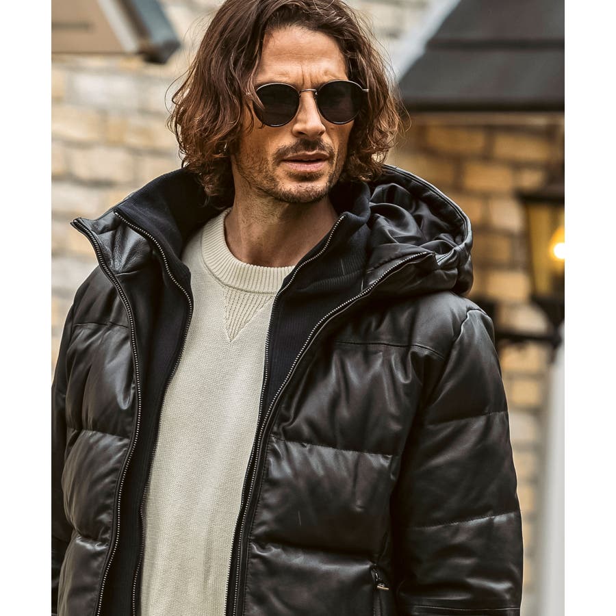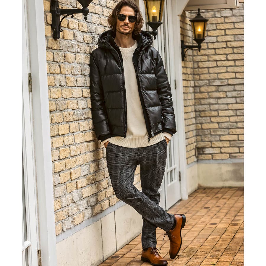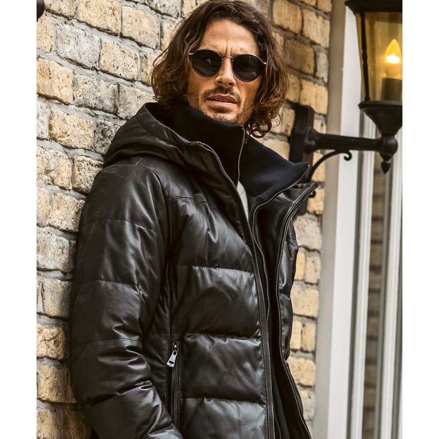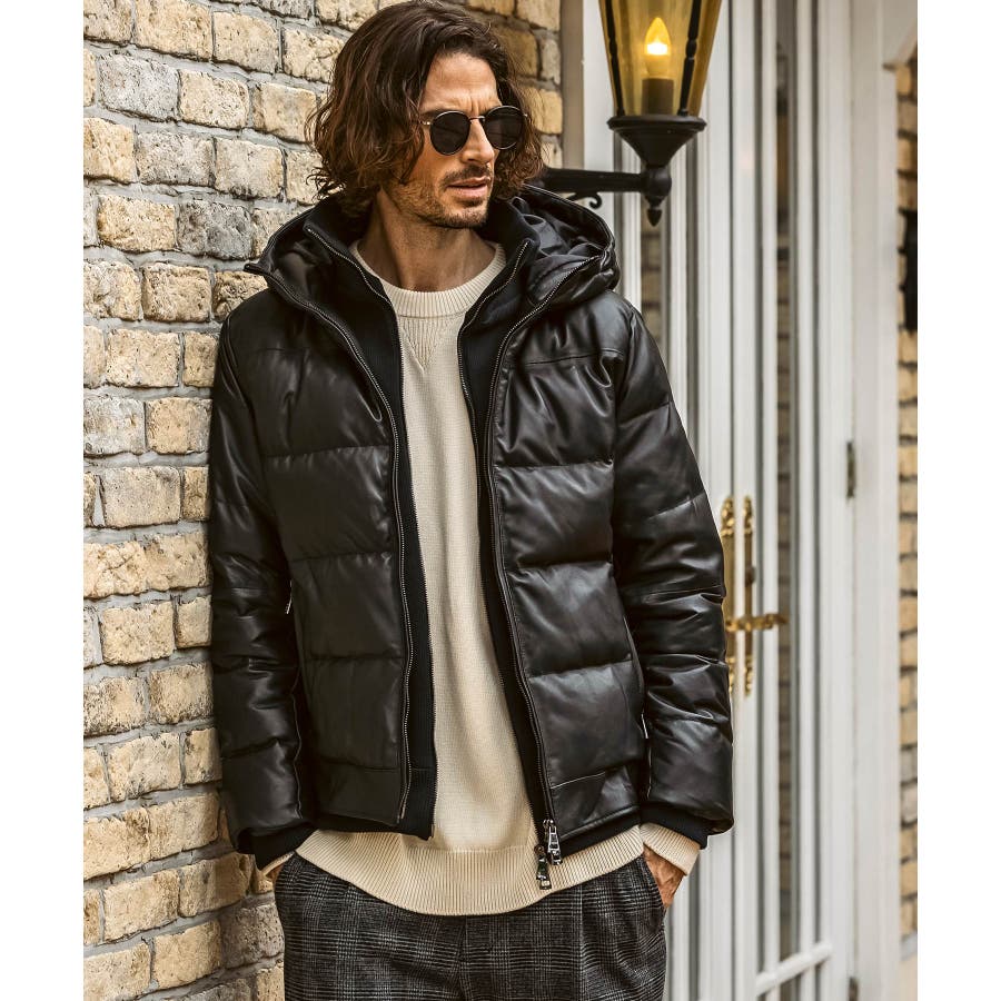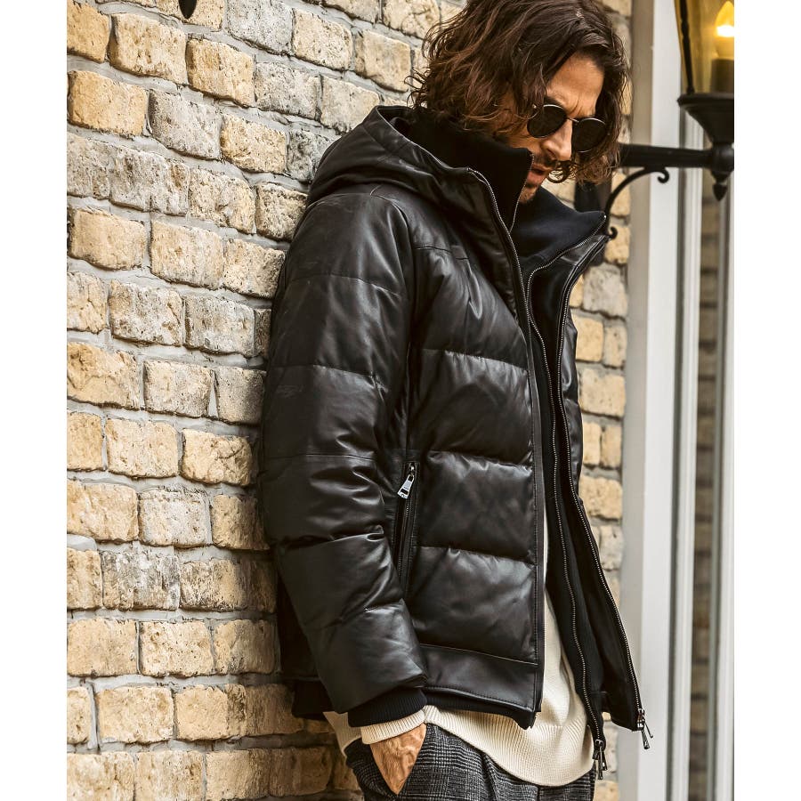 キルティングによって無骨なレザーに艶と軽やかさを宿した、フード付きレザーダウンジャケット。