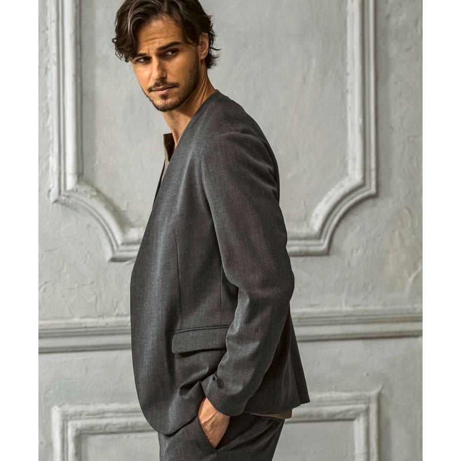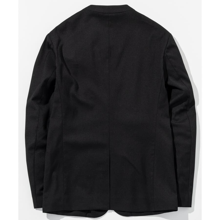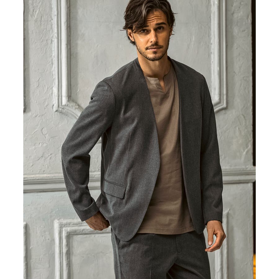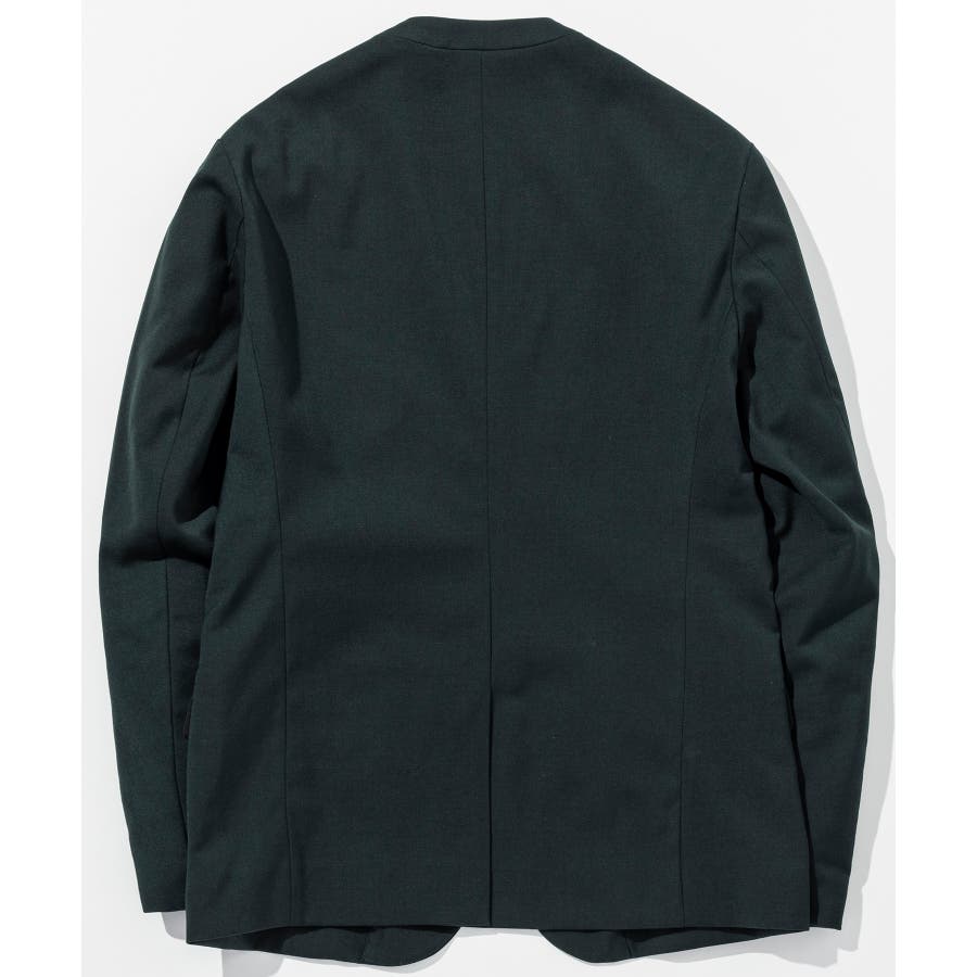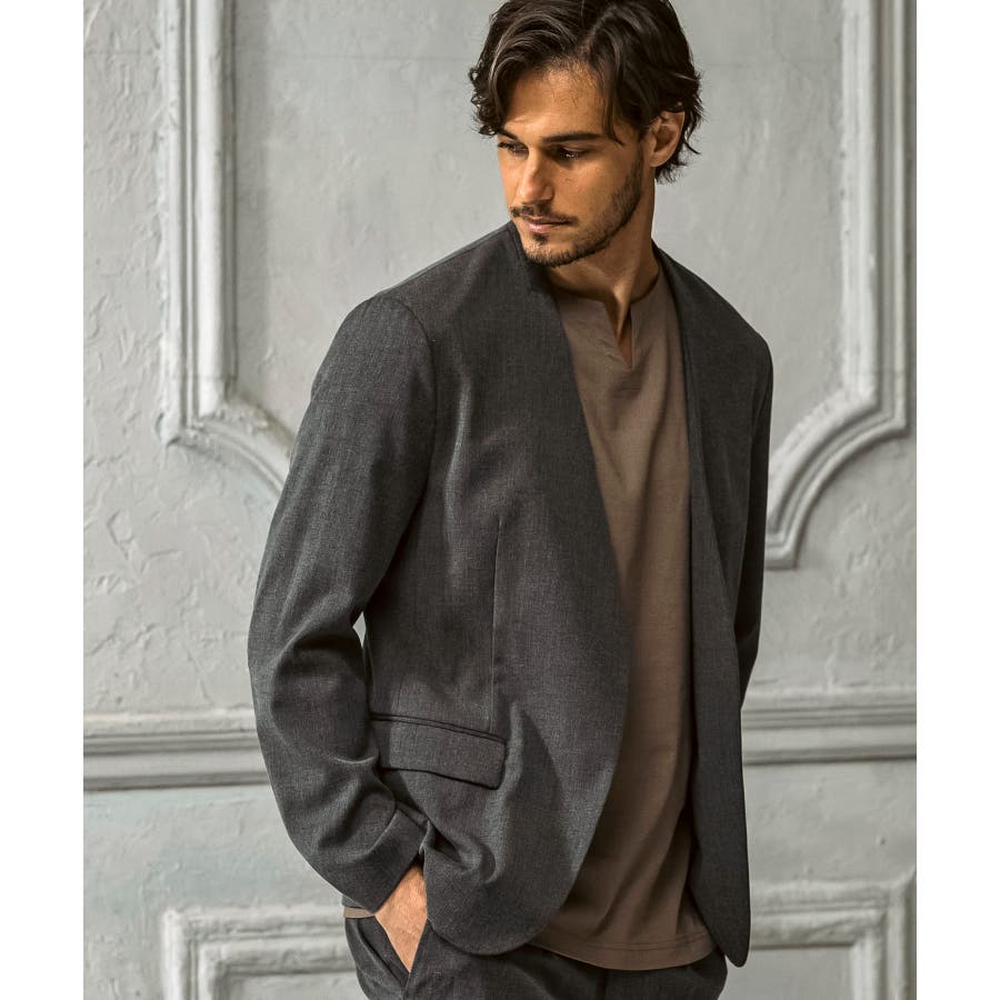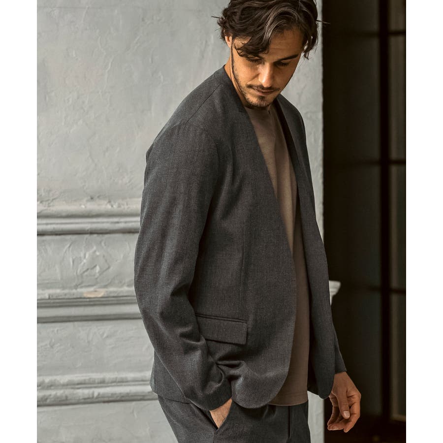 ウール混の生地を使用したノーカラージャケット。