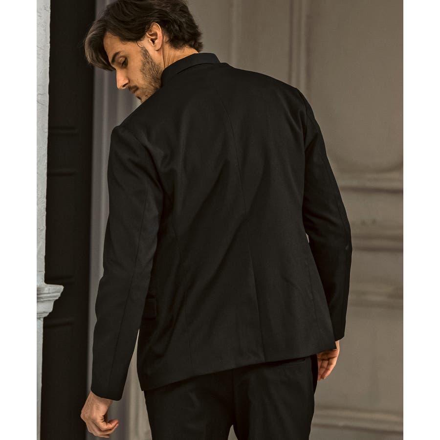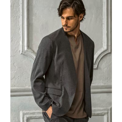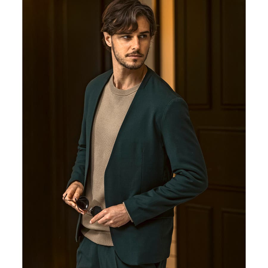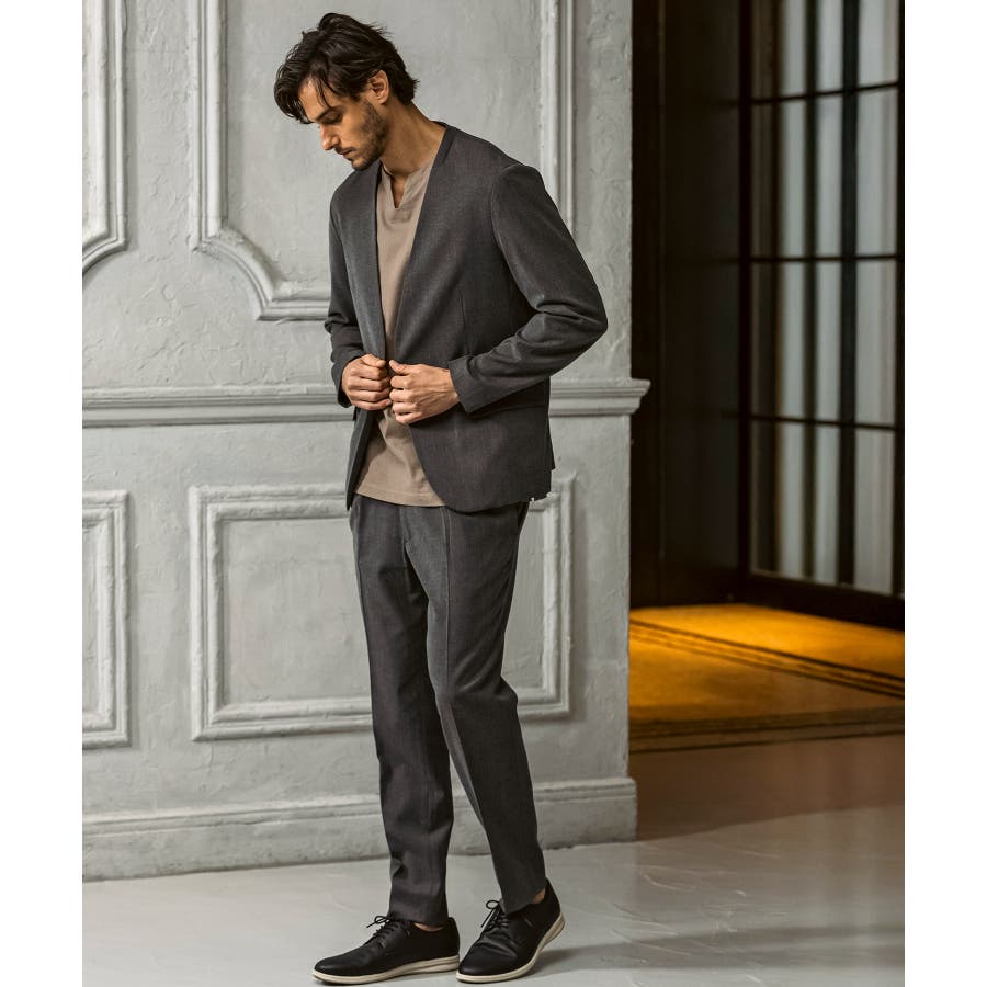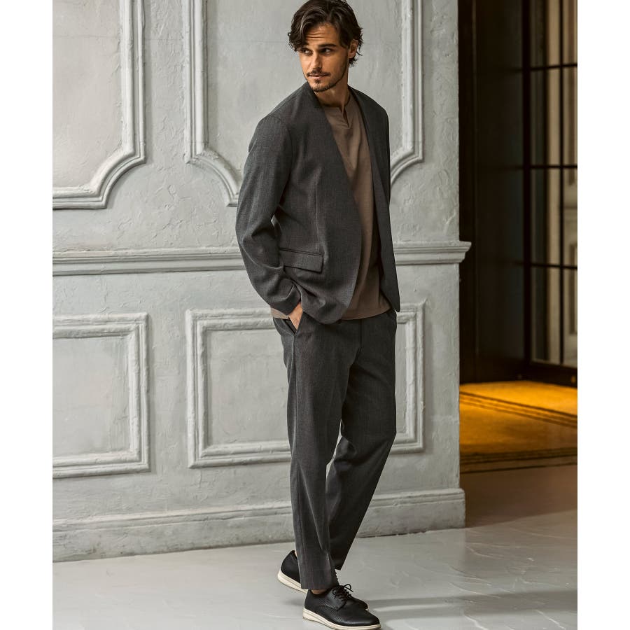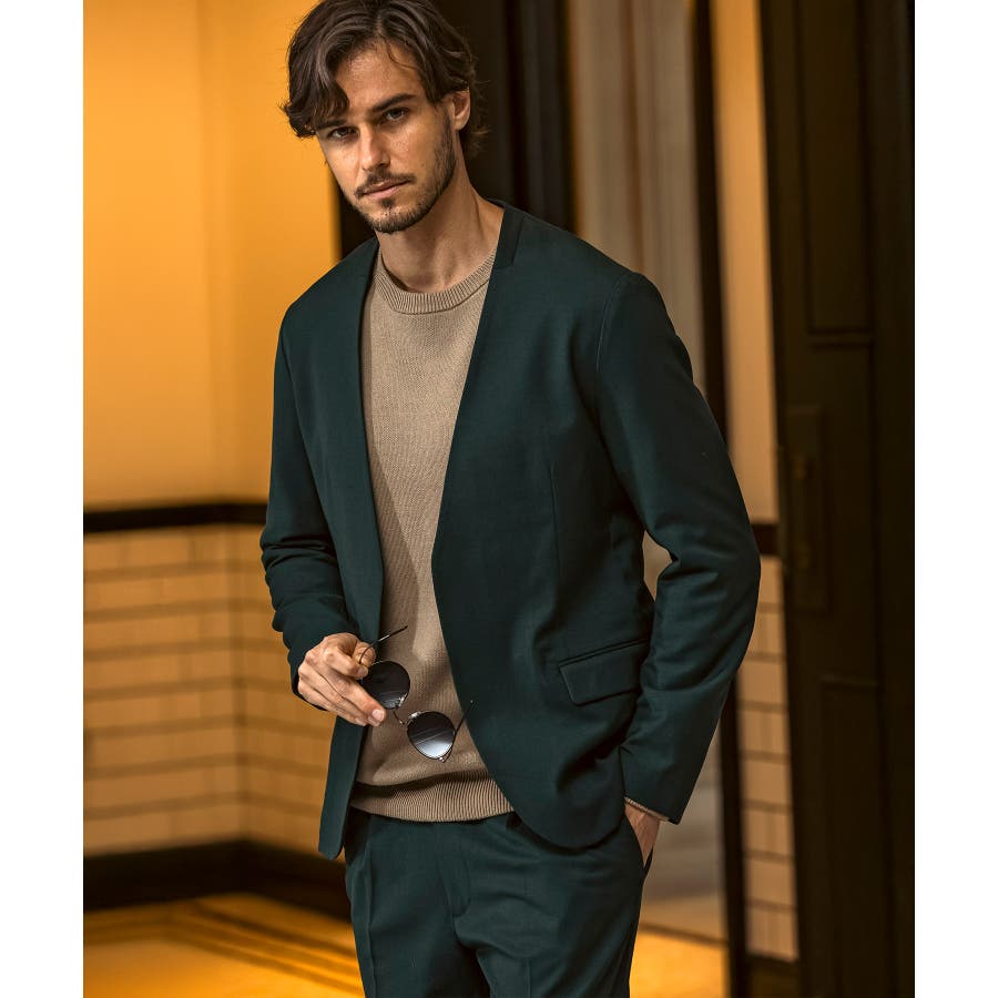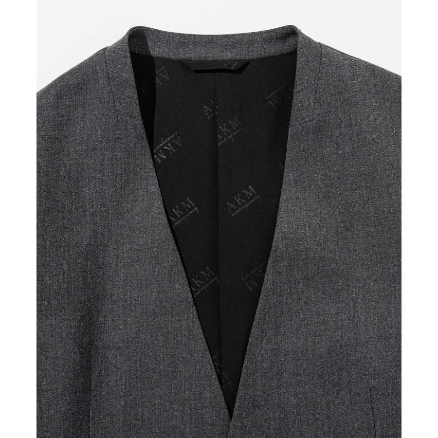 ウール混の生地を使用したノーカラージャケット。