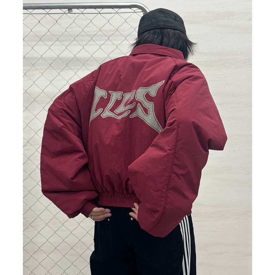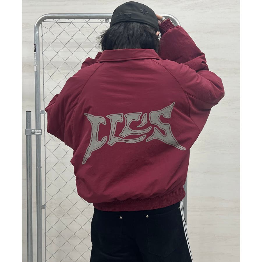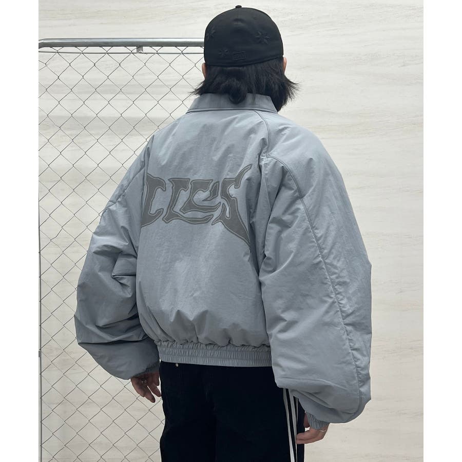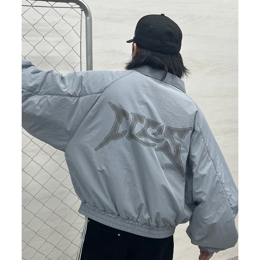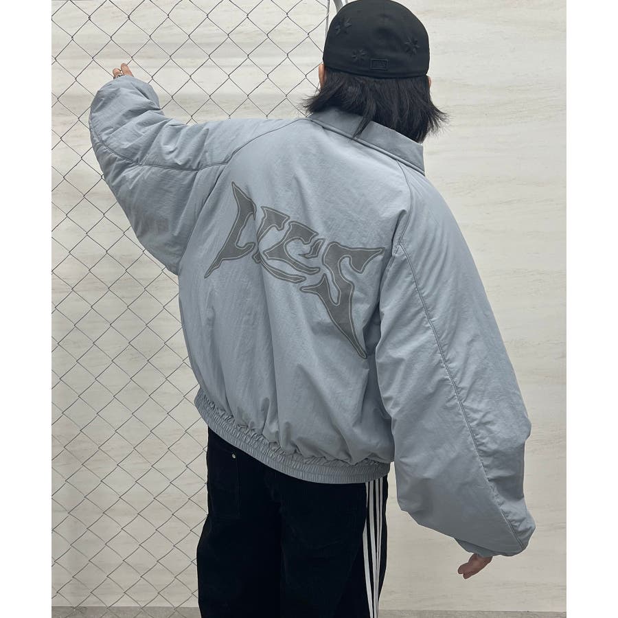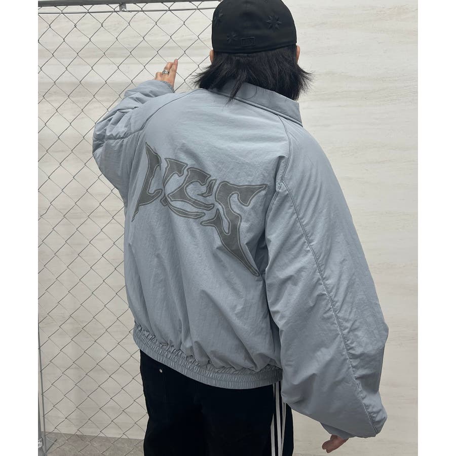背中の大胆なロゴプリントと光沢のある生地感が特徴のルーズシルエットブルゾン