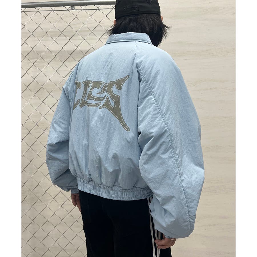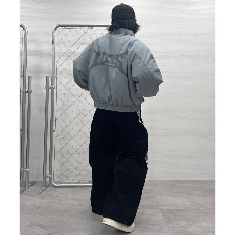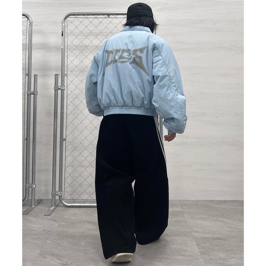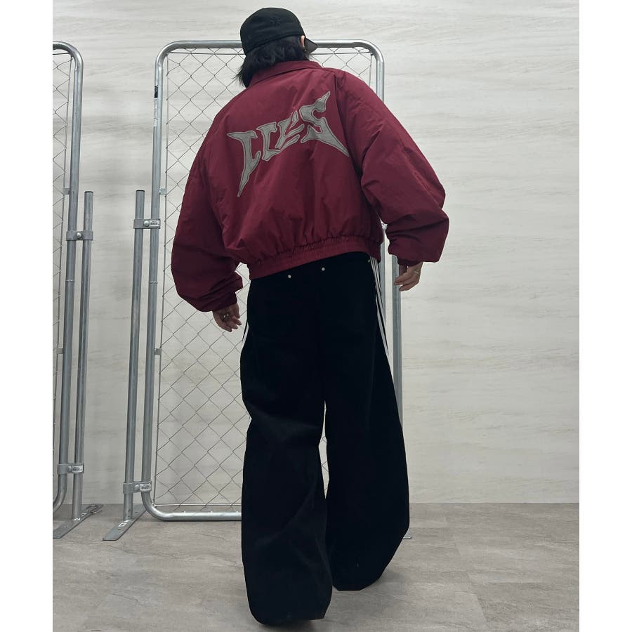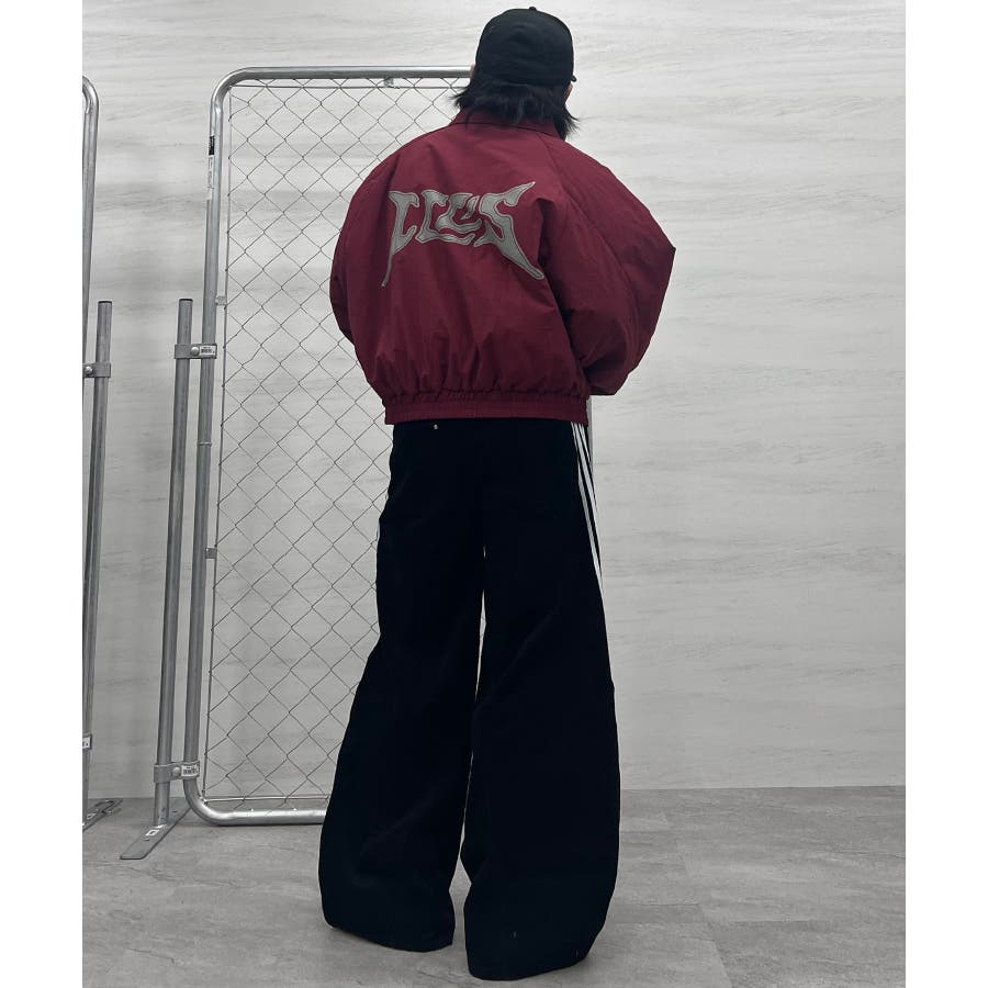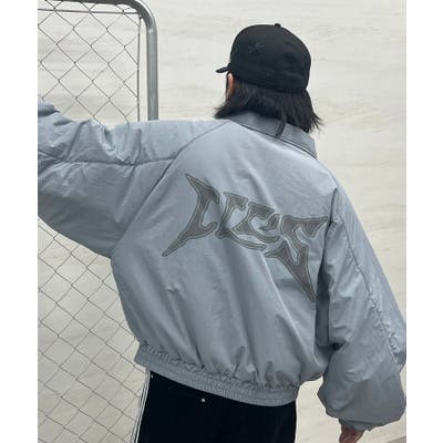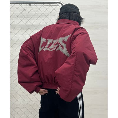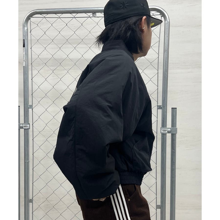 背中の大胆なロゴプリントと光沢のある生地感が特徴のルーズシルエットブルゾン