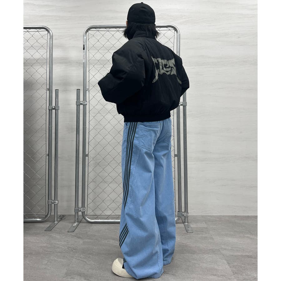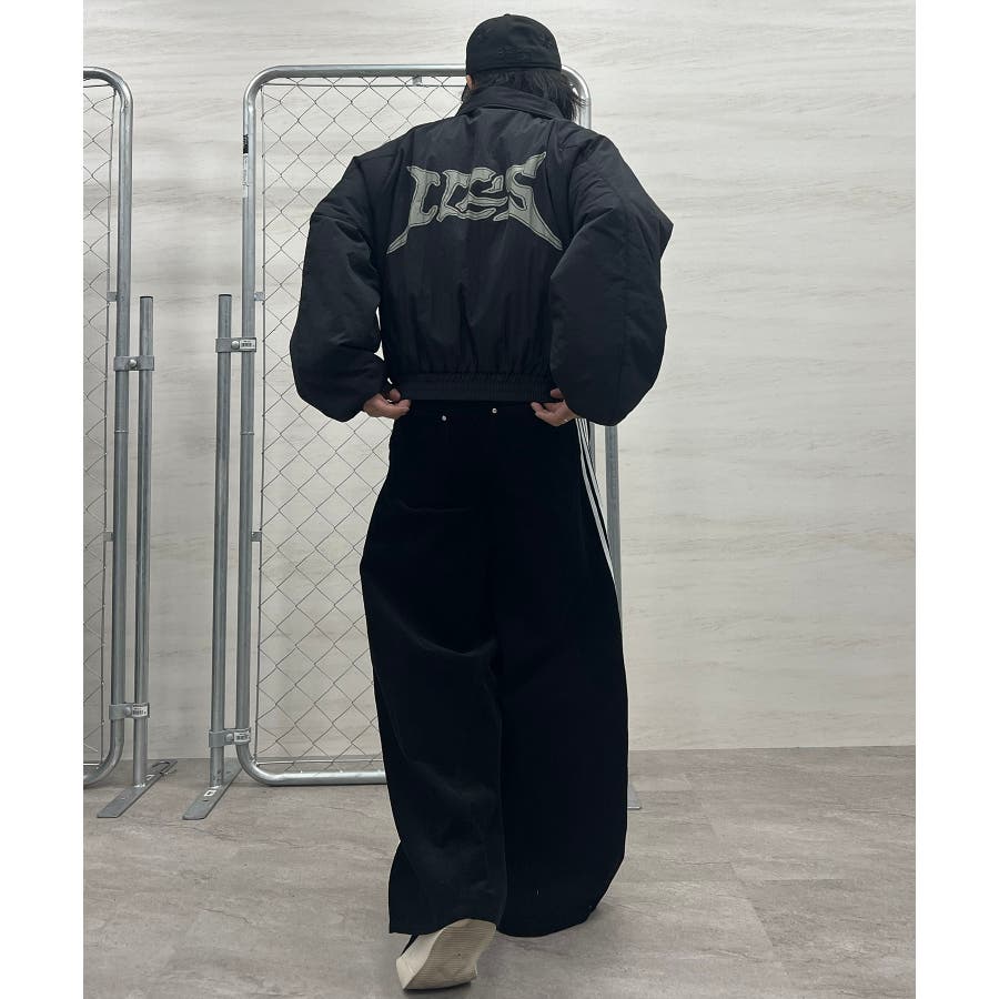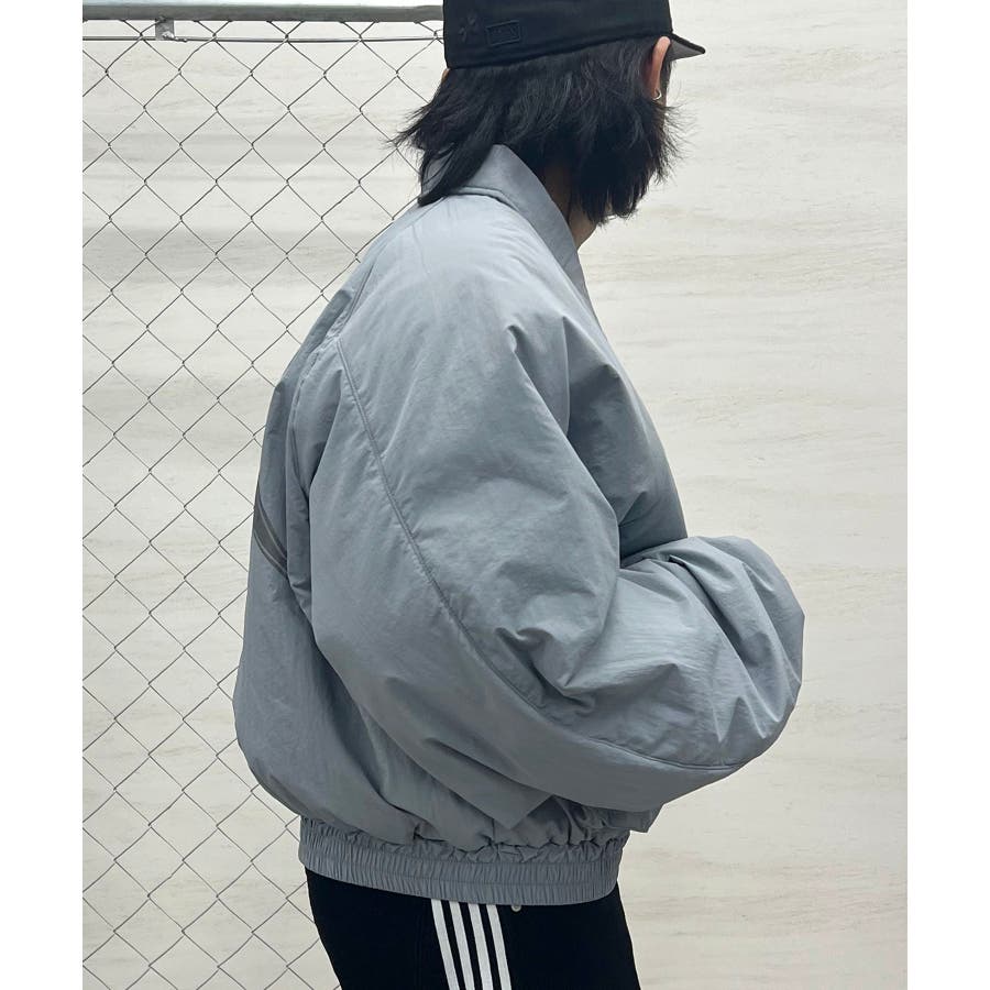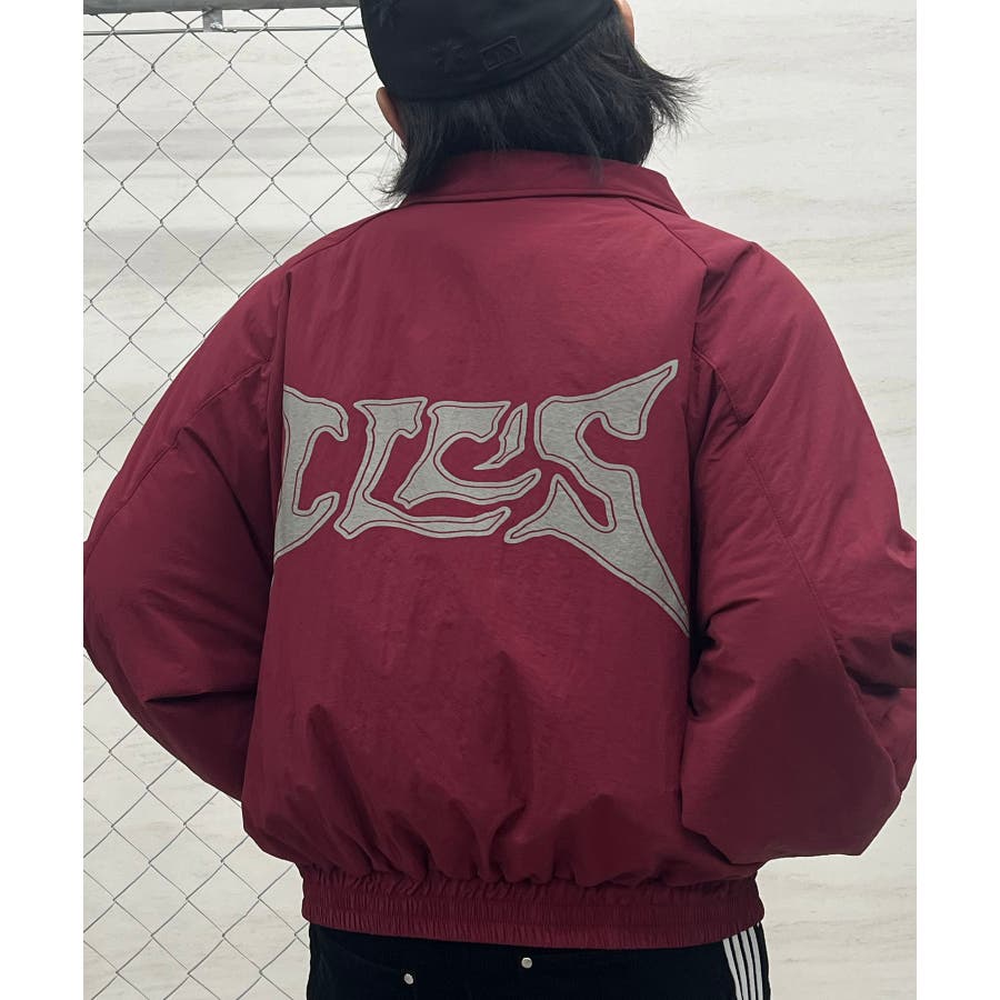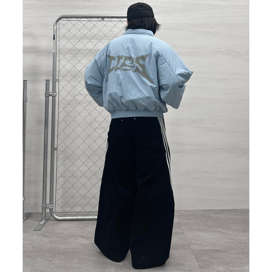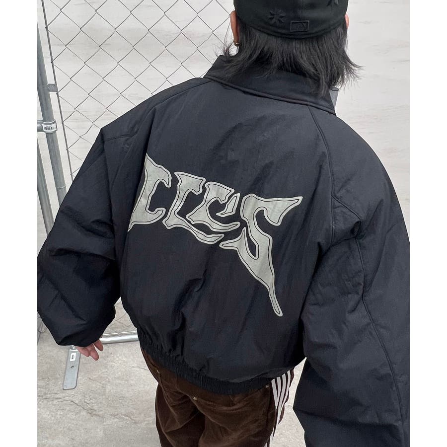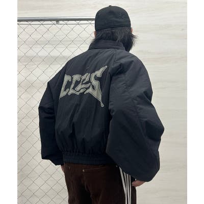 背中の大胆なロゴプリントと光沢のある生地感が特徴のルーズシルエットブルゾン