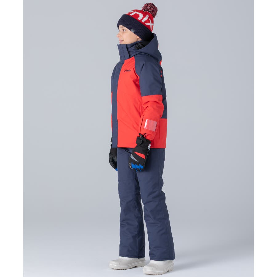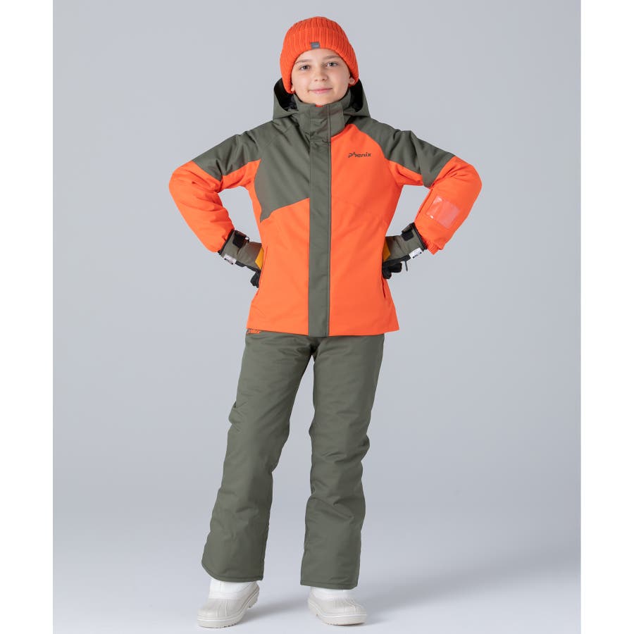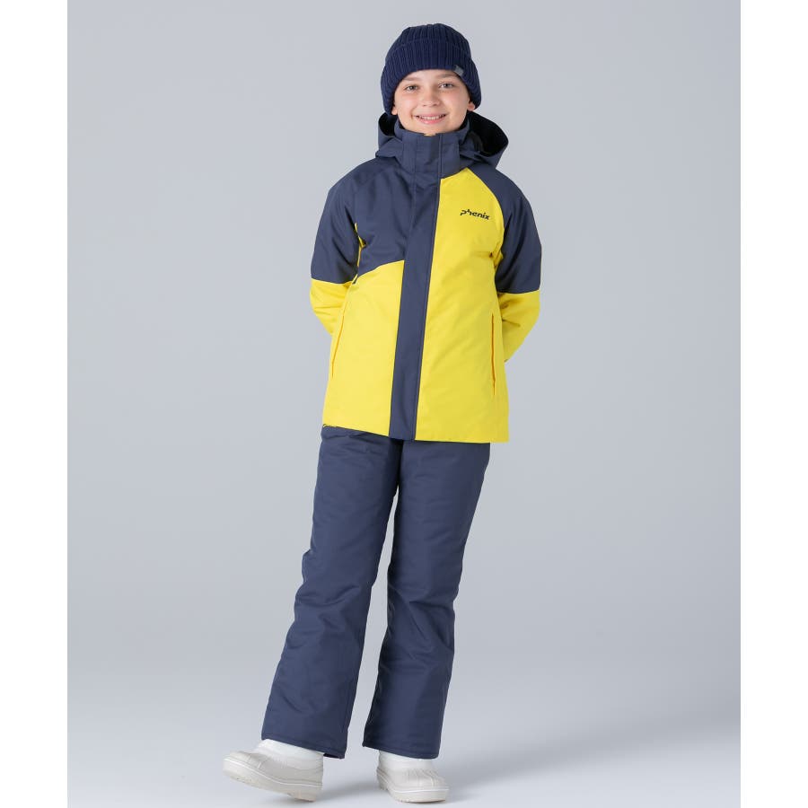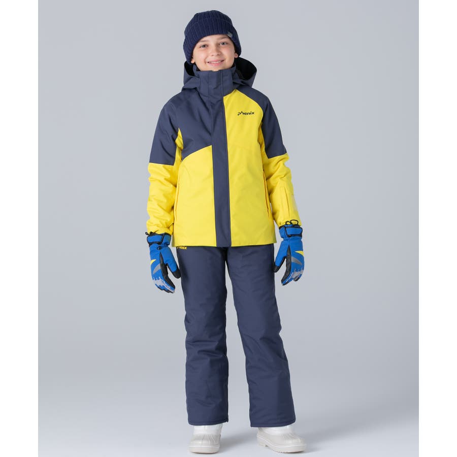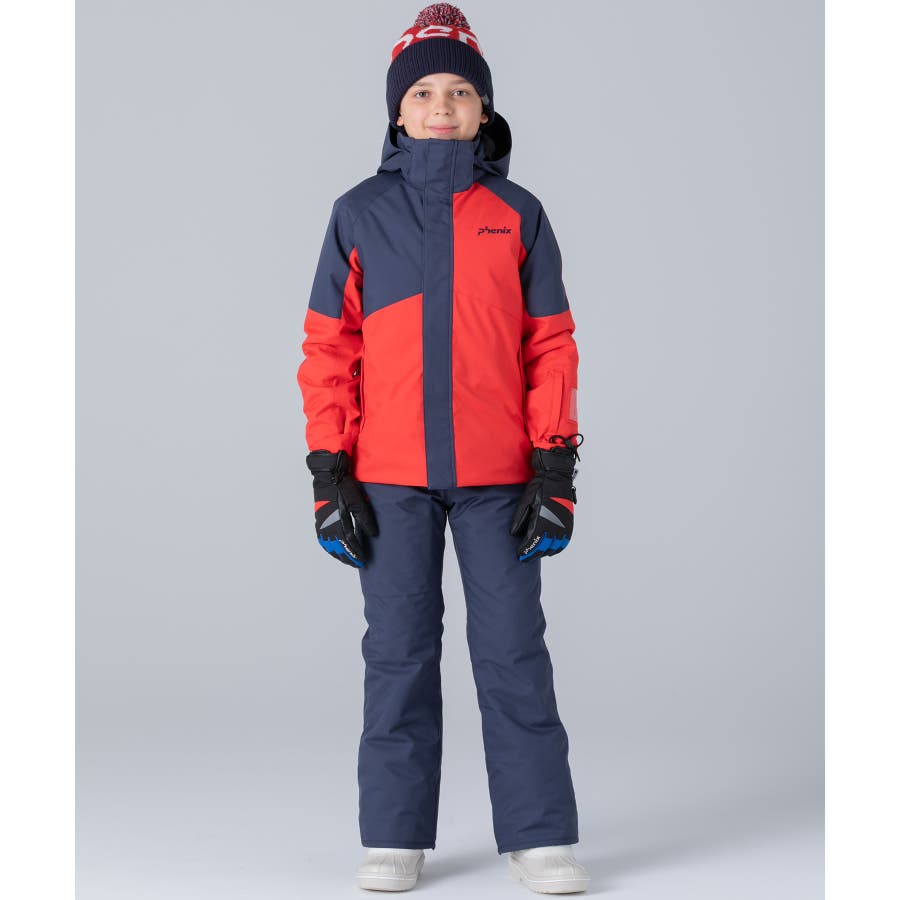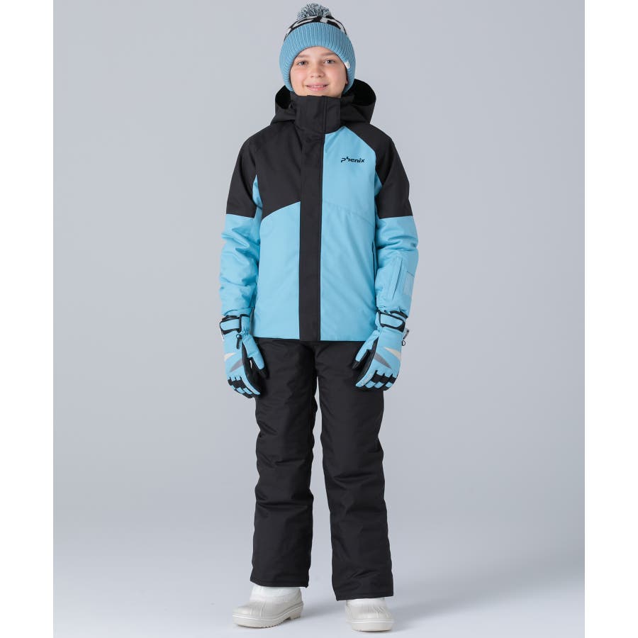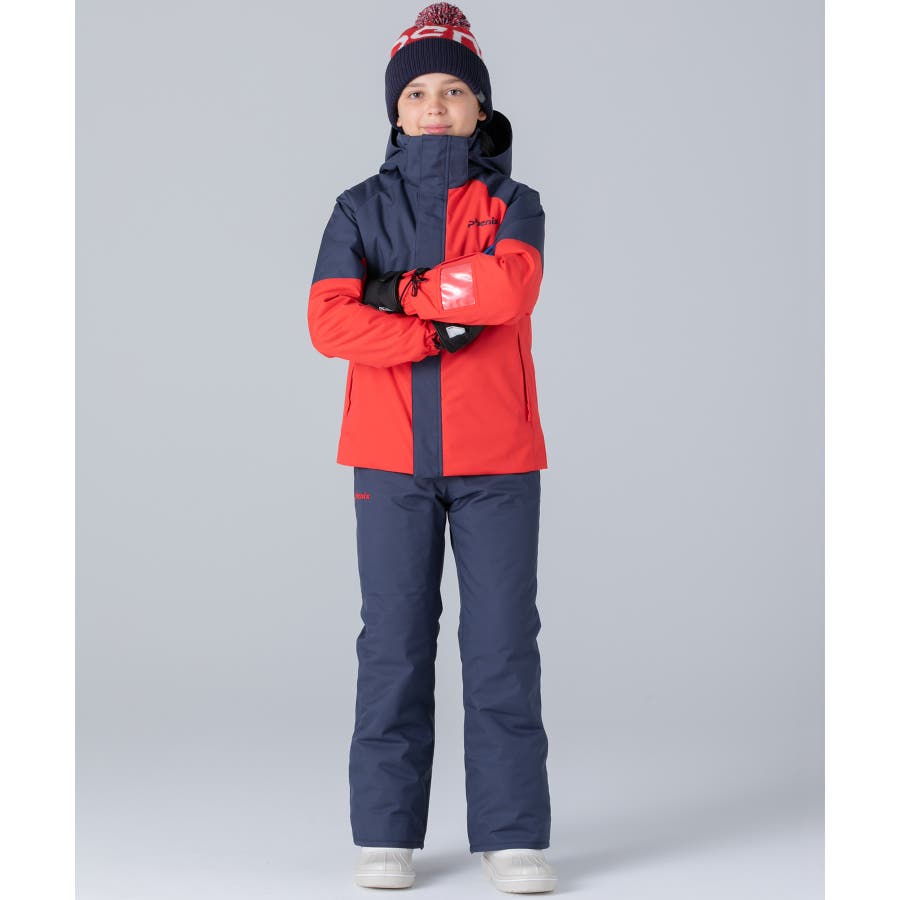 アシンメトリーな色使いが印象的な、個性あふれるジュニア用スキーウェア上下セット。