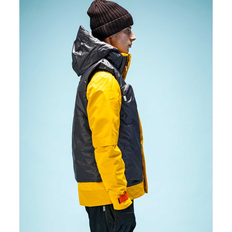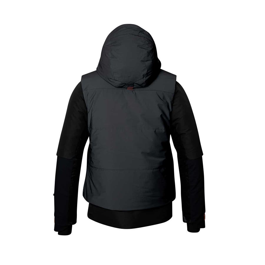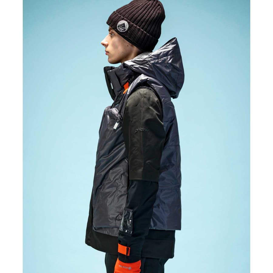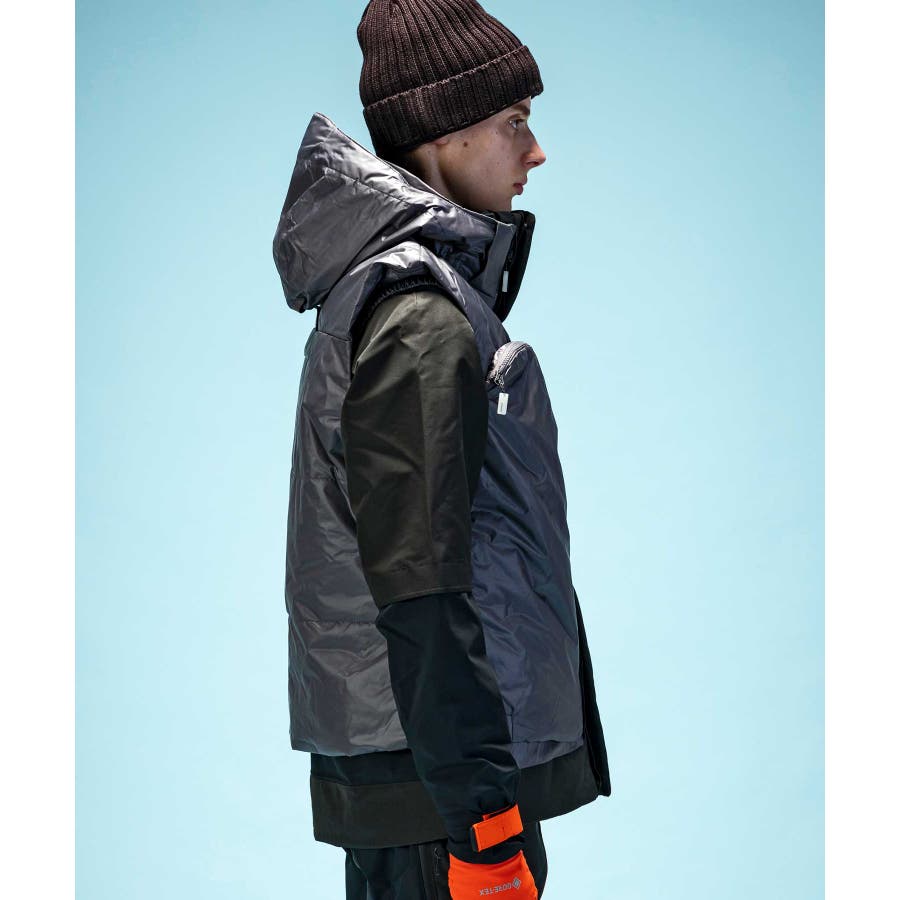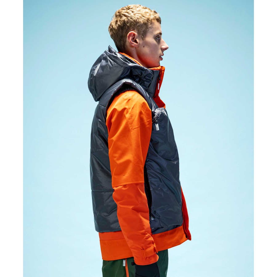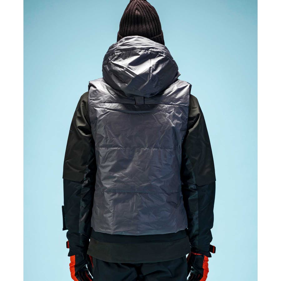 フードの取り外しが可能です。アウターとベストのどちらにも接続することができます。