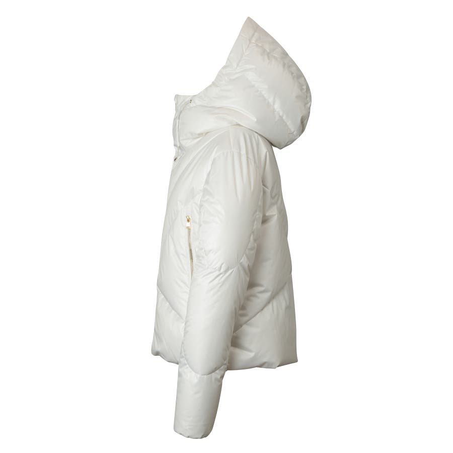 不規則な切り替えデザインが目を引くレディース用ダウンジャケット。