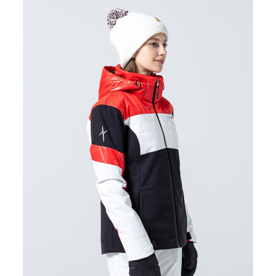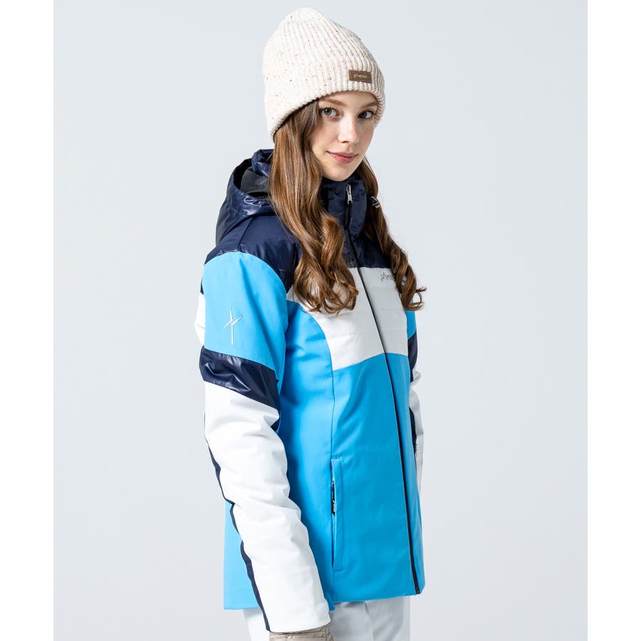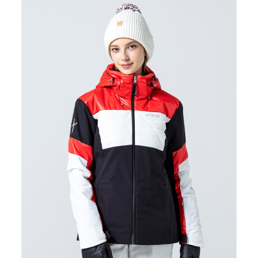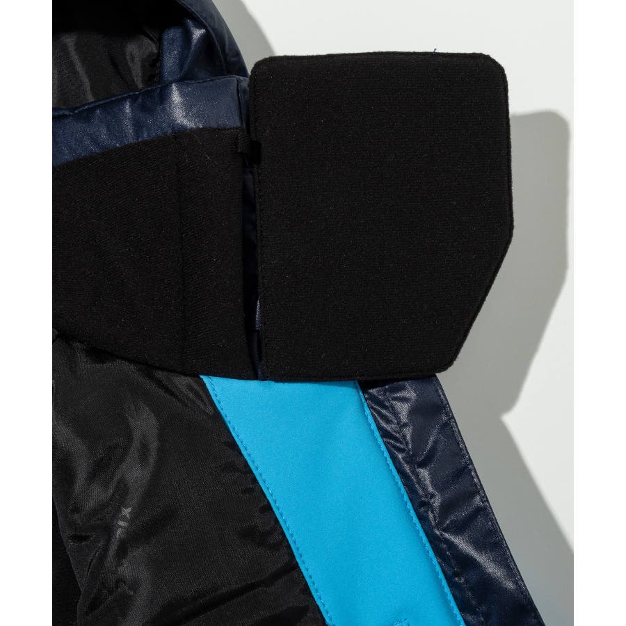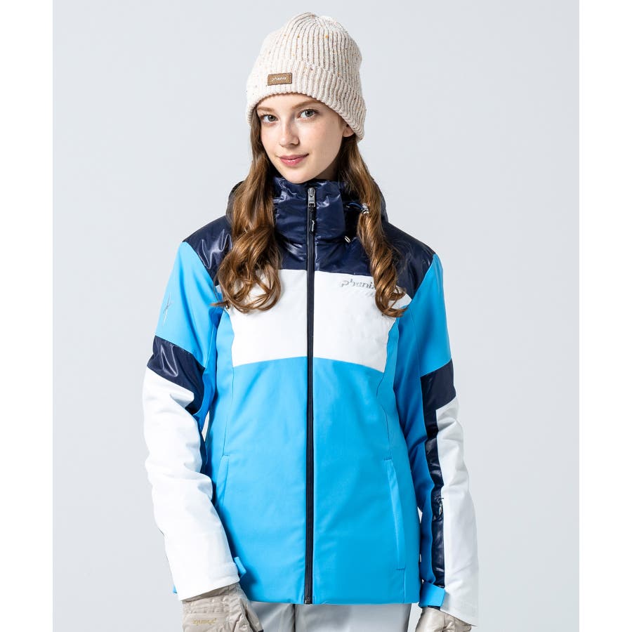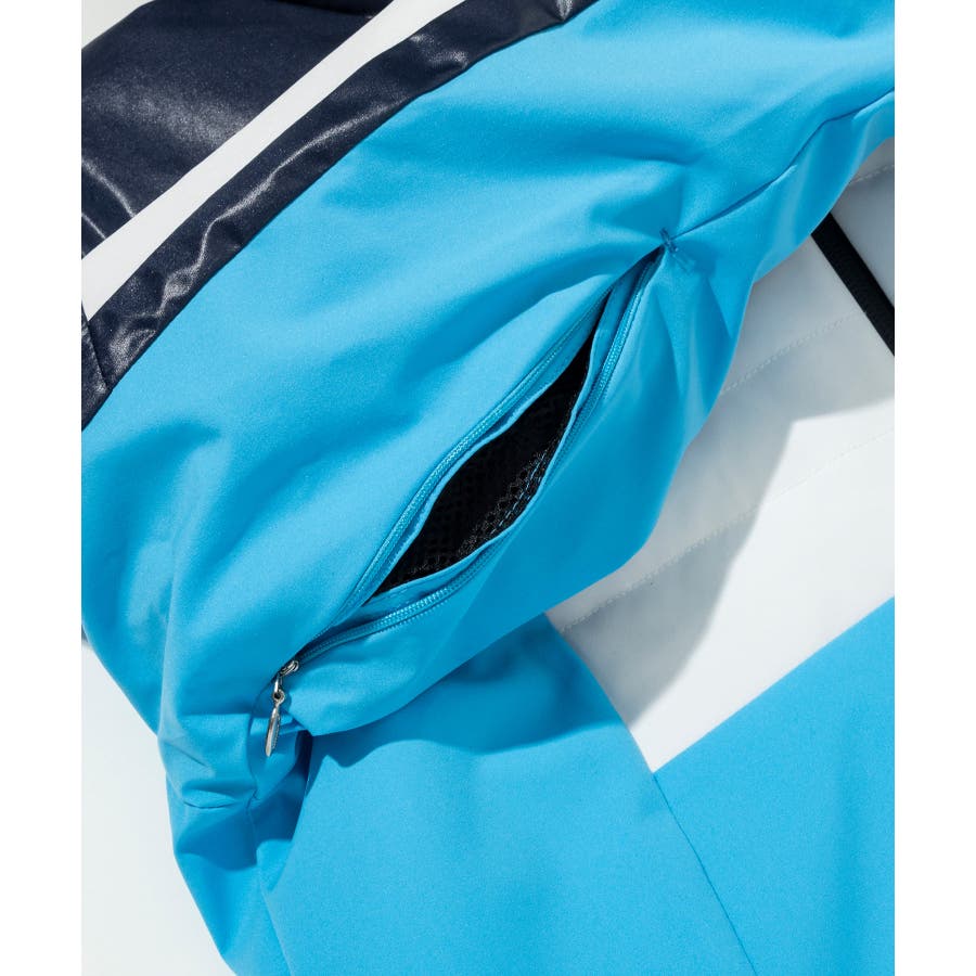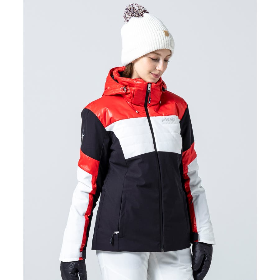 シャイニー素材をアクセントに取り入れた、スポーティーな配色が際立つスキージャケット。