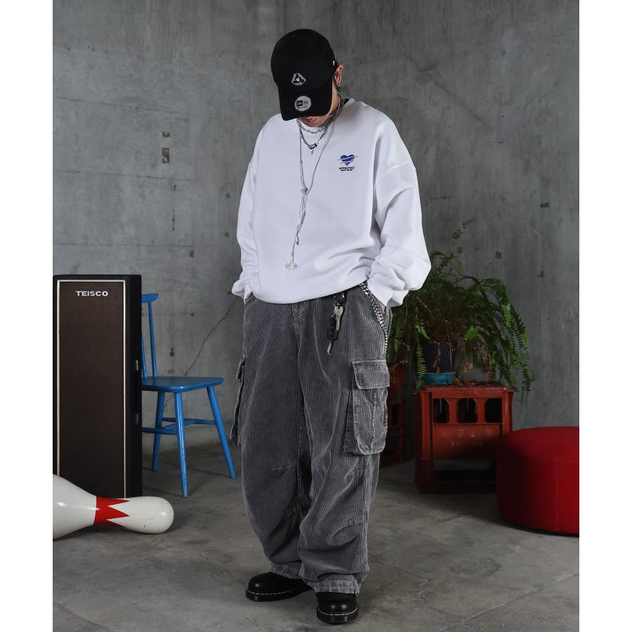 デニムパンツやパラシュートパンツ、カーゴパンツやスウェットパンツなどのストリートアイテムにもマッチします。