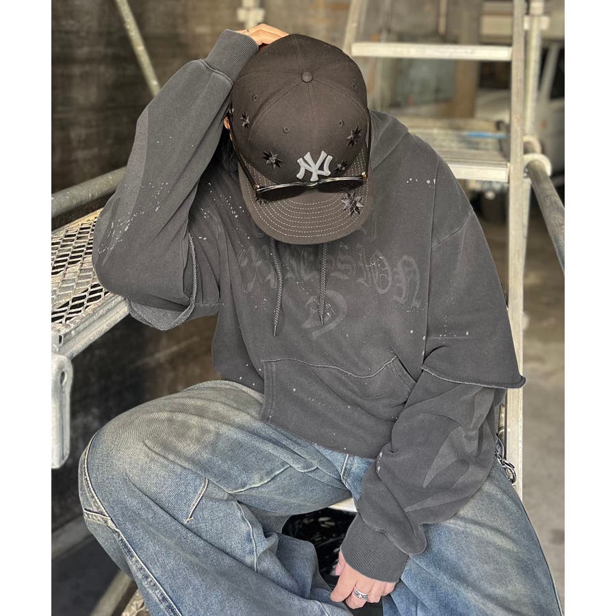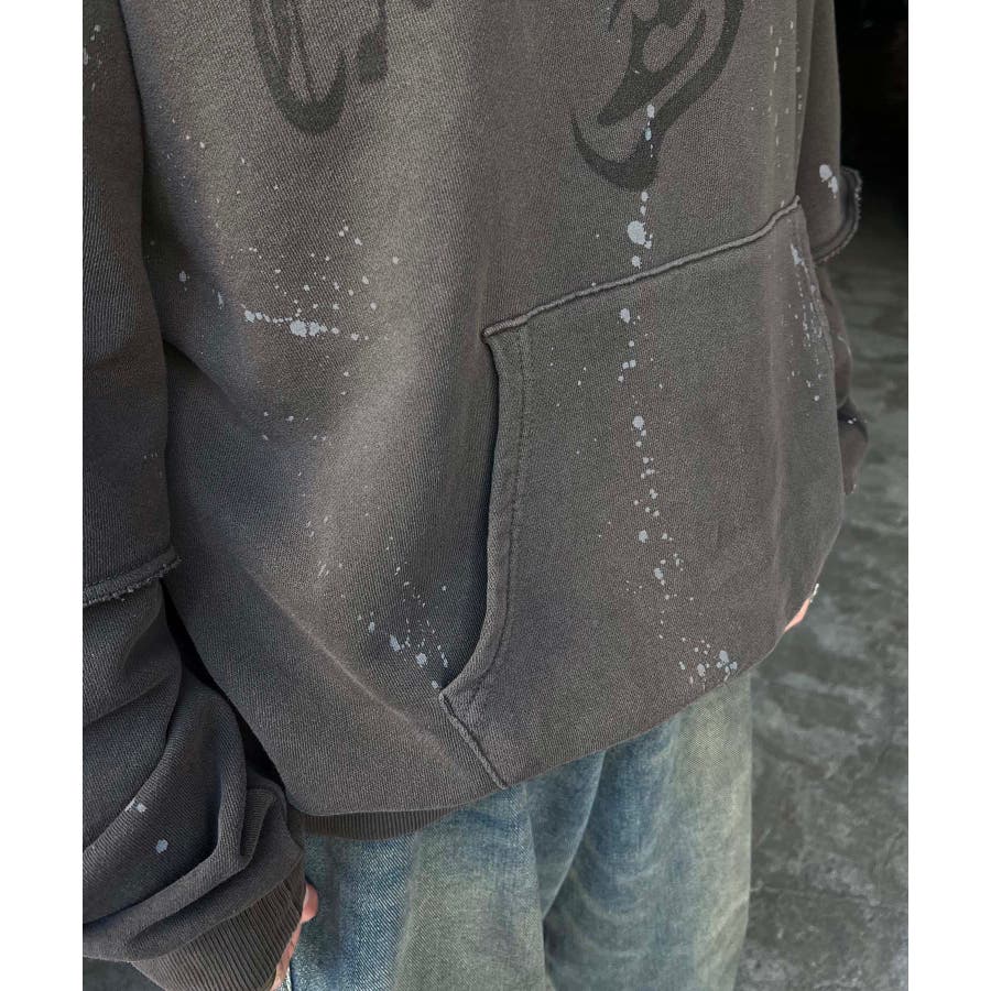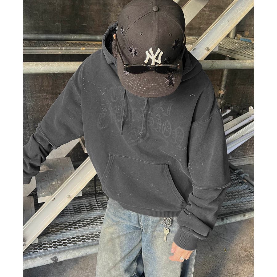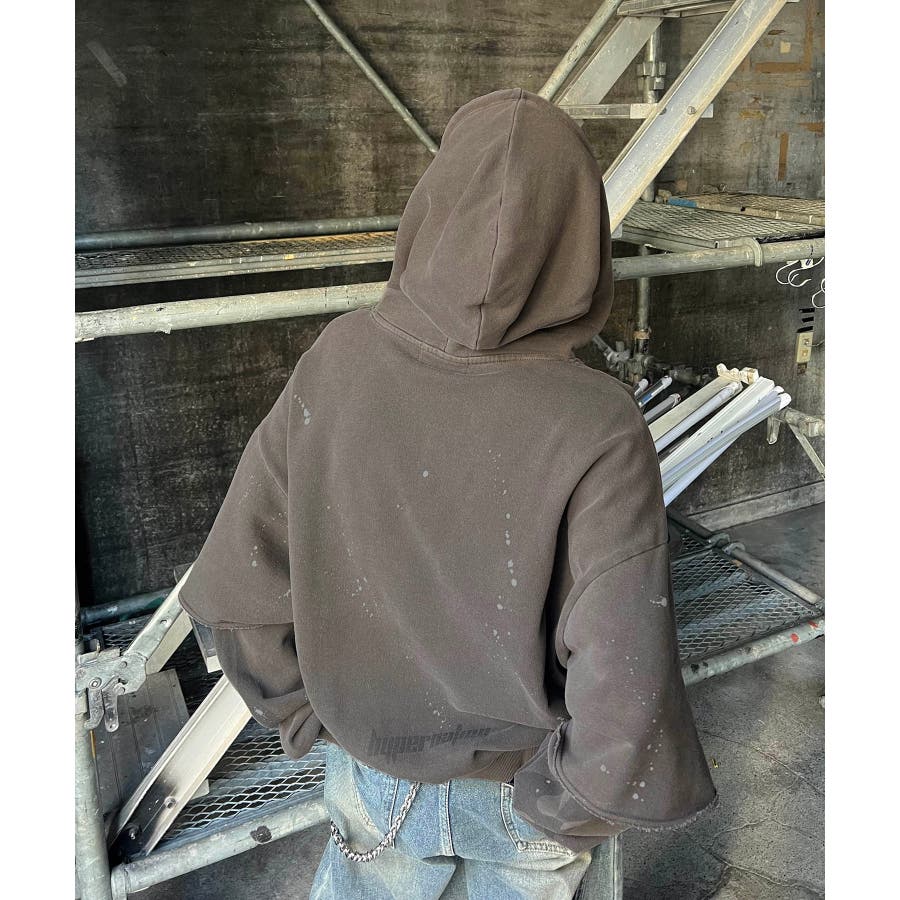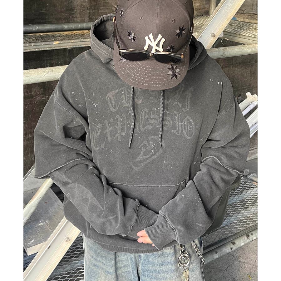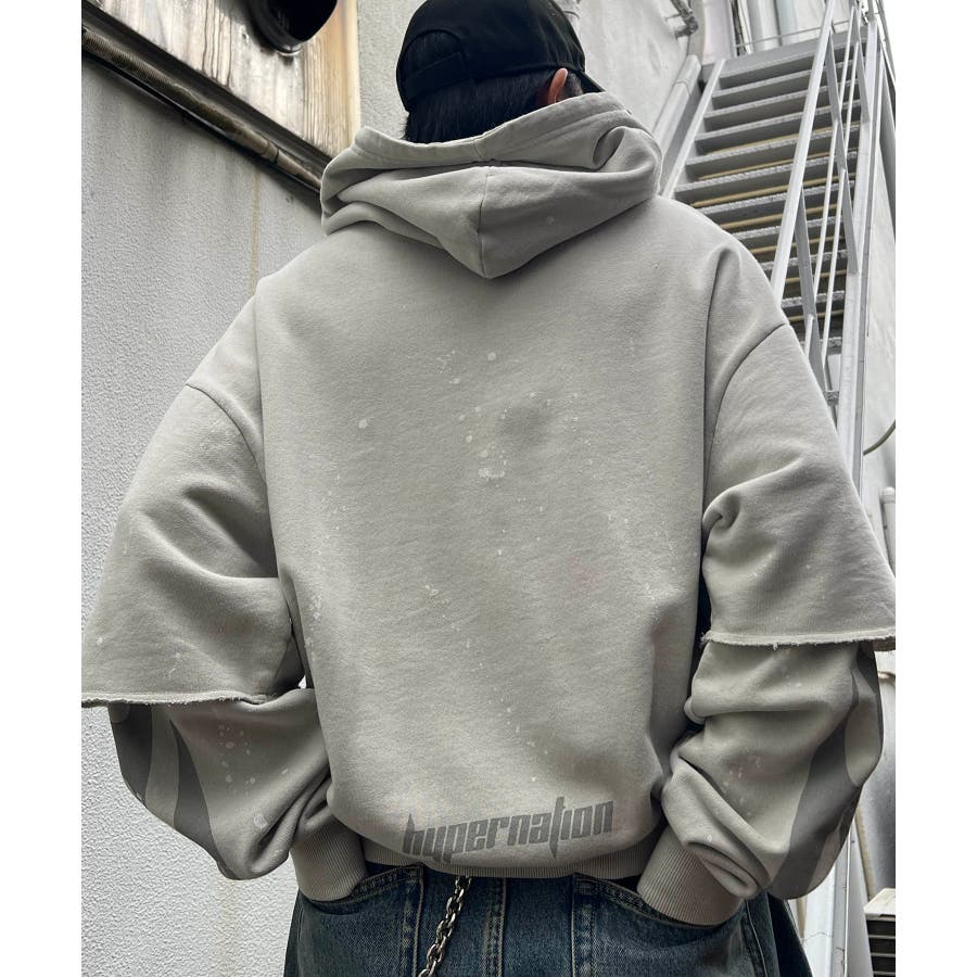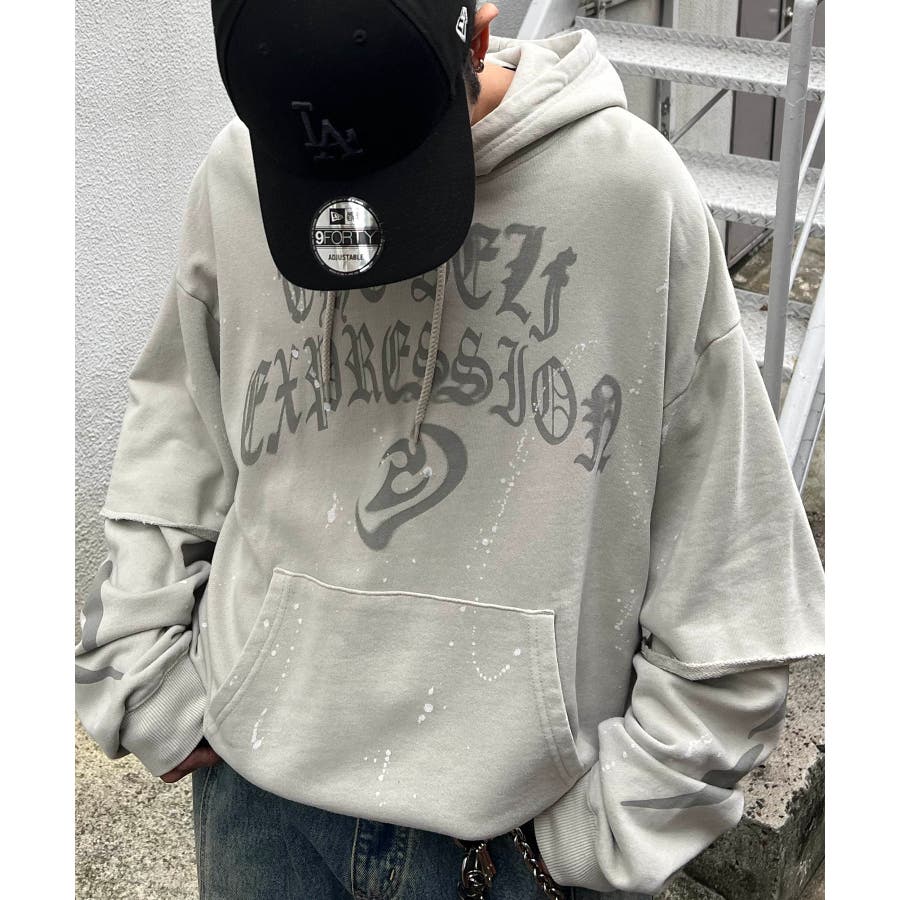 ヴィンテージ風配色とグランジグラフィックが魅力のフェイクレイヤードパーカー。