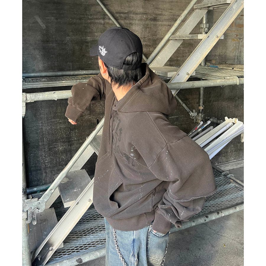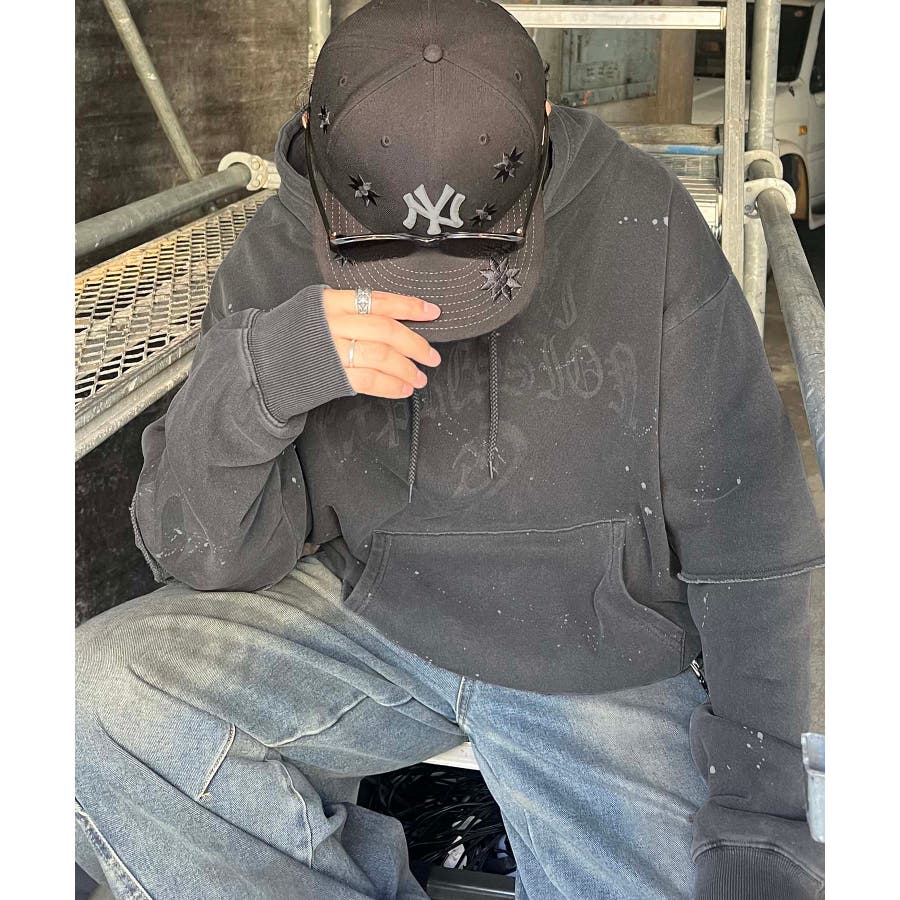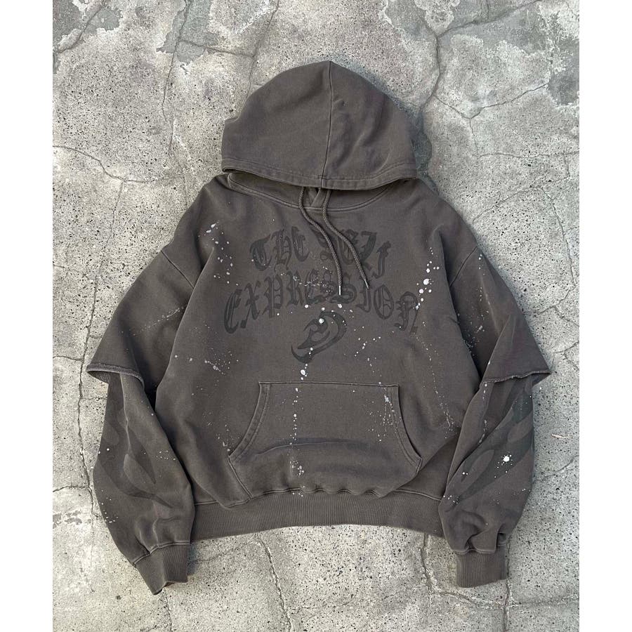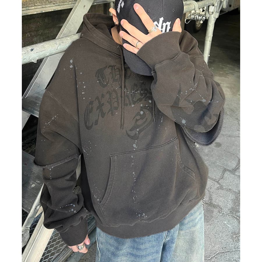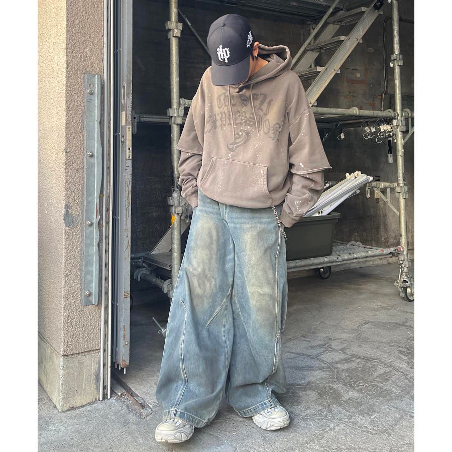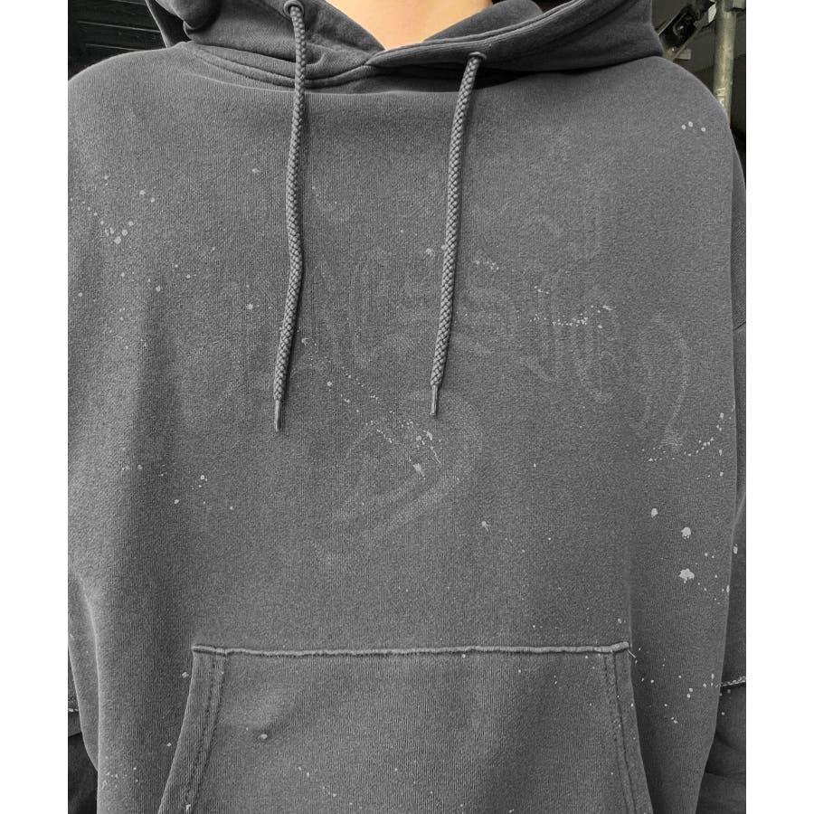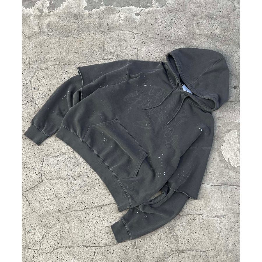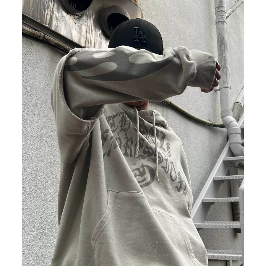 ヴィンテージ風配色とグランジグラフィックが魅力のフェイクレイヤードパーカー。