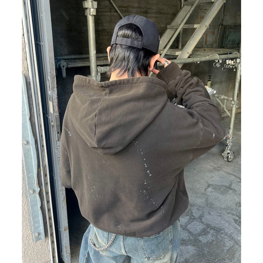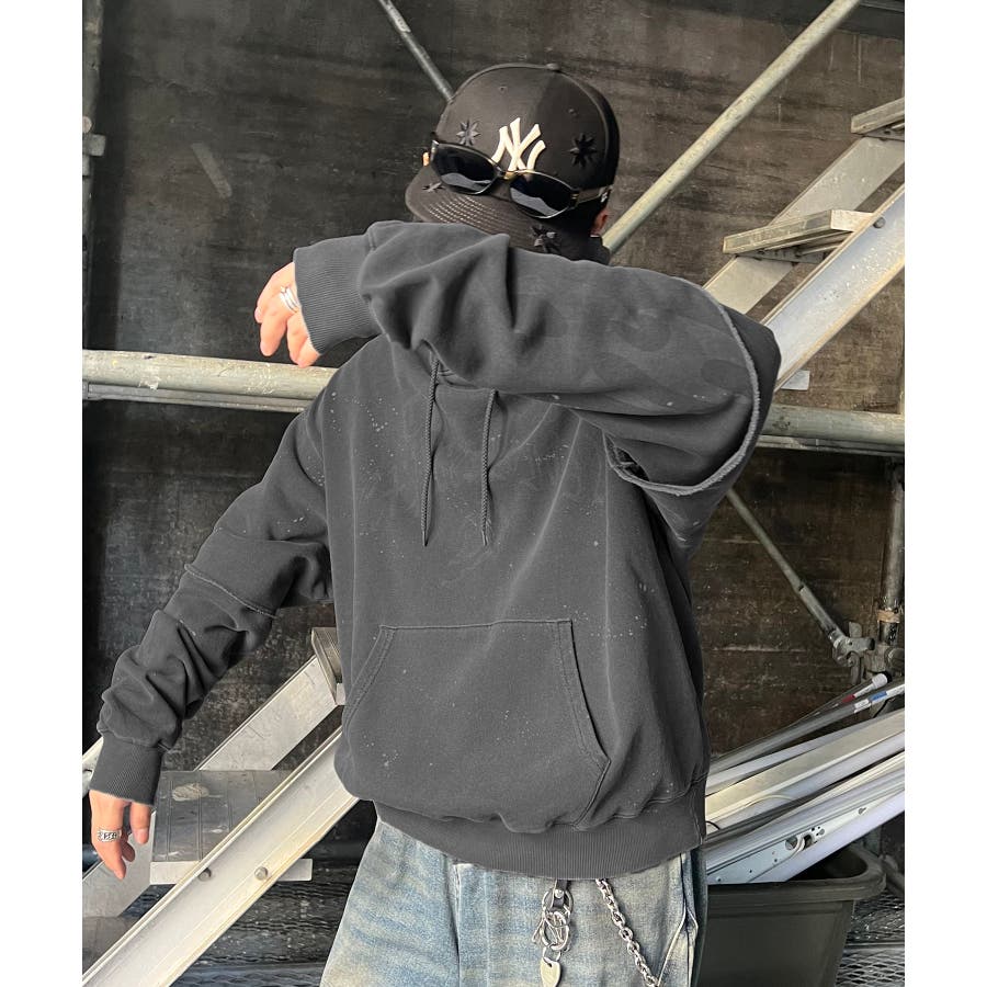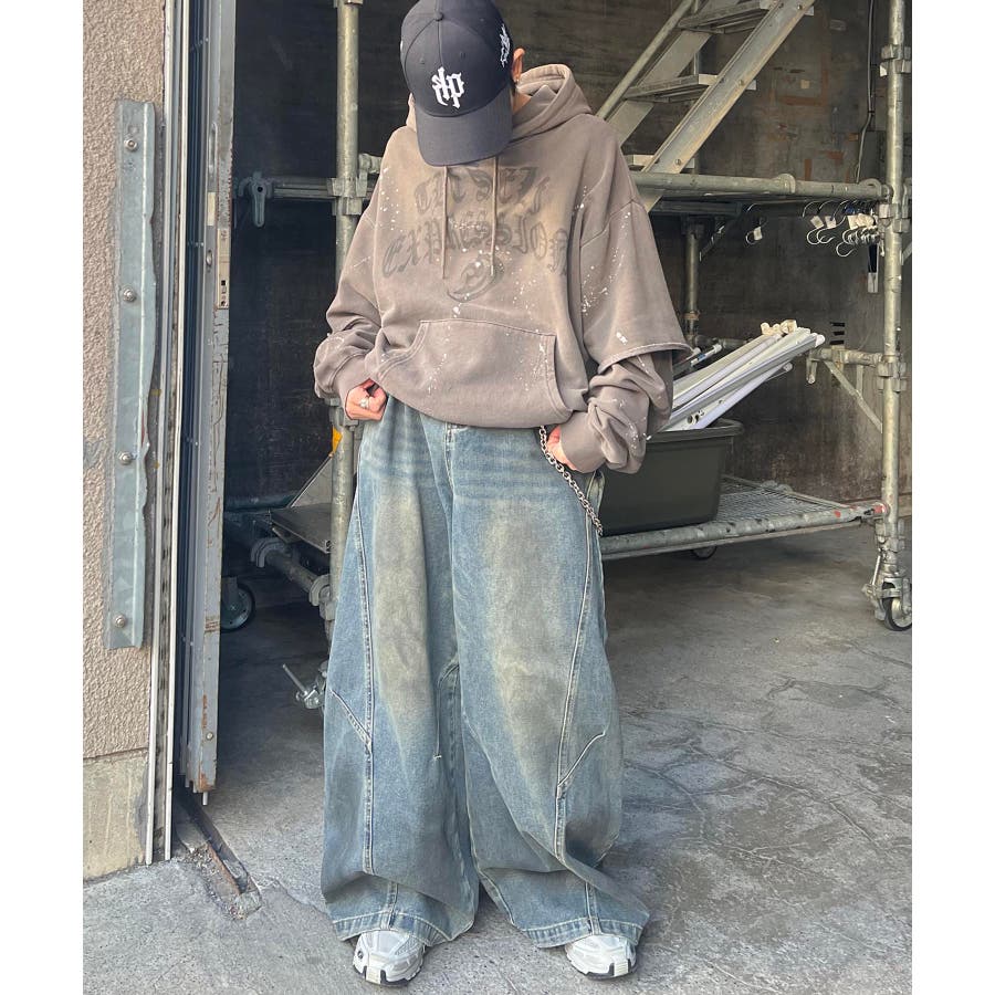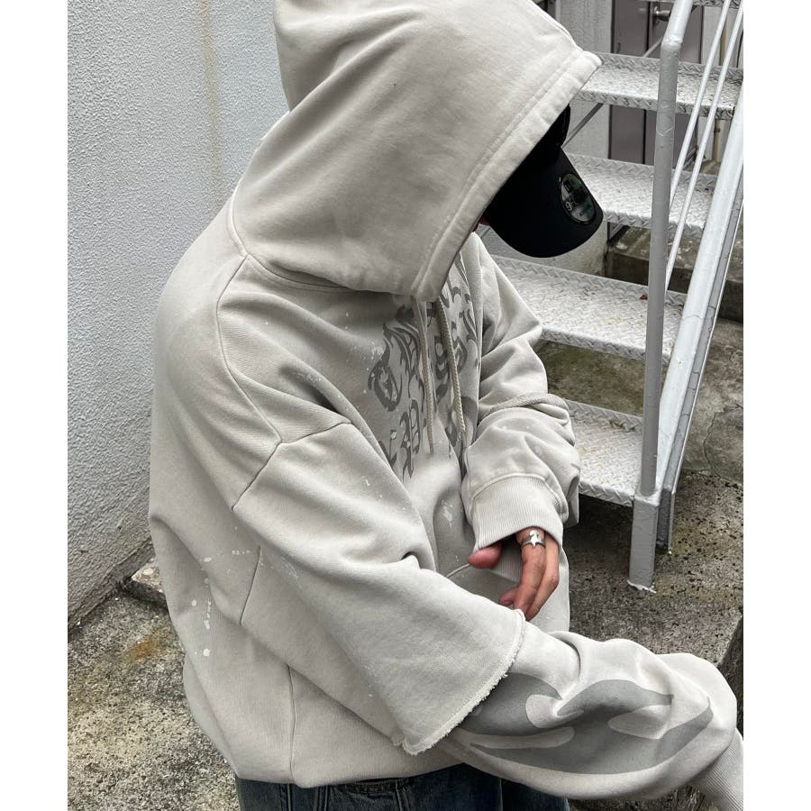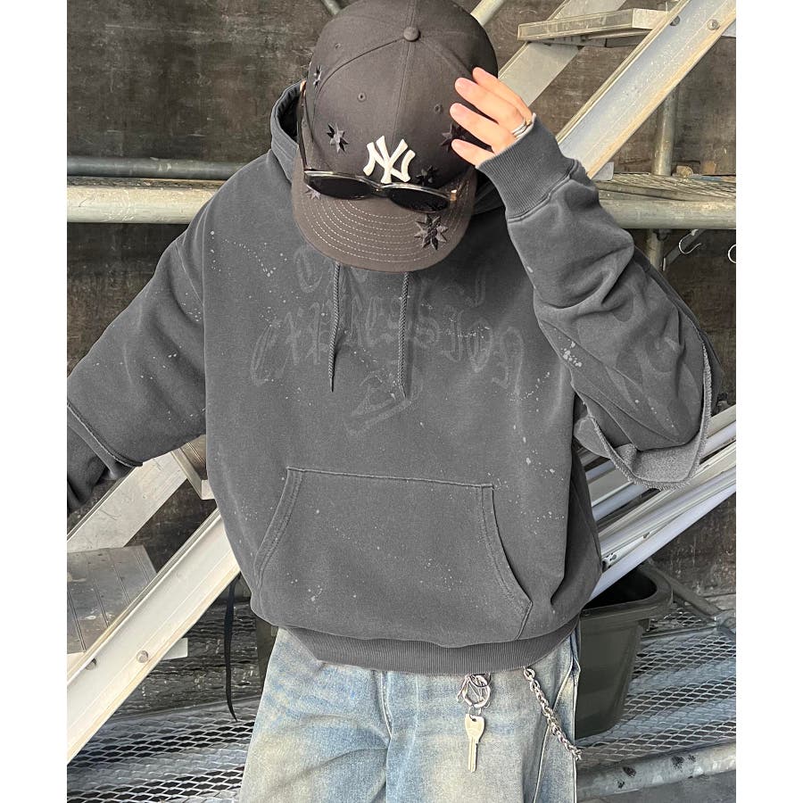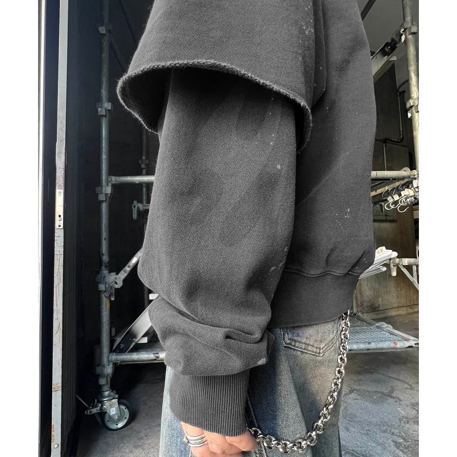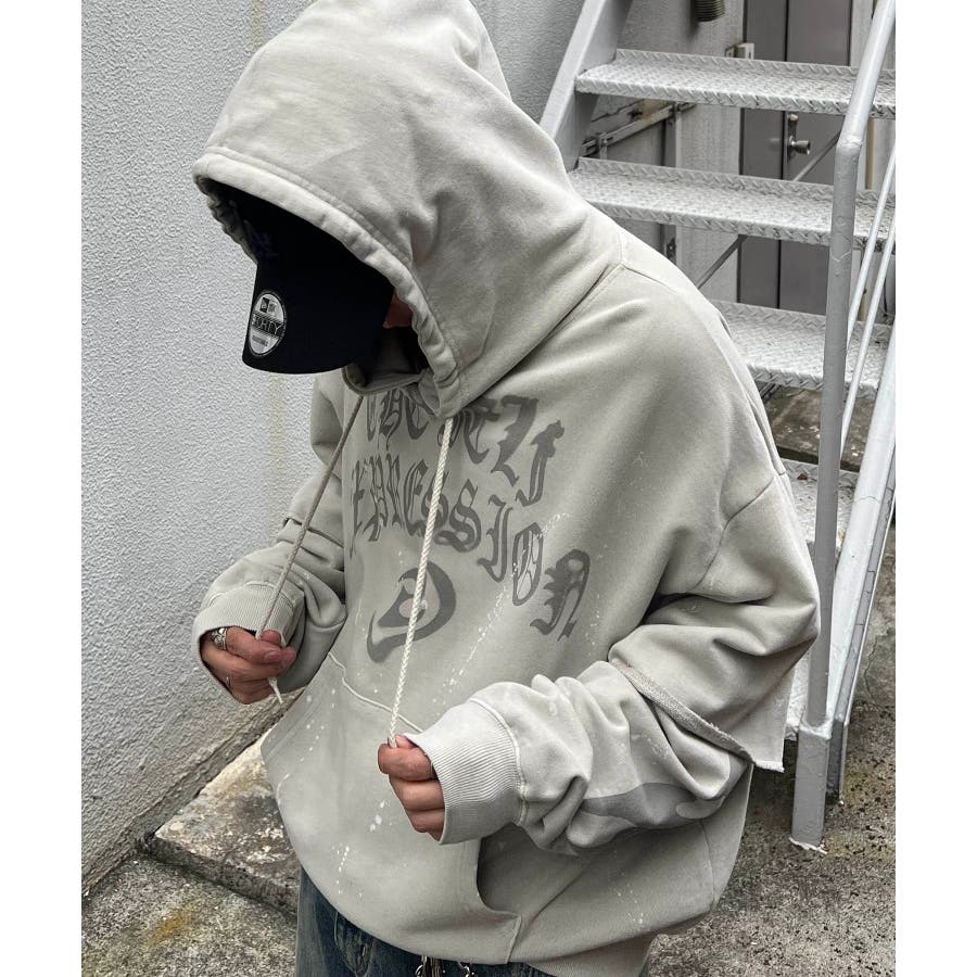 ヴィンテージ風配色とグランジグラフィックが魅力のフェイクレイヤードパーカー。