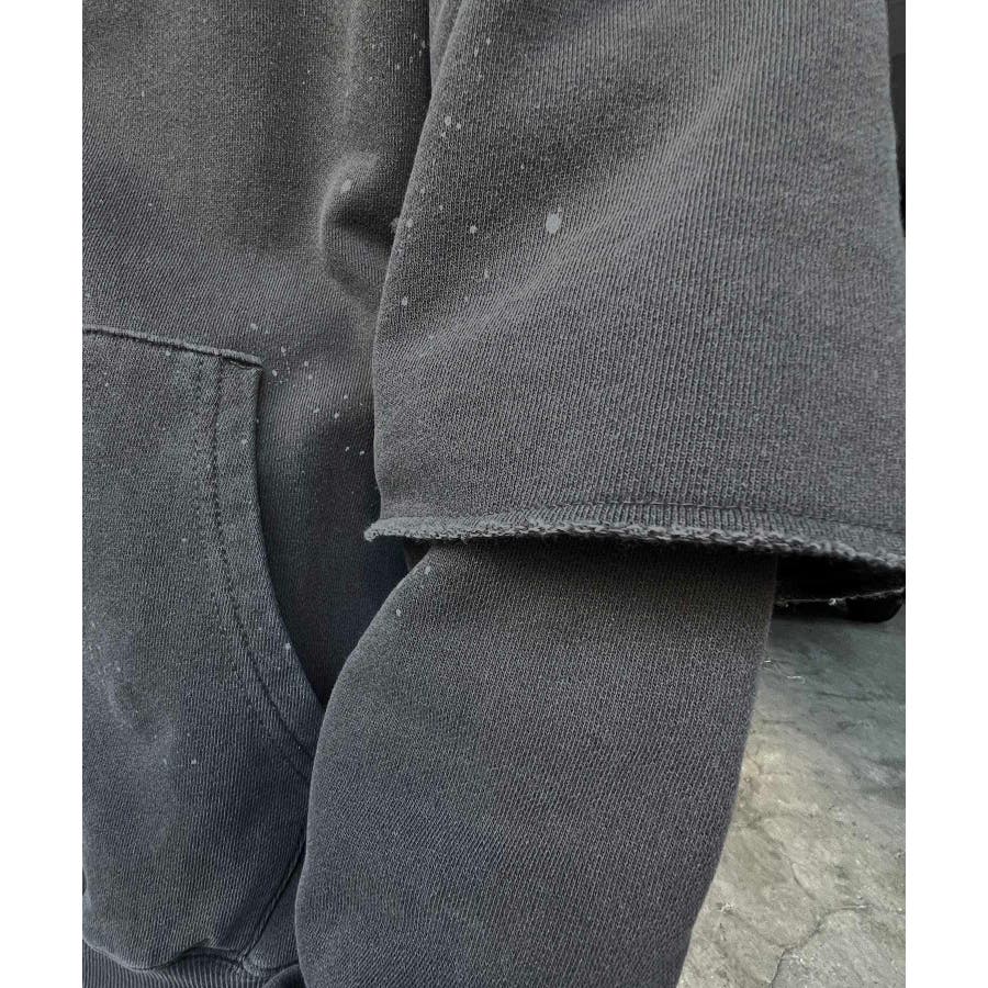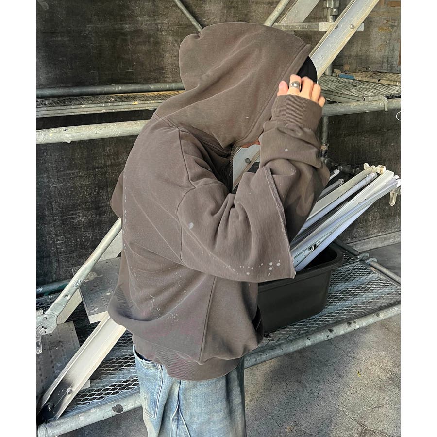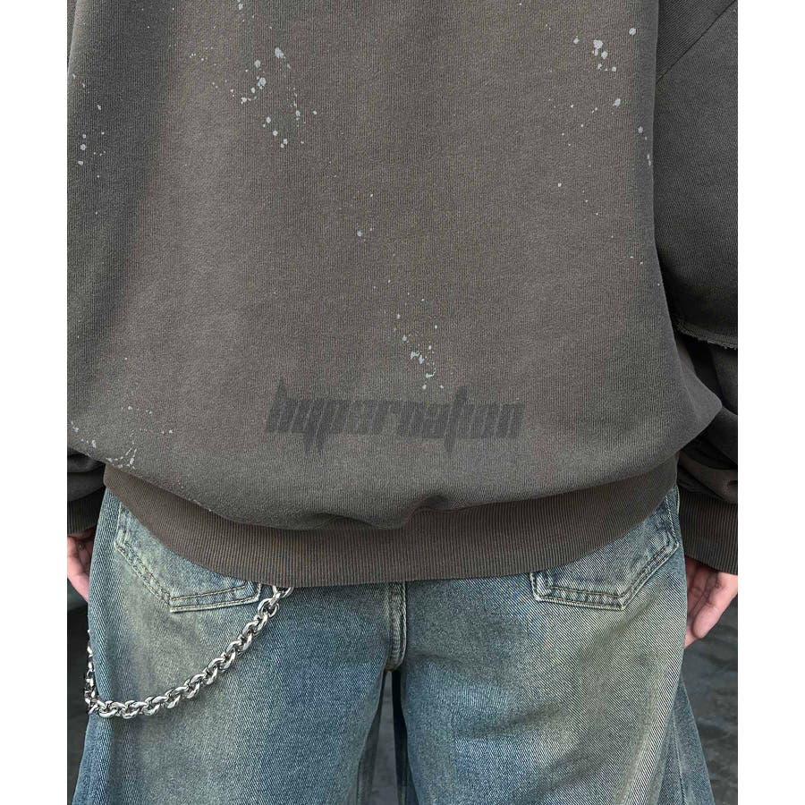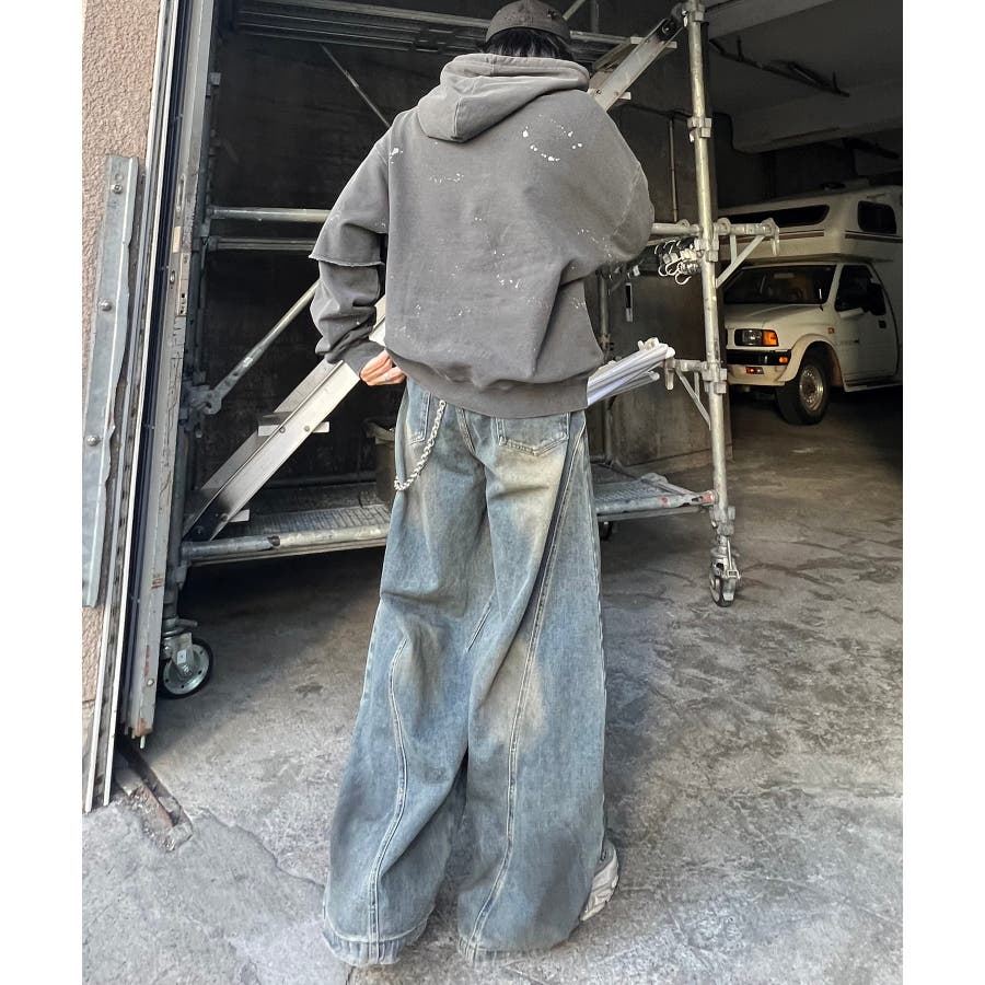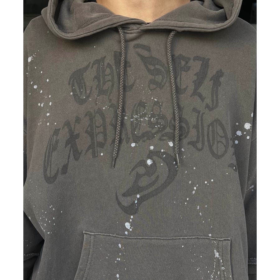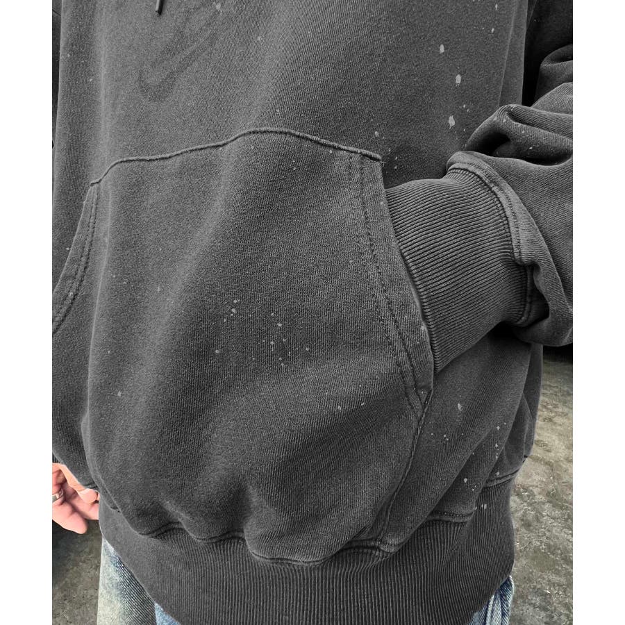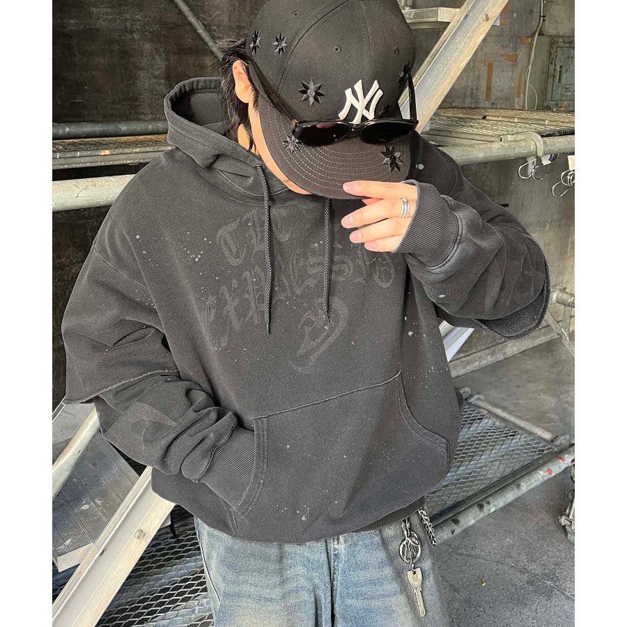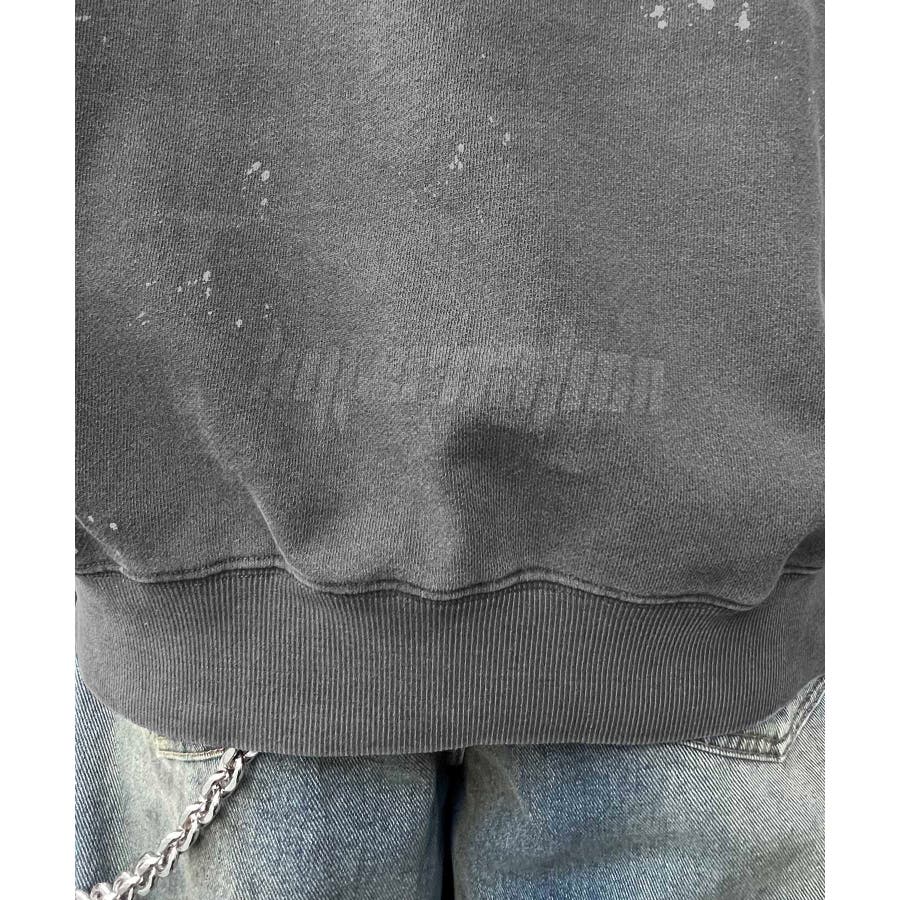 ヴィンテージ風配色とグランジグラフィックが魅力のフェイクレイヤードパーカー。