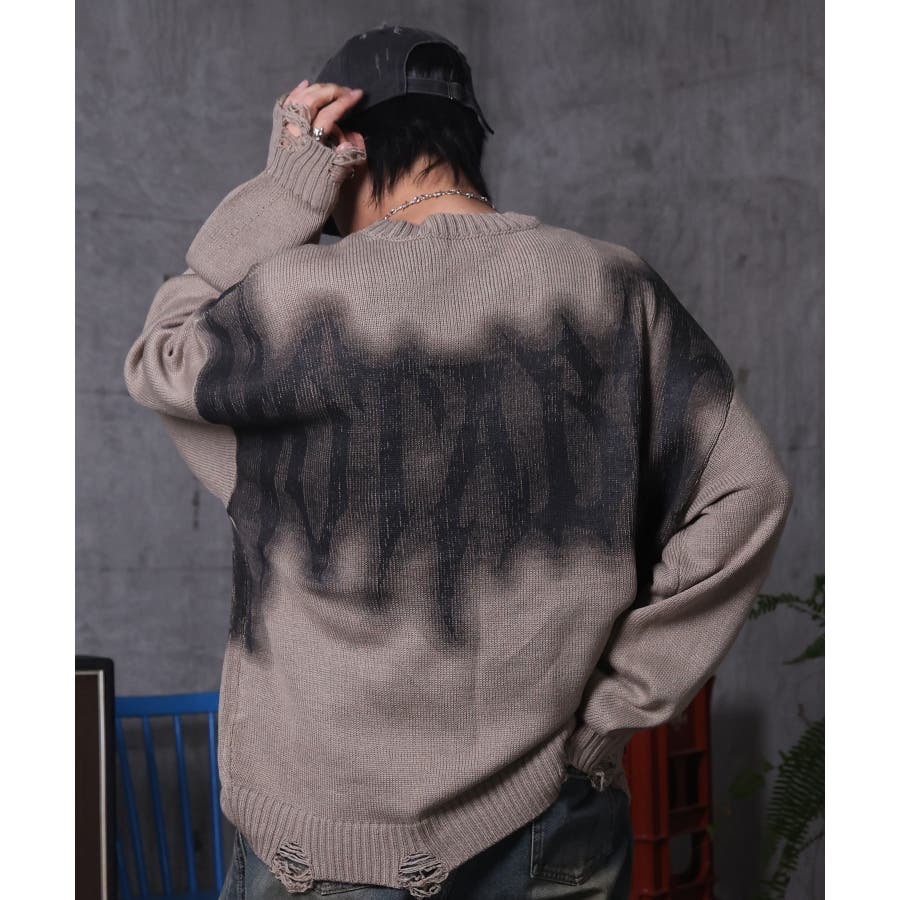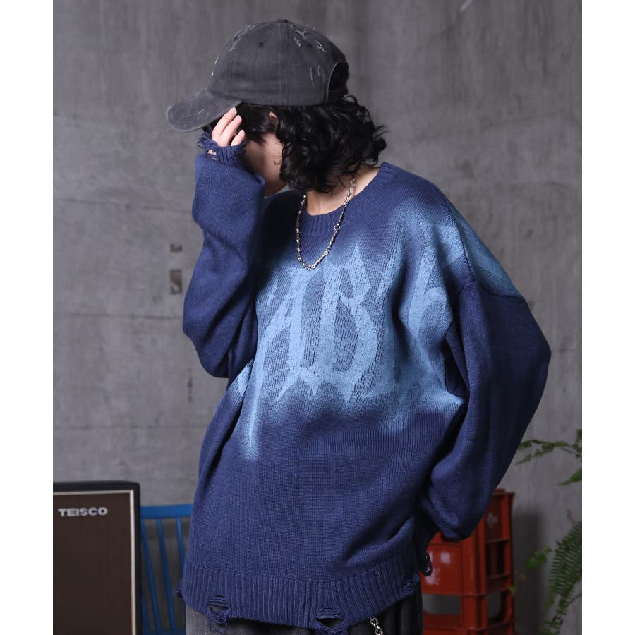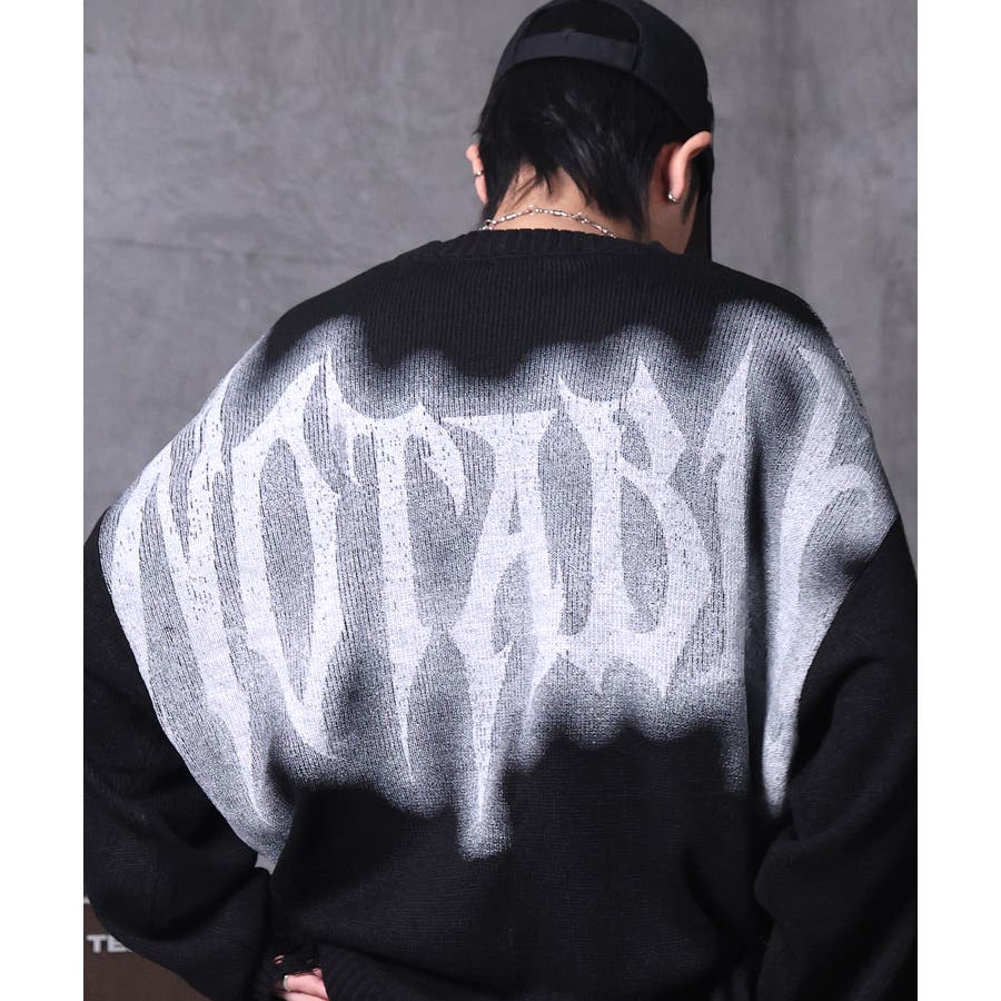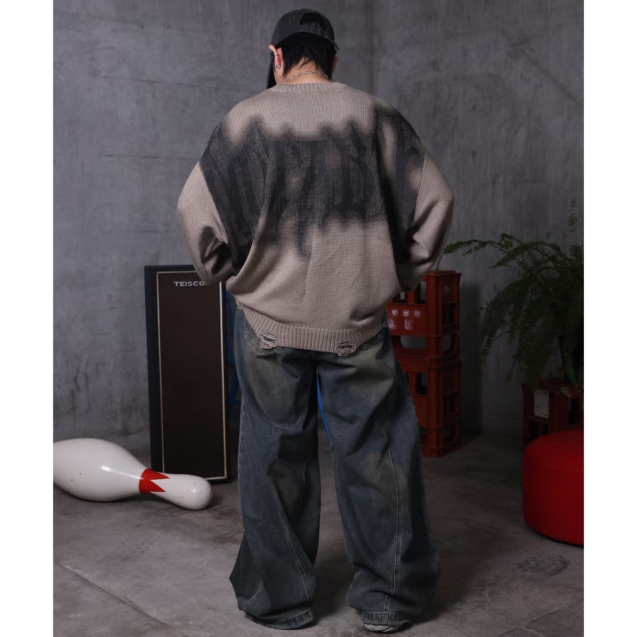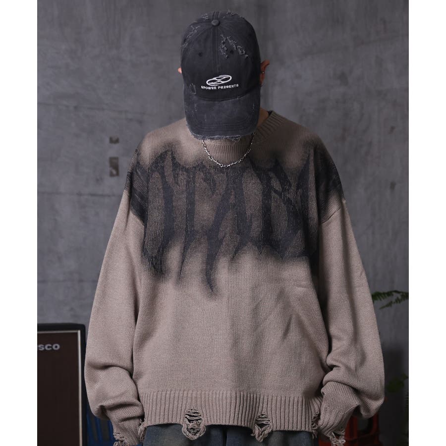武骨なロゴが視線を集める。フェードプリントで表現したグランジロゴニット。
