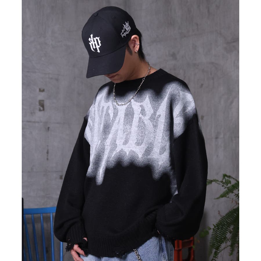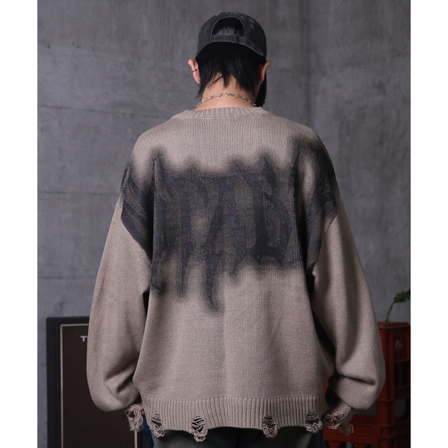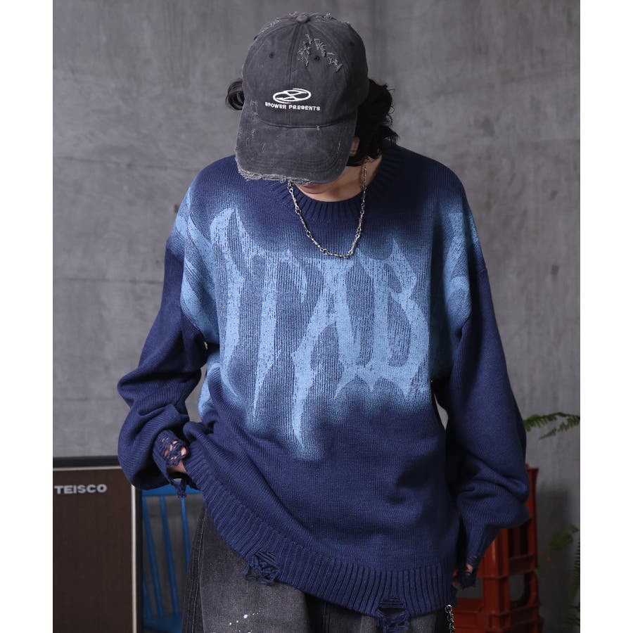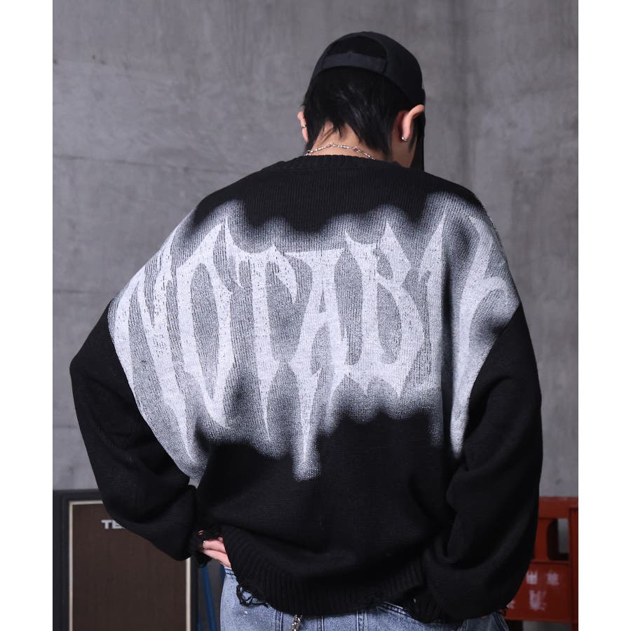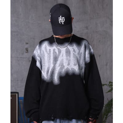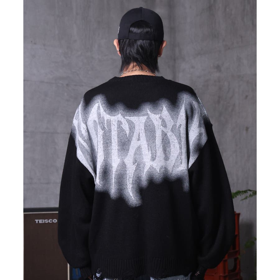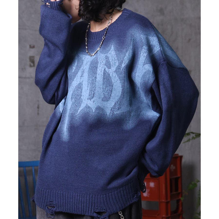 武骨なロゴが視線を集める。フェードプリントで表現したグランジロゴニット。