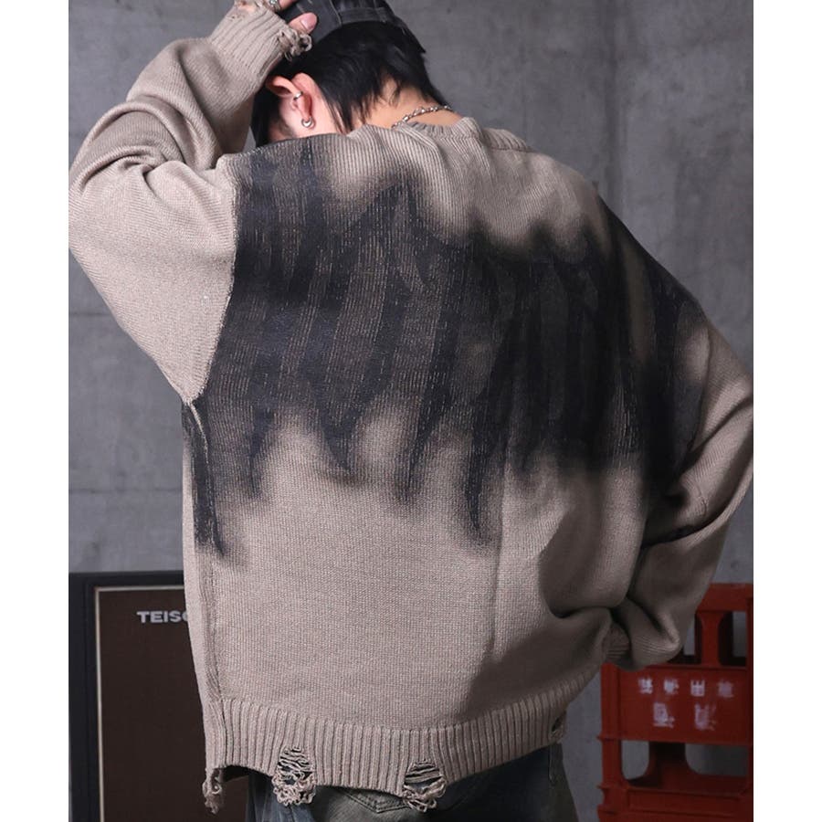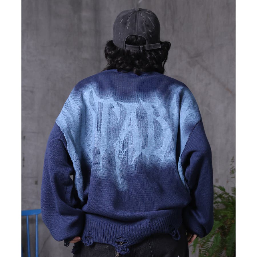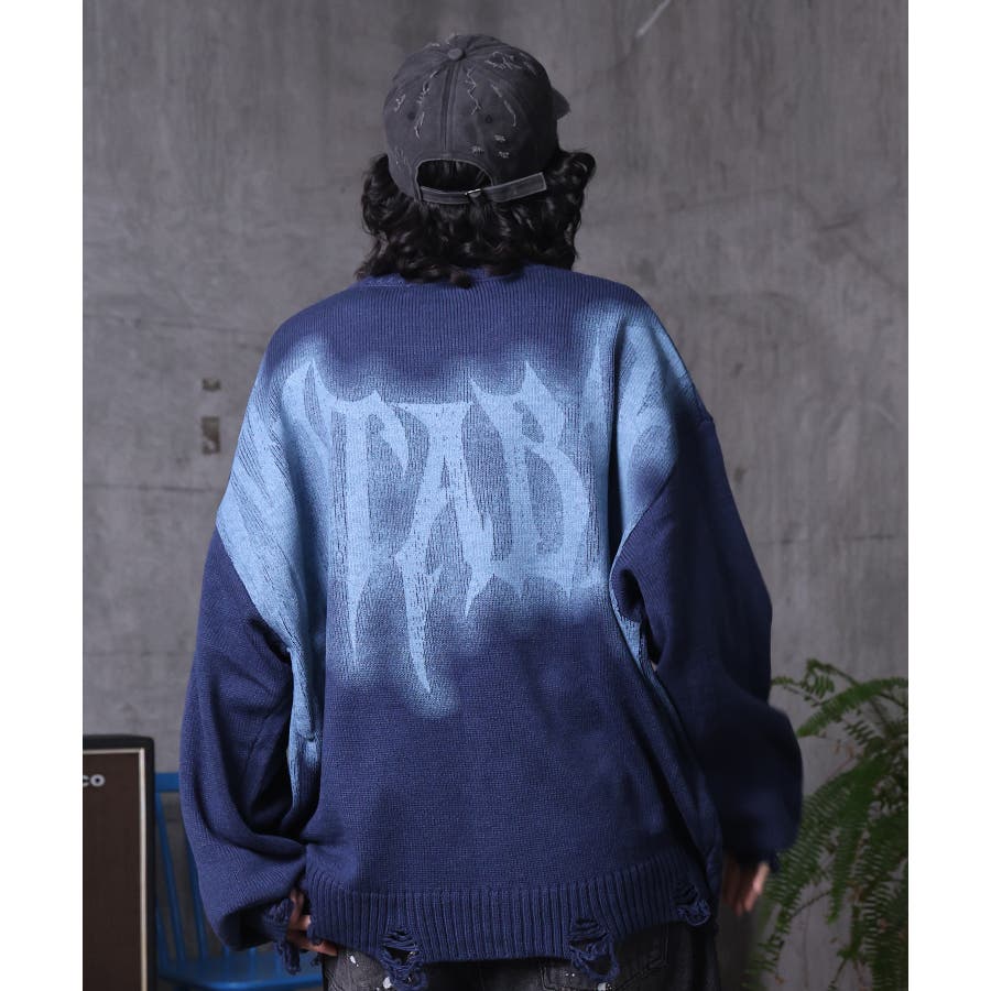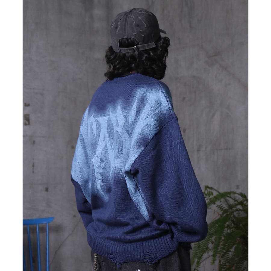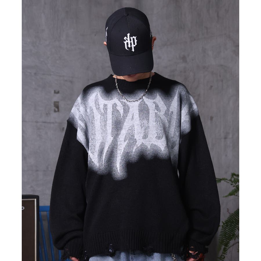 武骨なロゴが視線を集める。フェードプリントで表現したグランジロゴニット。