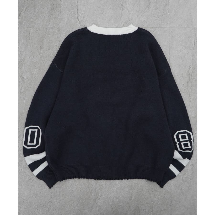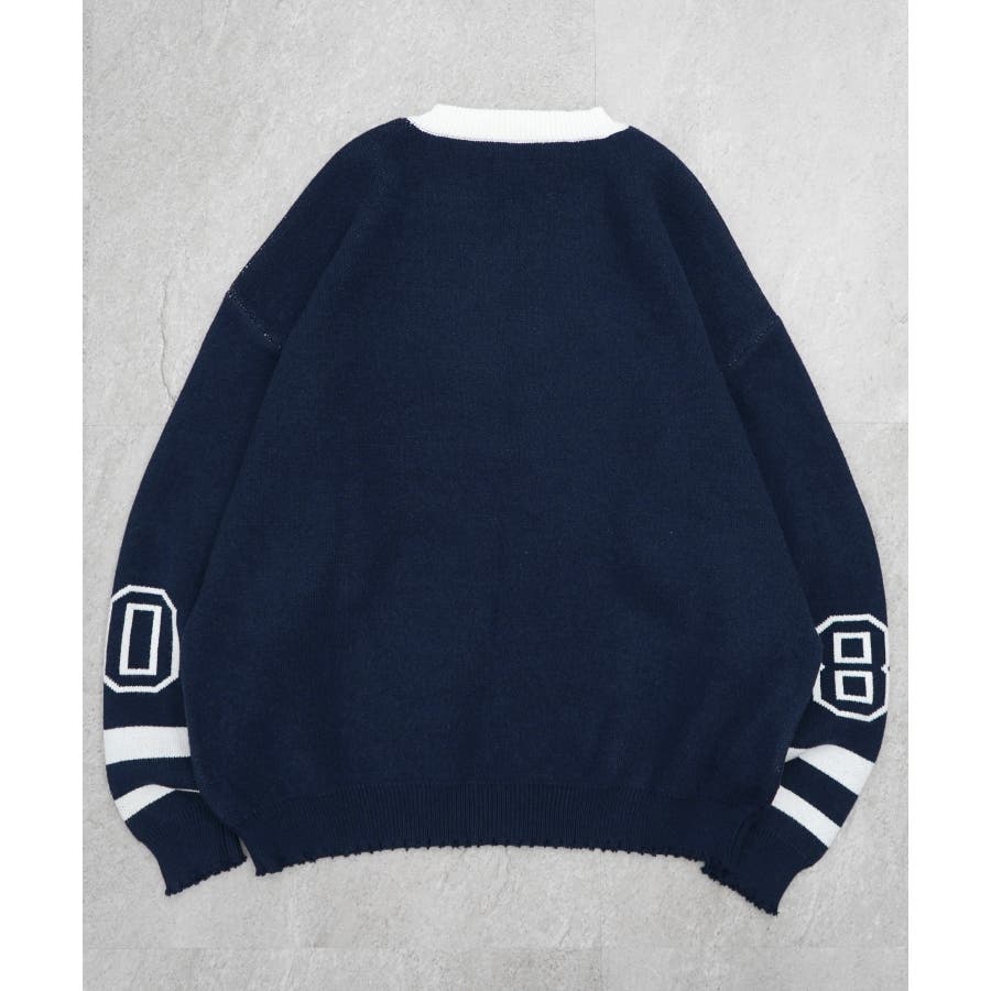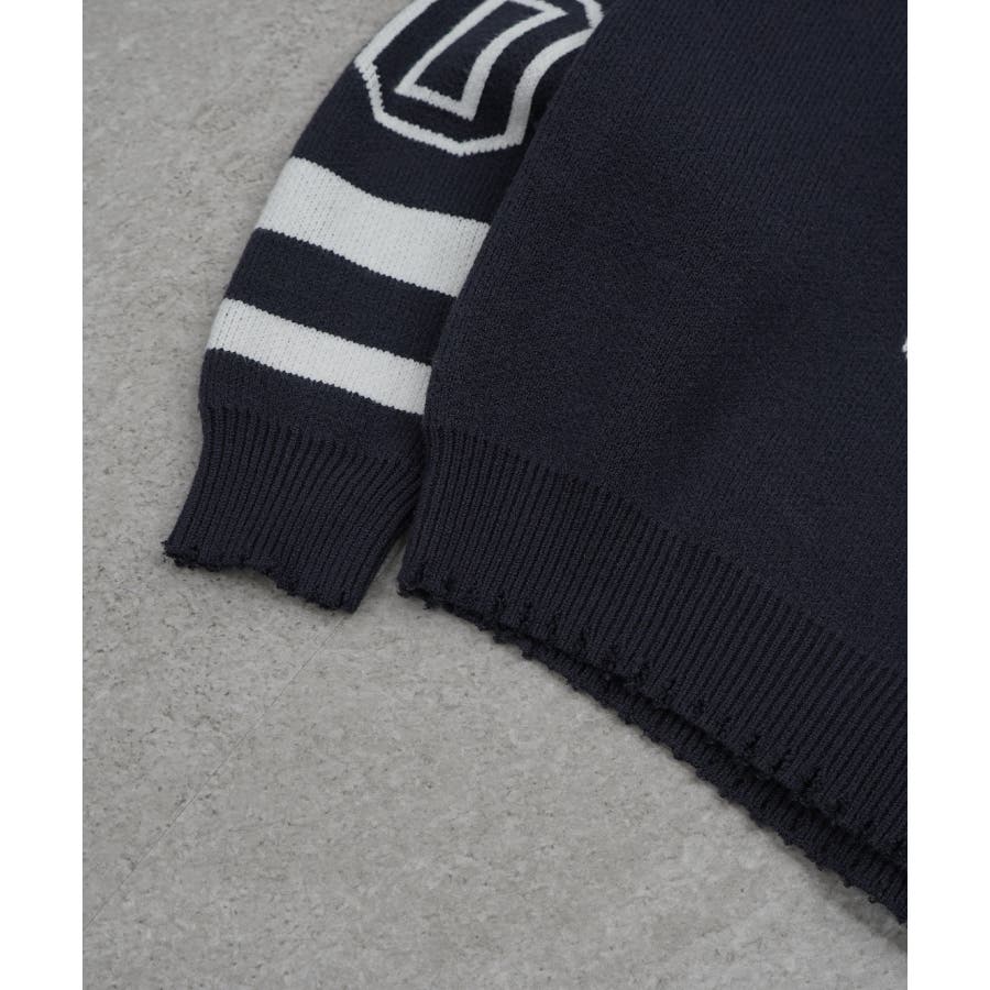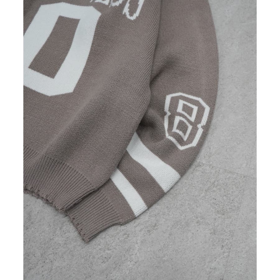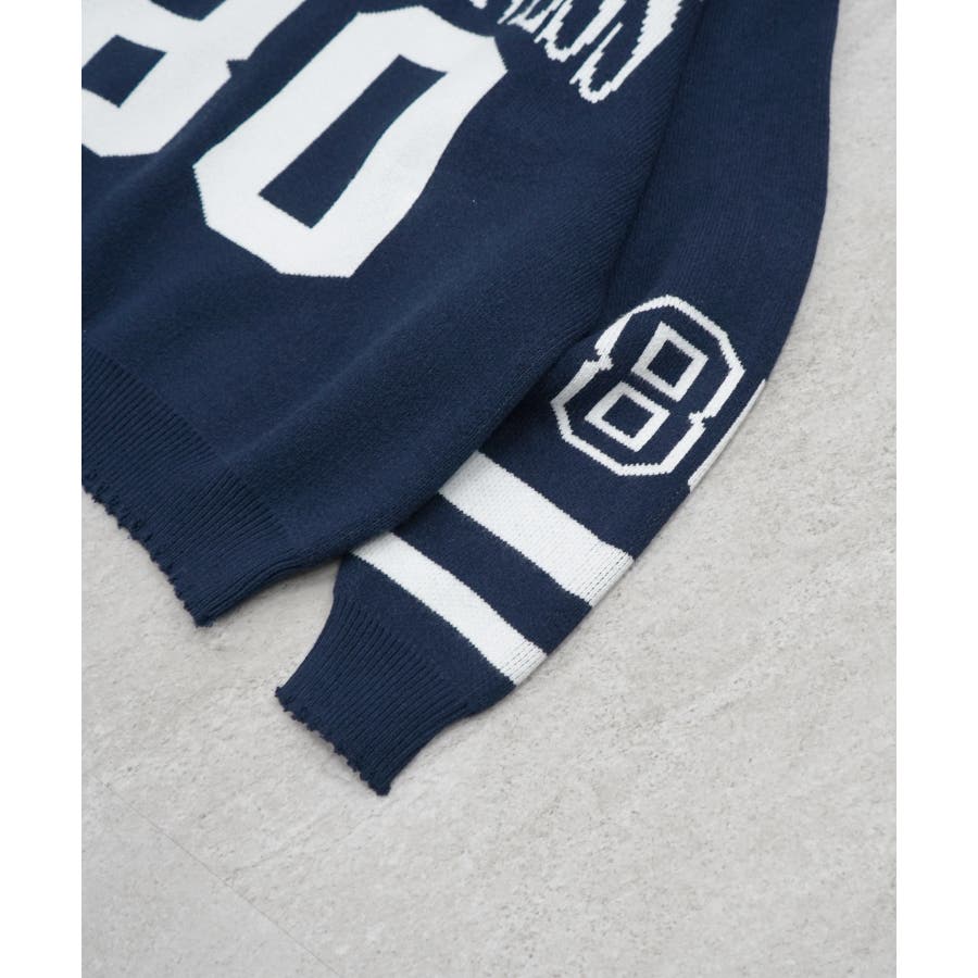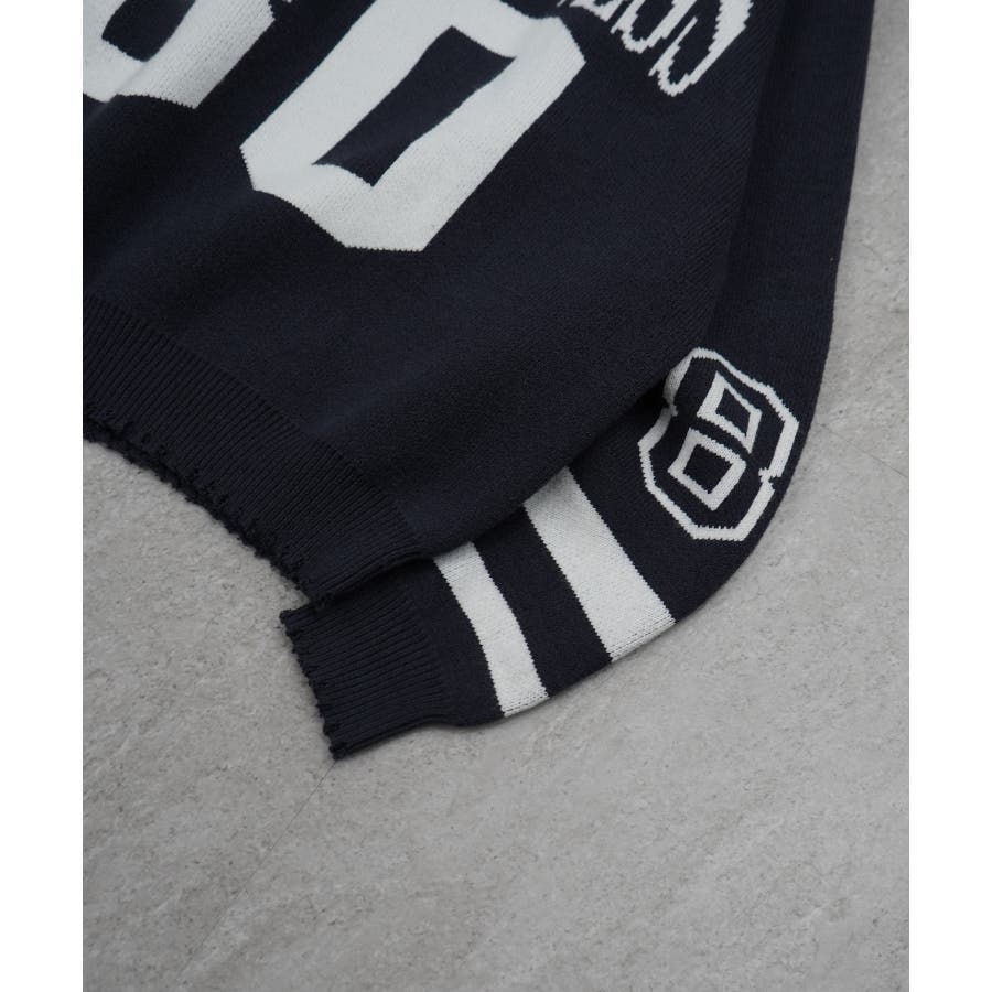 フロントにはロゴとナンバリングを大胆に配置。袖にはライン柄を編み込み、スポーティーな雰囲気を強調しています。