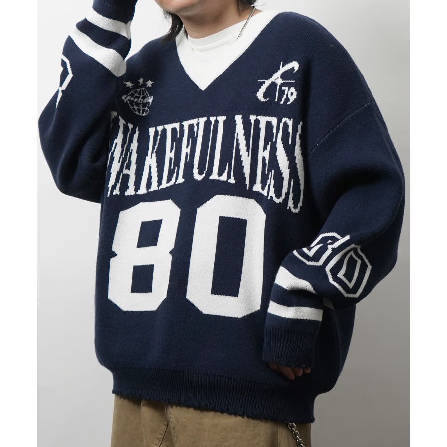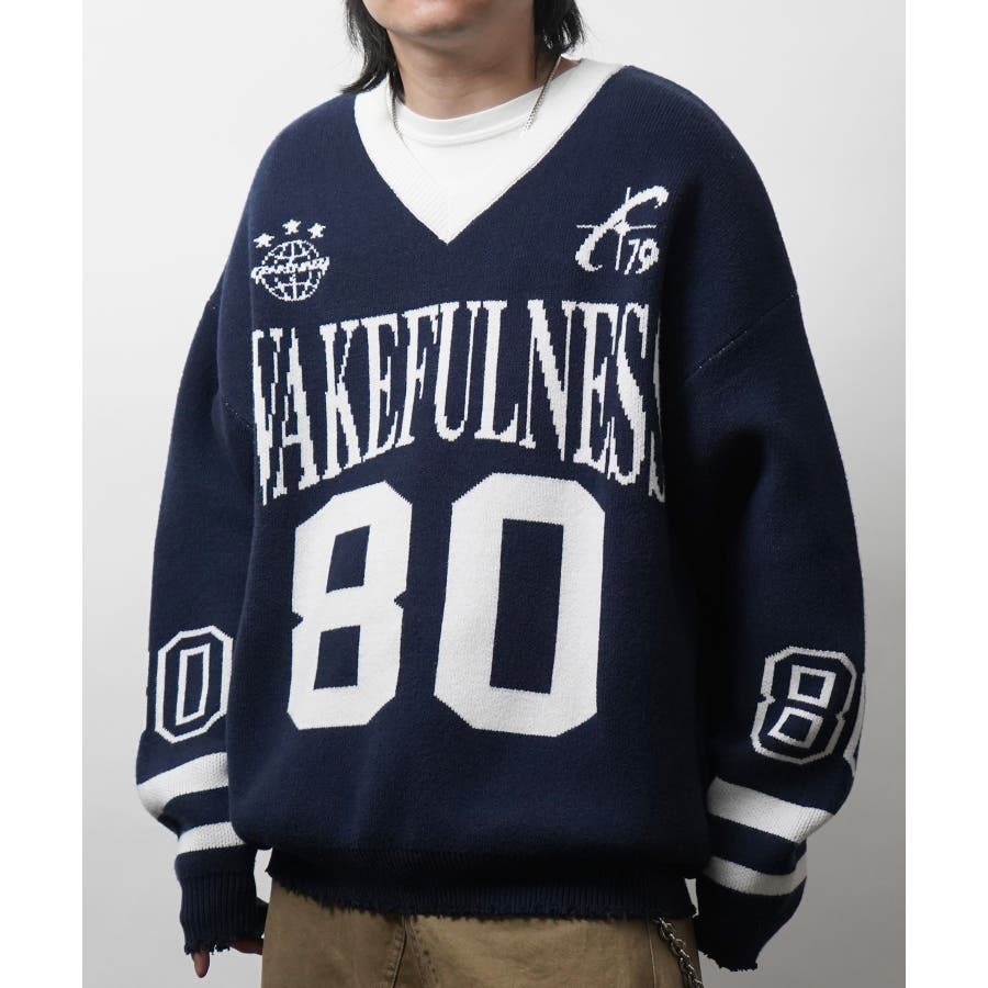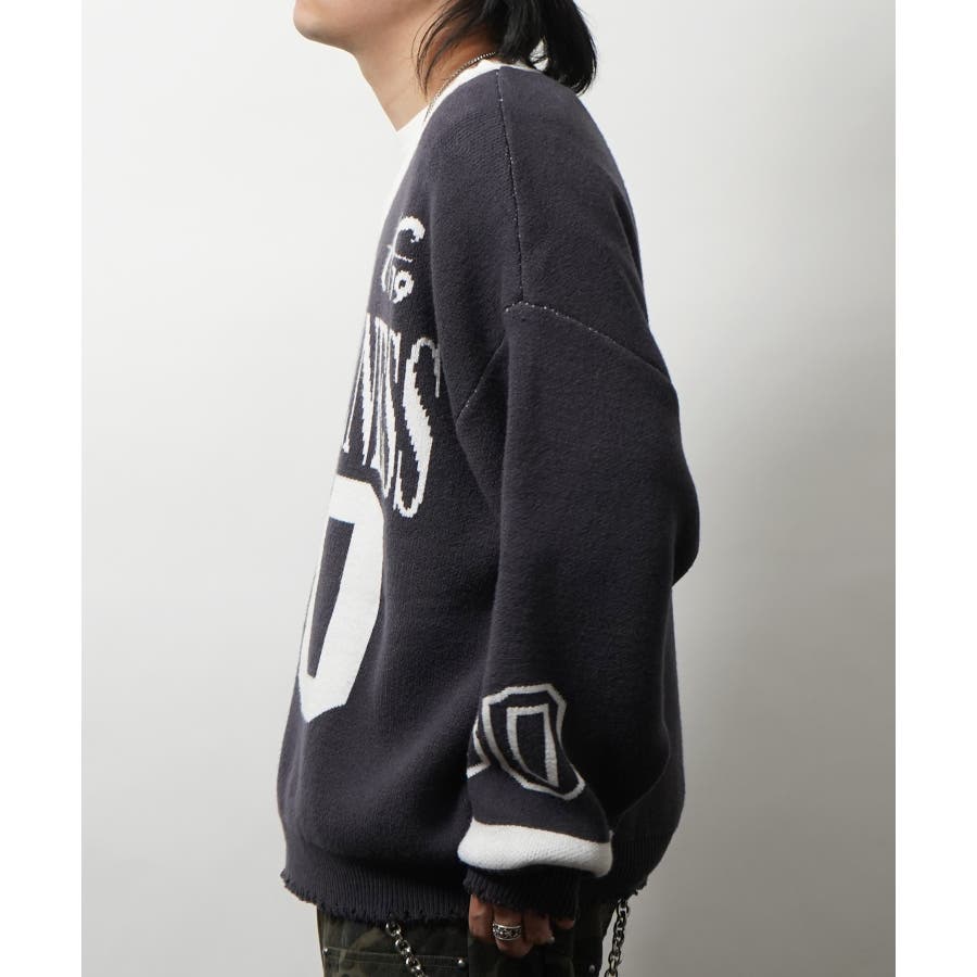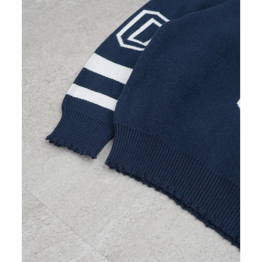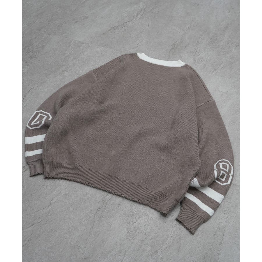 フロントにはロゴとナンバリングを大胆に配置。袖にはライン柄を編み込み、スポーティーな雰囲気を強調しています。