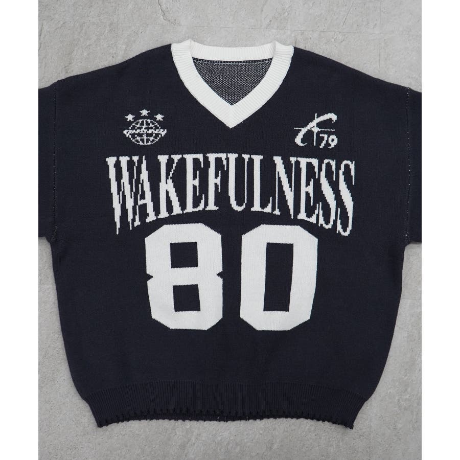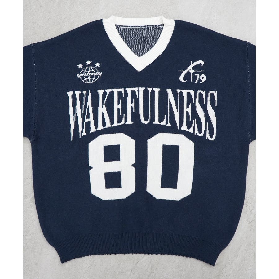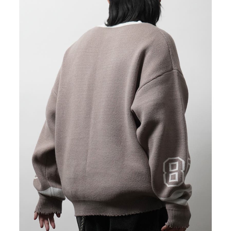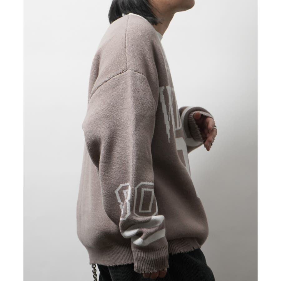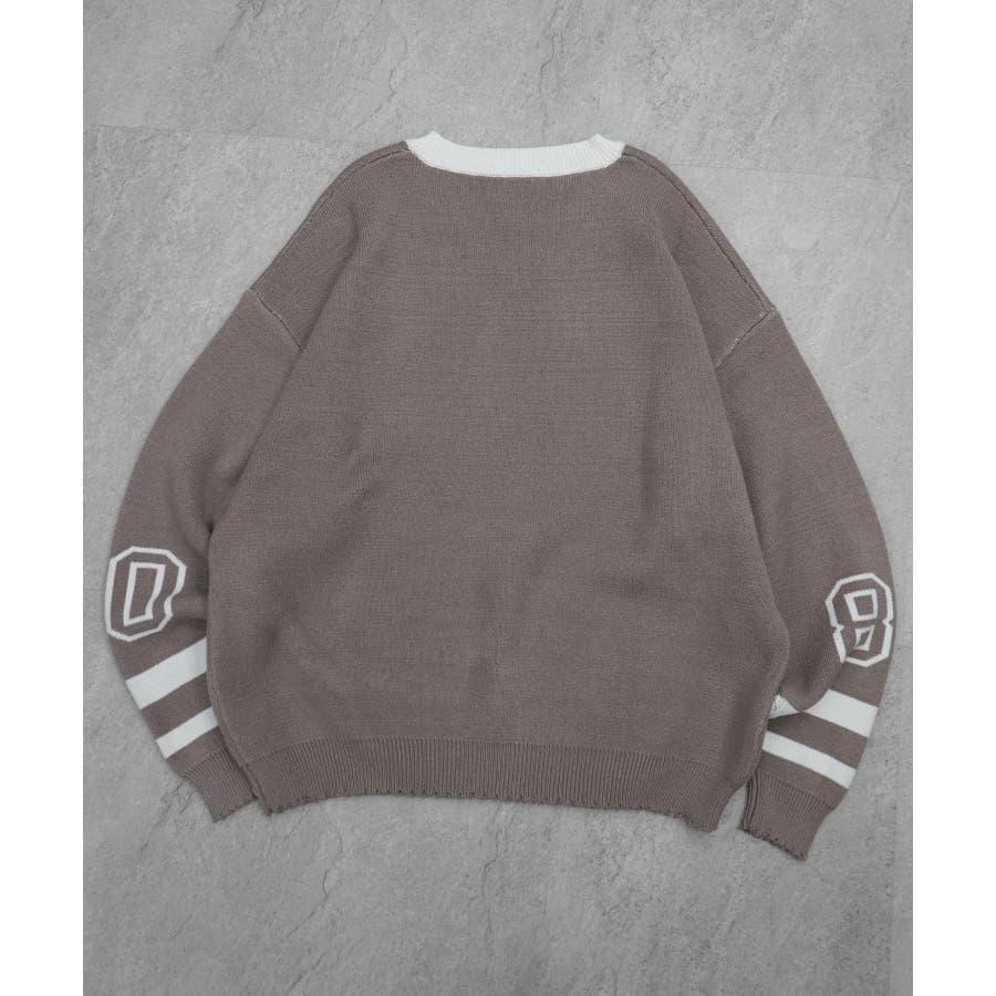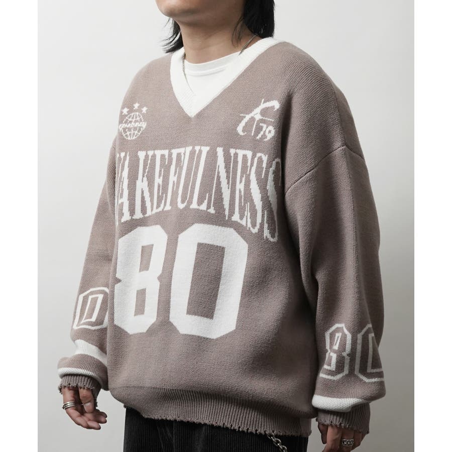 フロントにはロゴとナンバリングを大胆に配置。袖にはライン柄を編み込み、スポーティーな雰囲気を強調しています。