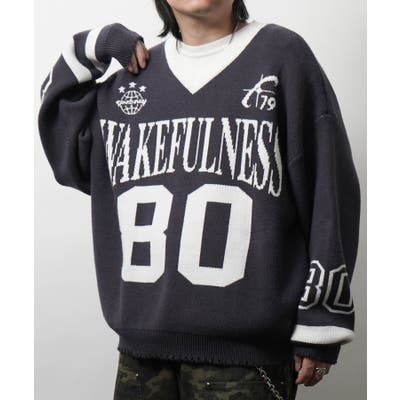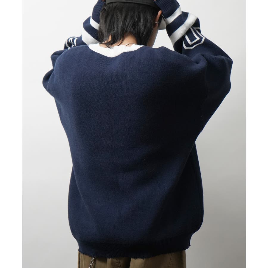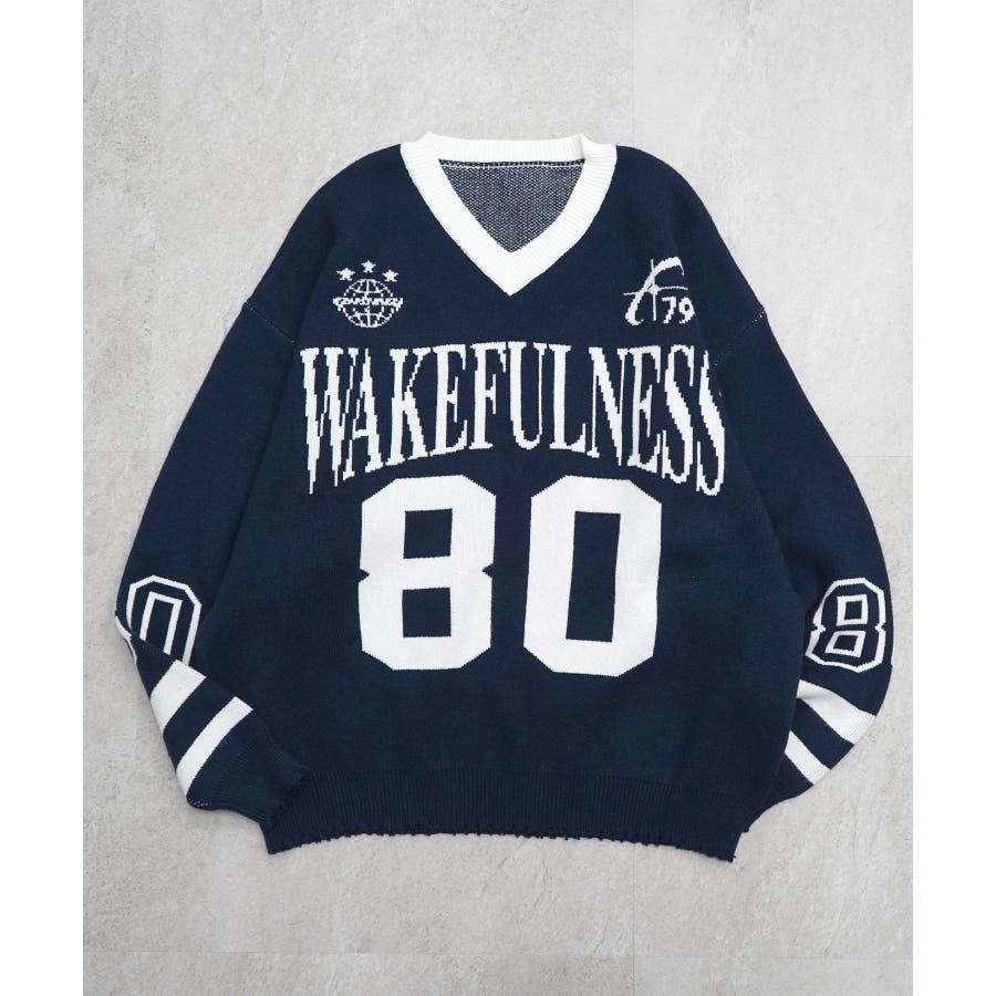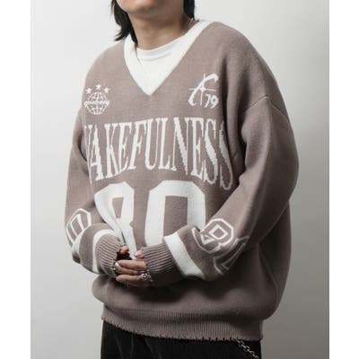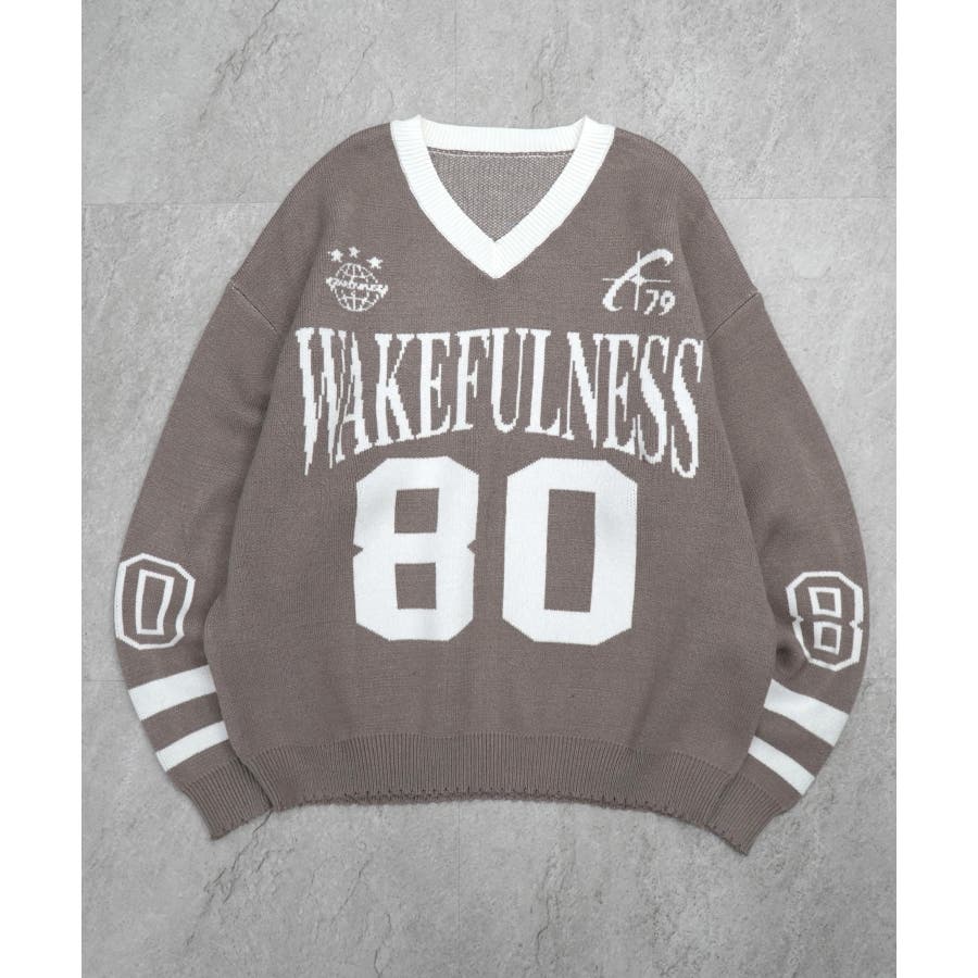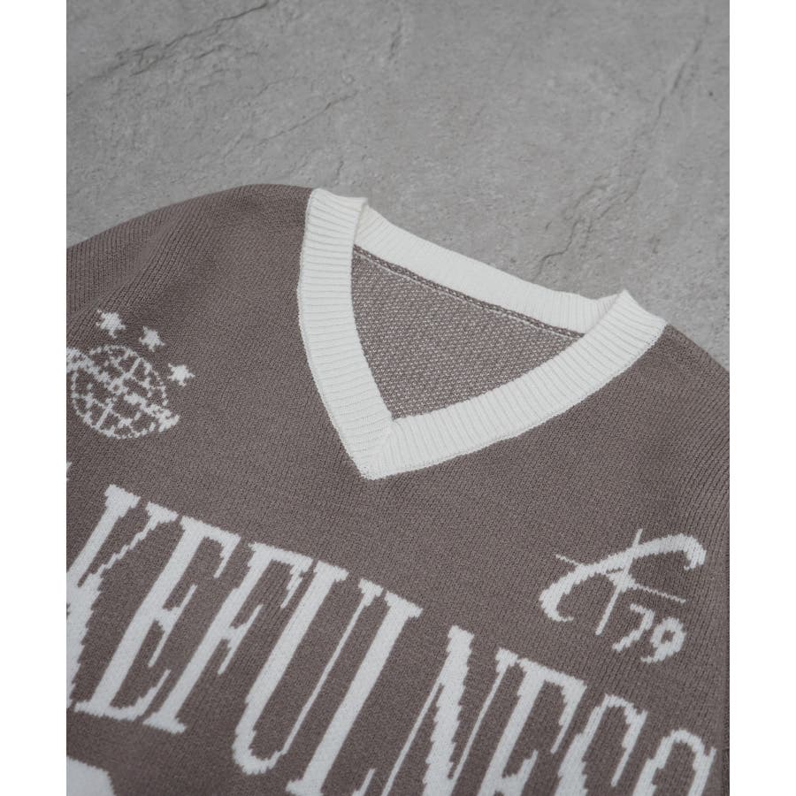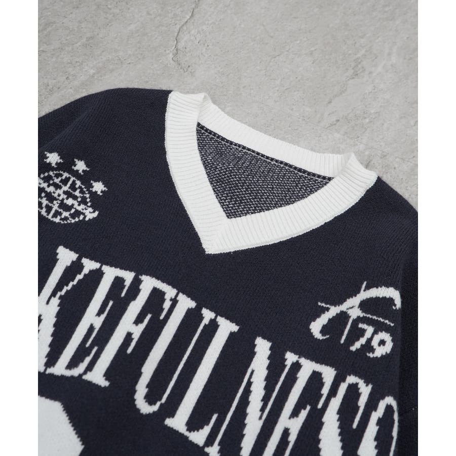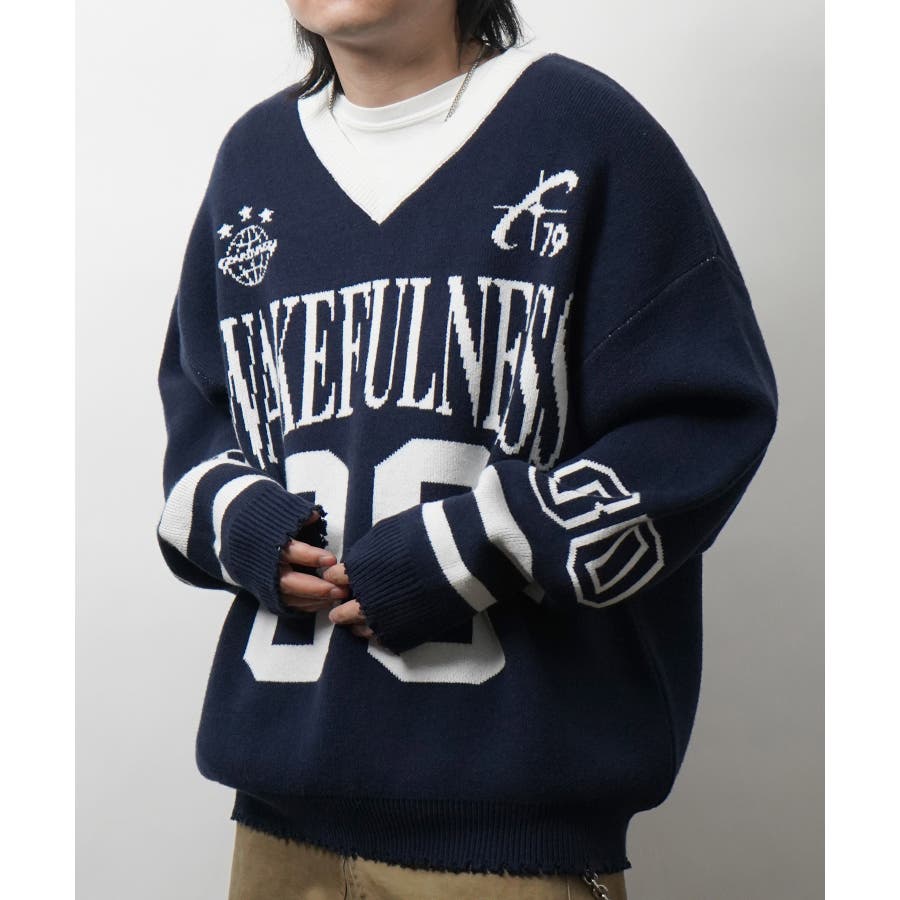カレッジスタイルにY2Kの遊び心をプラス。Vネックとスポーティーなロゴが主役のニット。