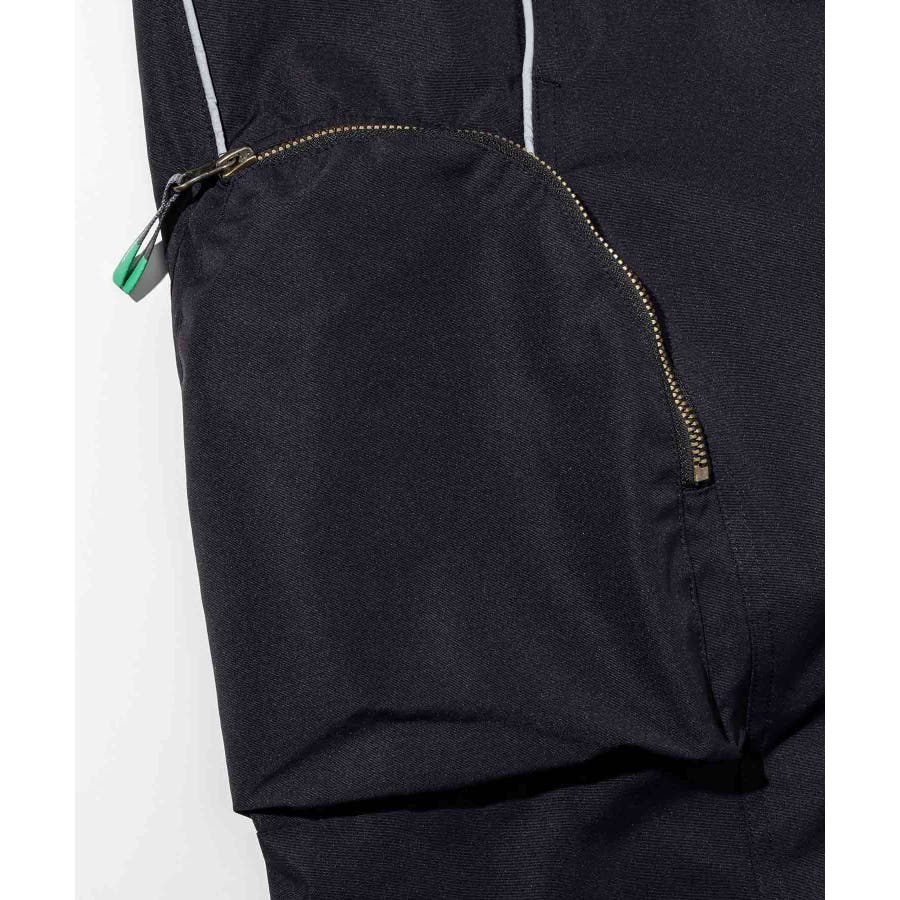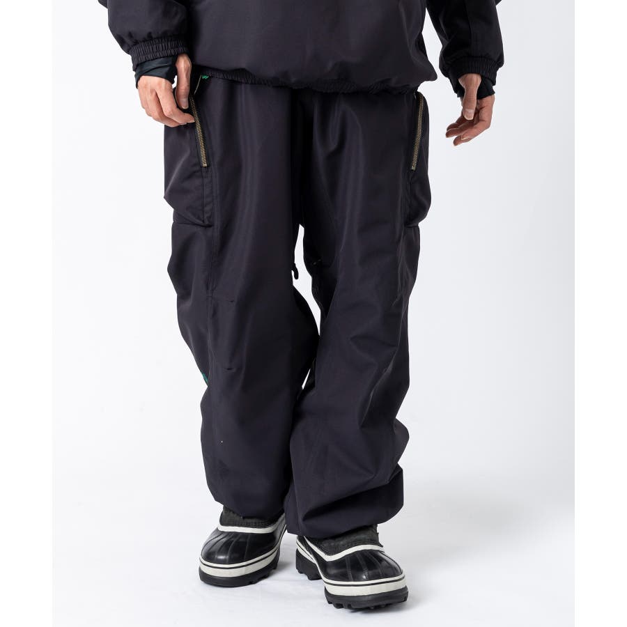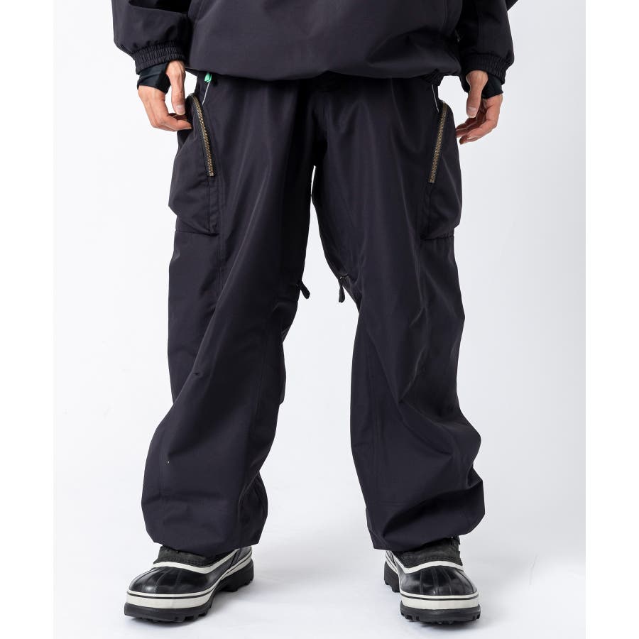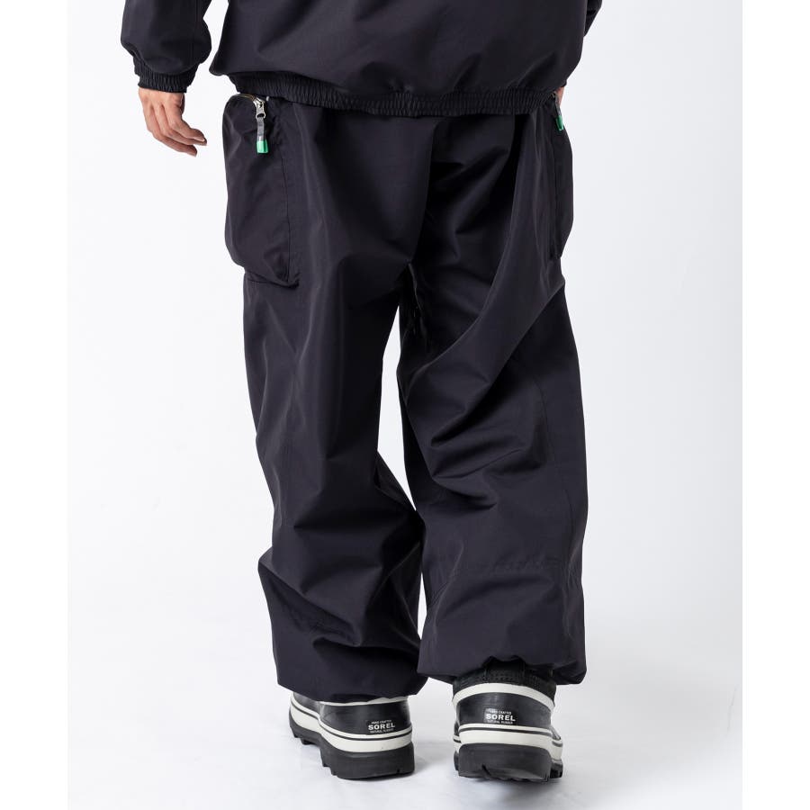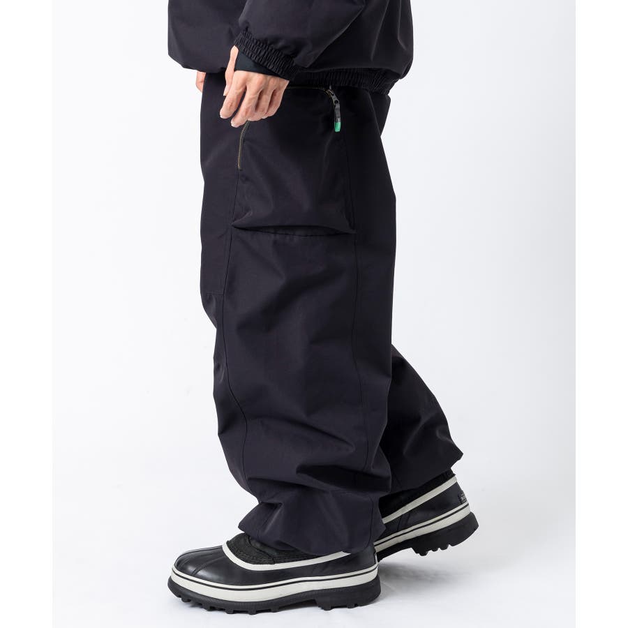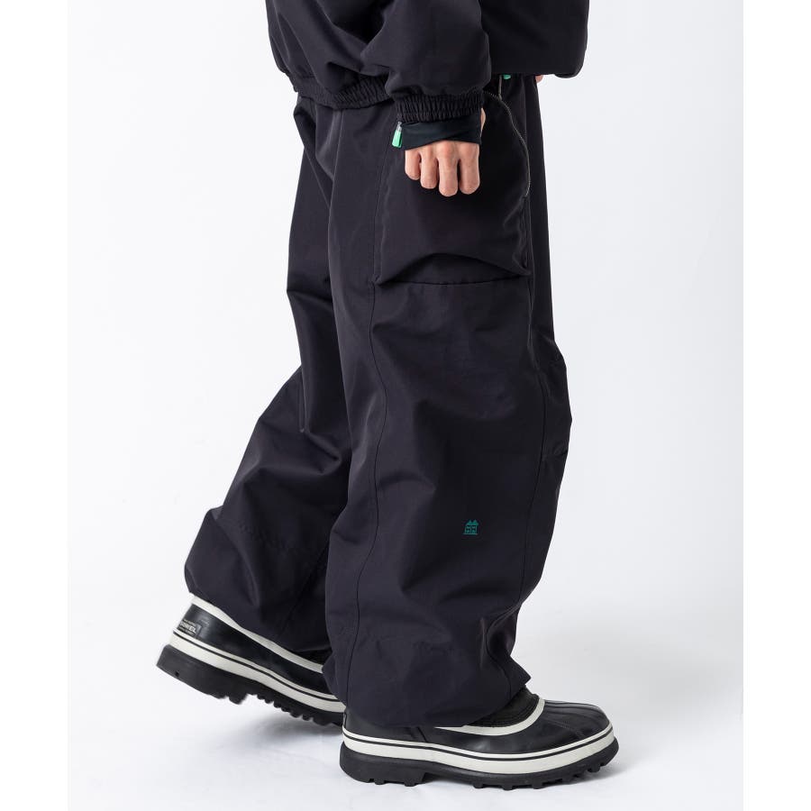 ワイドシルエットで動きやすく、サイドにジップ付きのカーゴポケットを配したスノーパンツ。