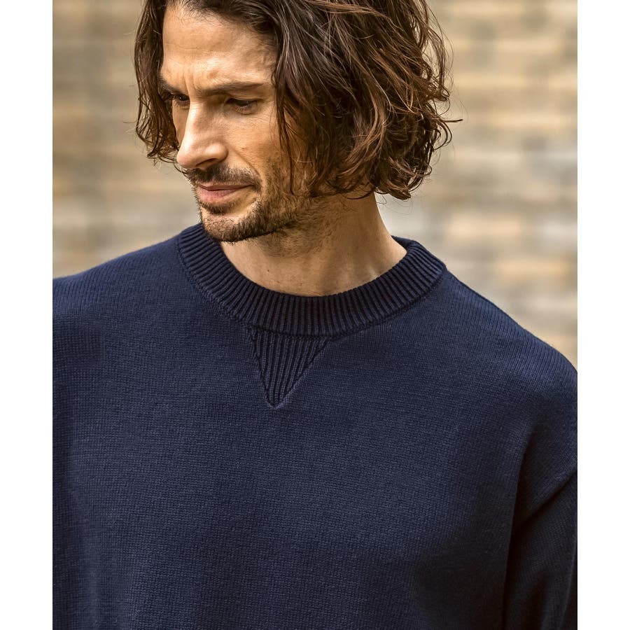 フロントの襟ぐりにはリブ編みで三角ガゼットを配し、スウェットを思わせる遊び心をプラス。