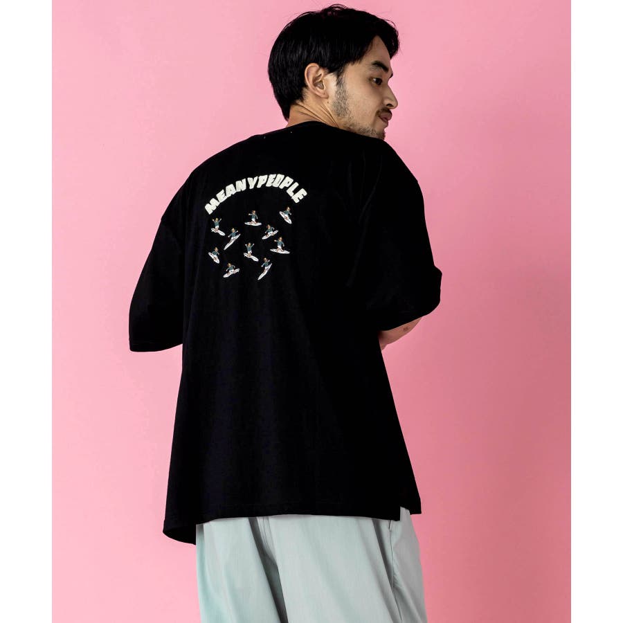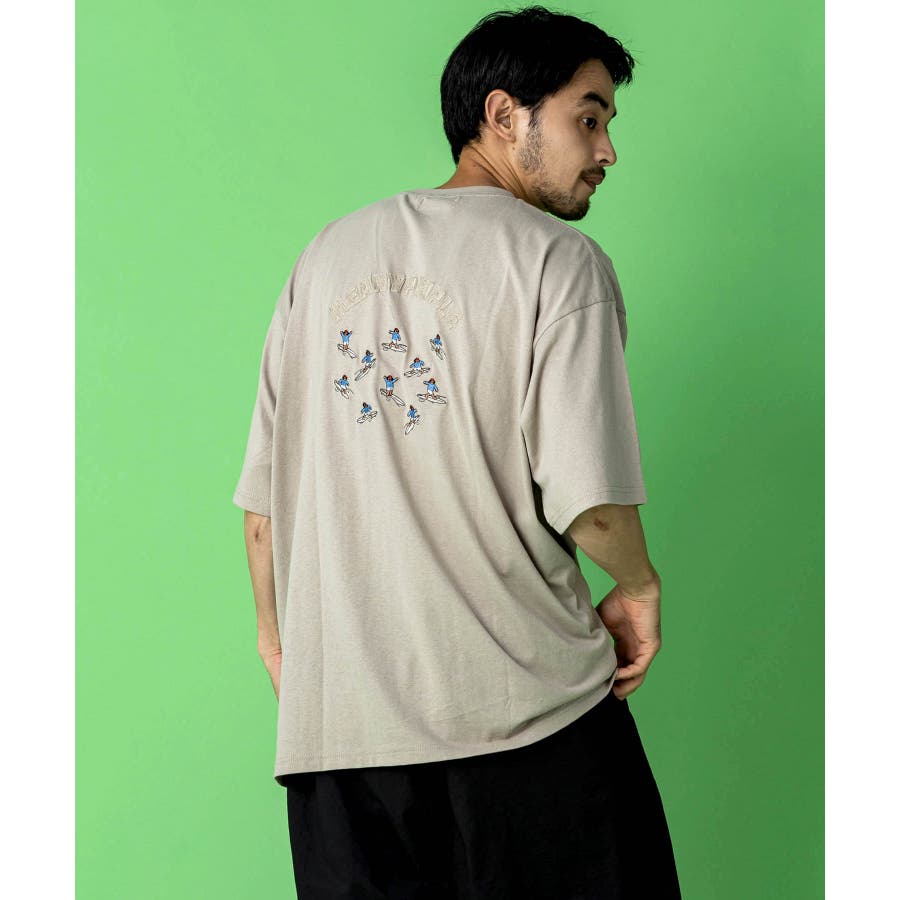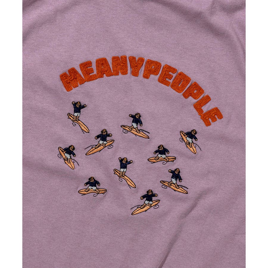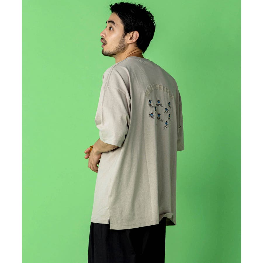 サーフボードに乗った熊の可愛らしいイラストが刺繍されたTシャツです。