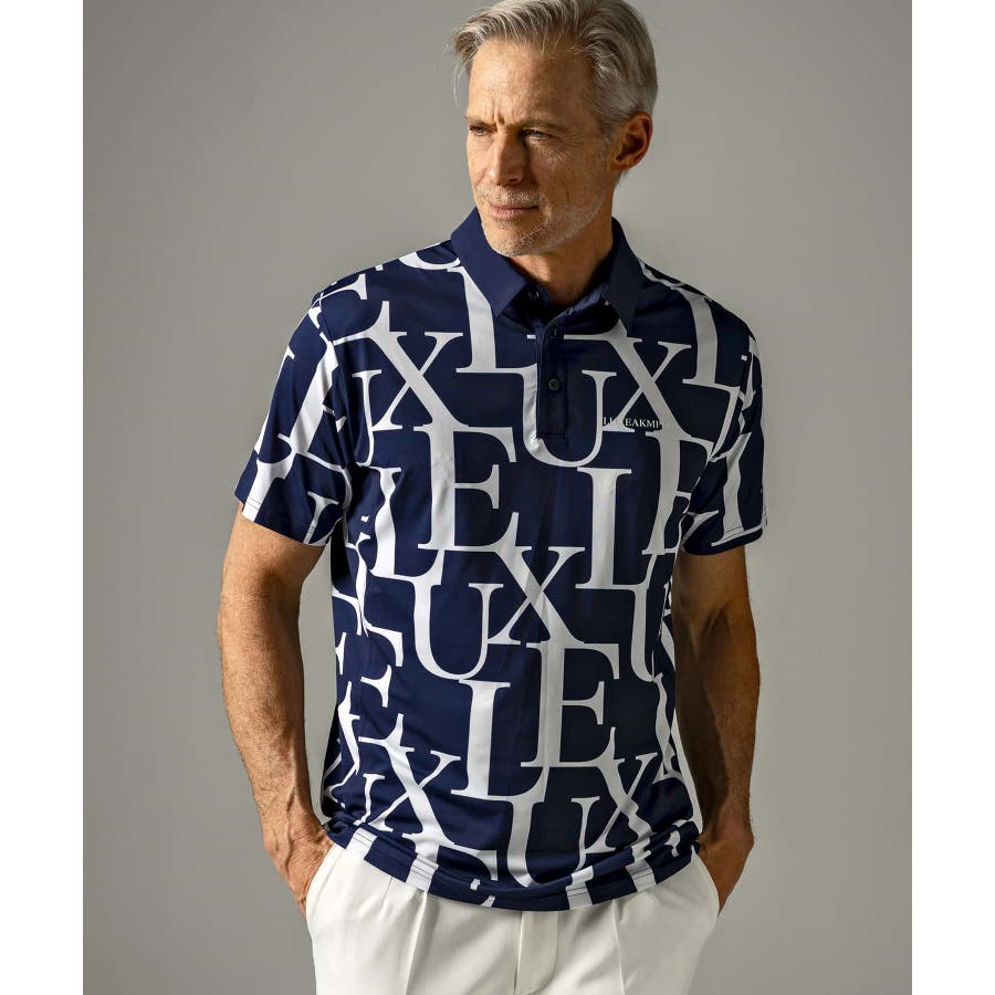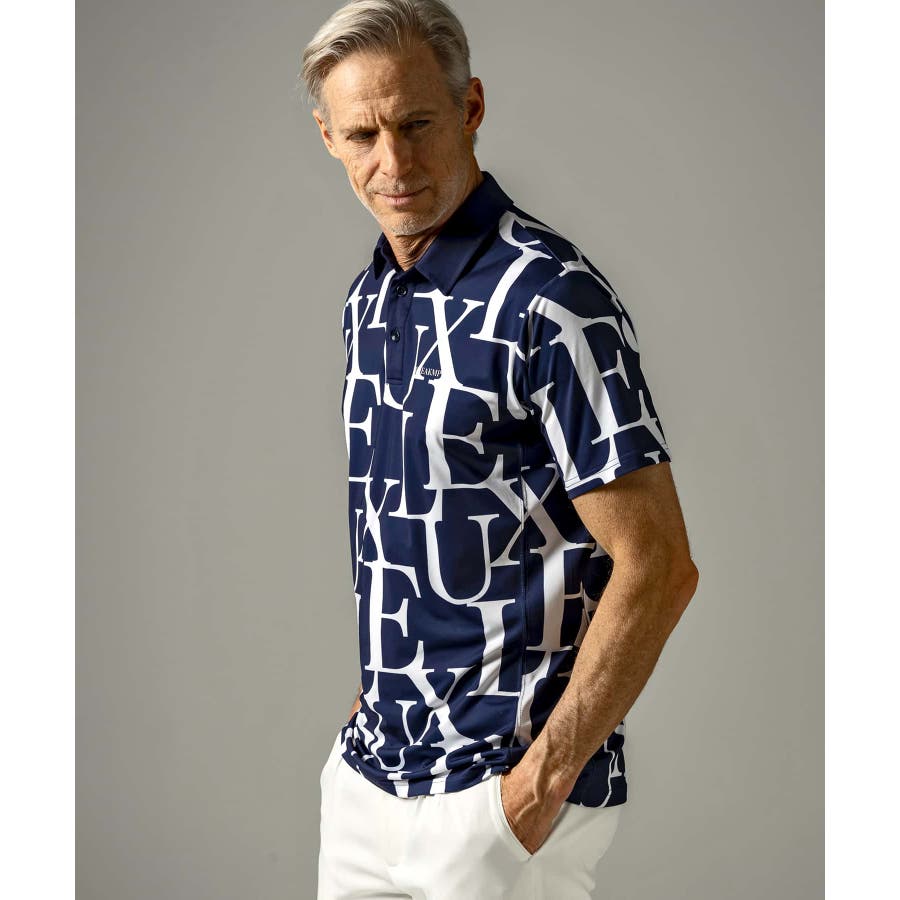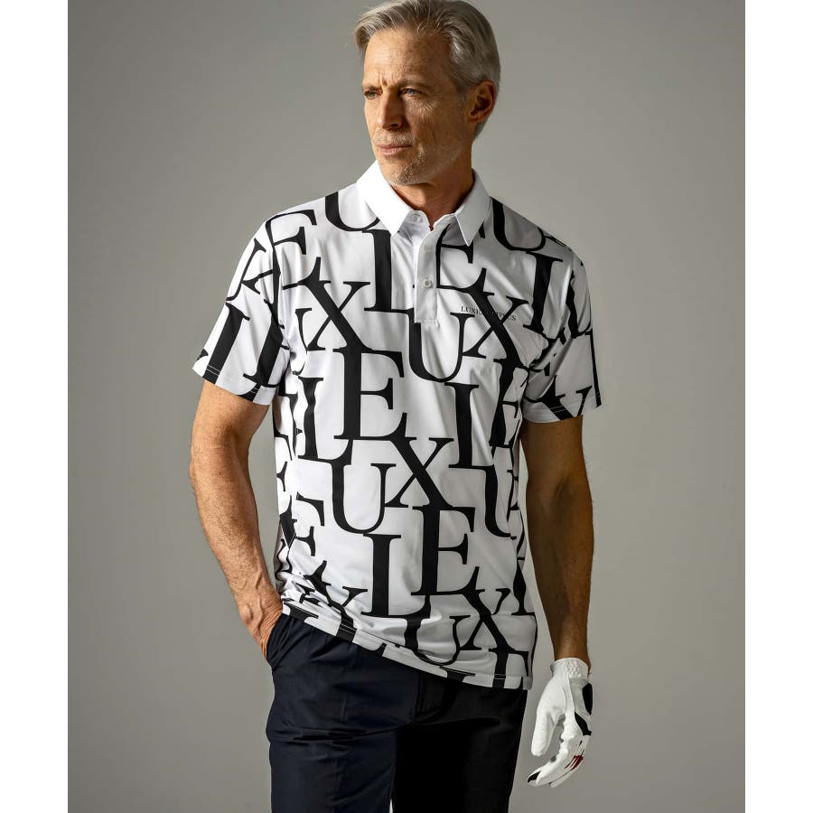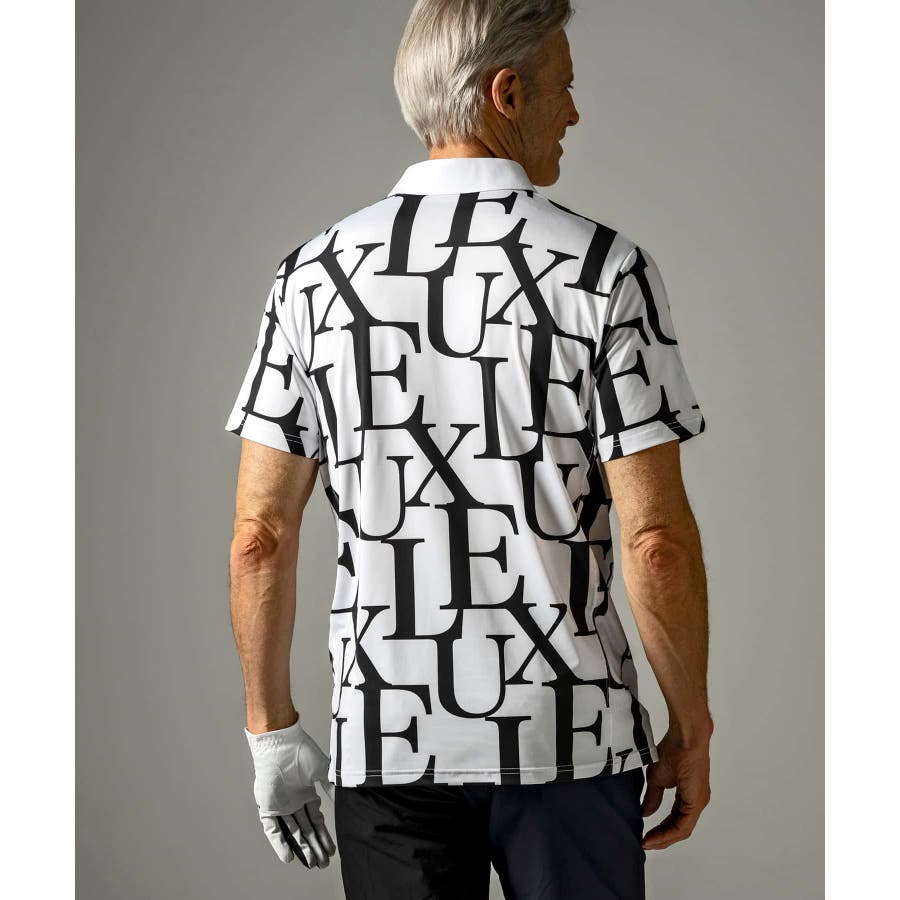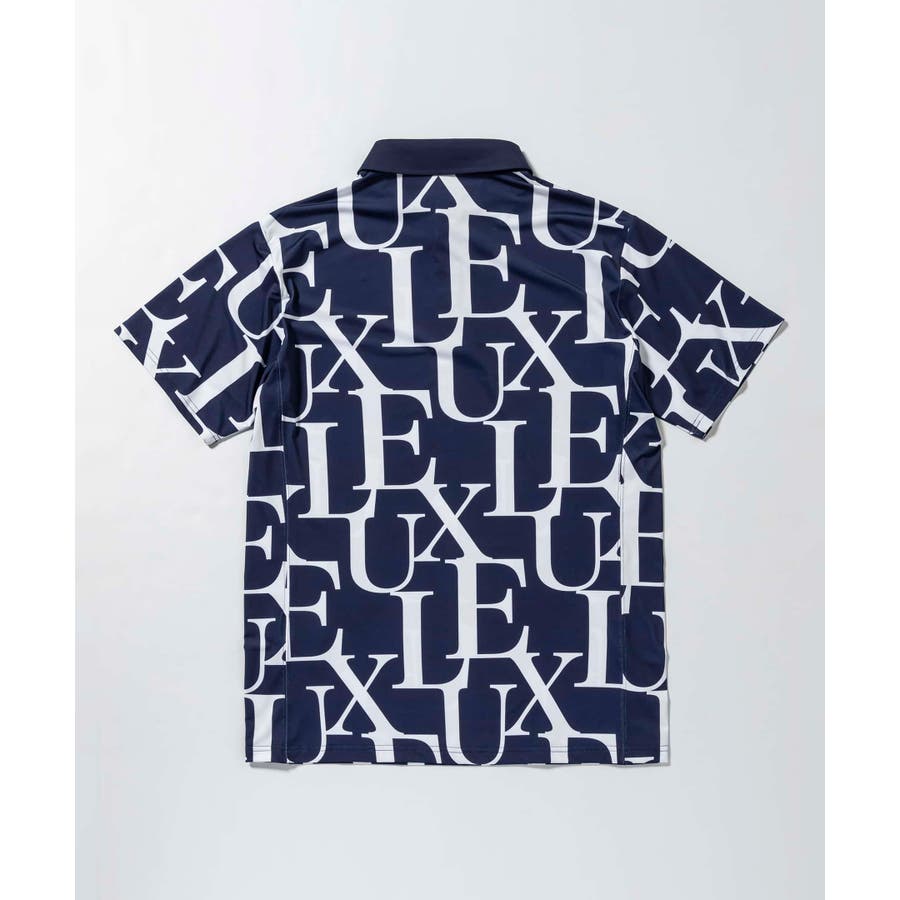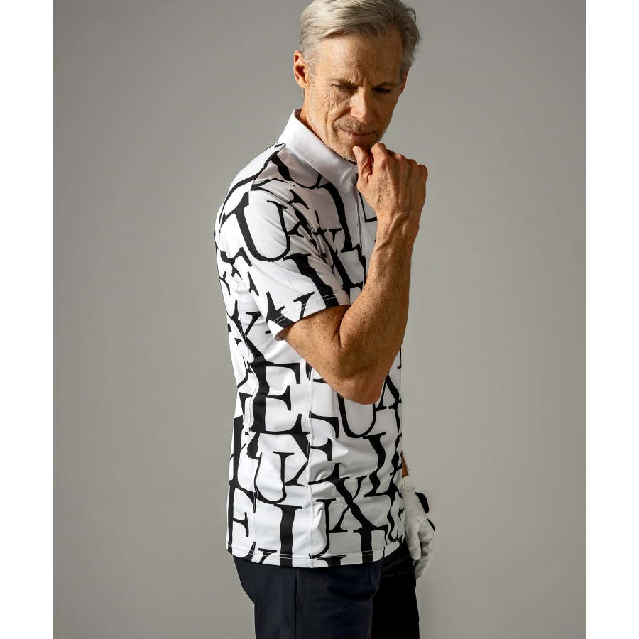 ブランドロゴを全面に配置した総柄デザインが目を惹くポロシャツ。