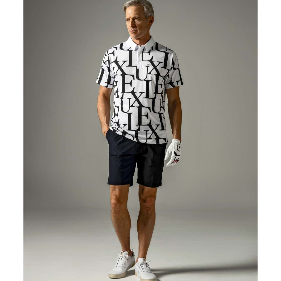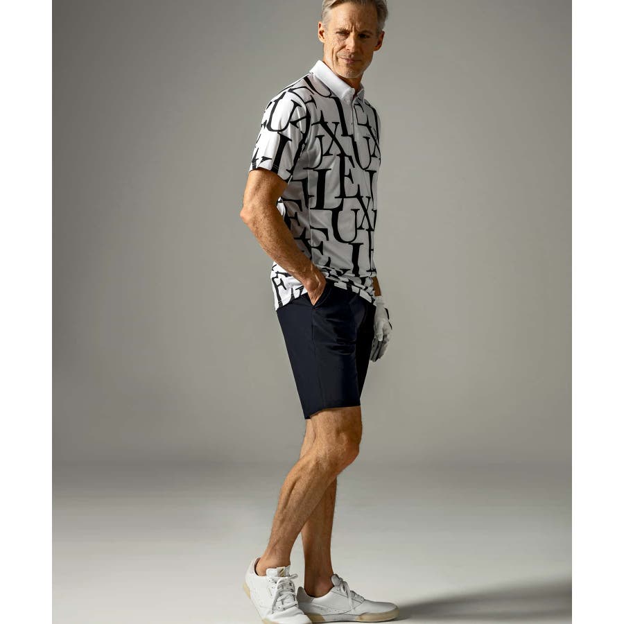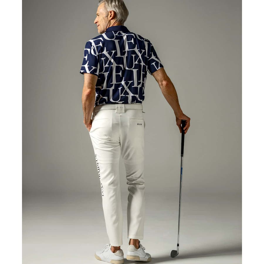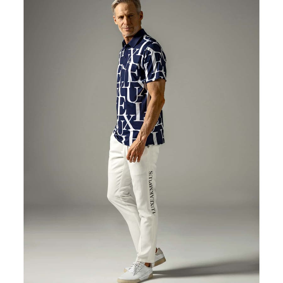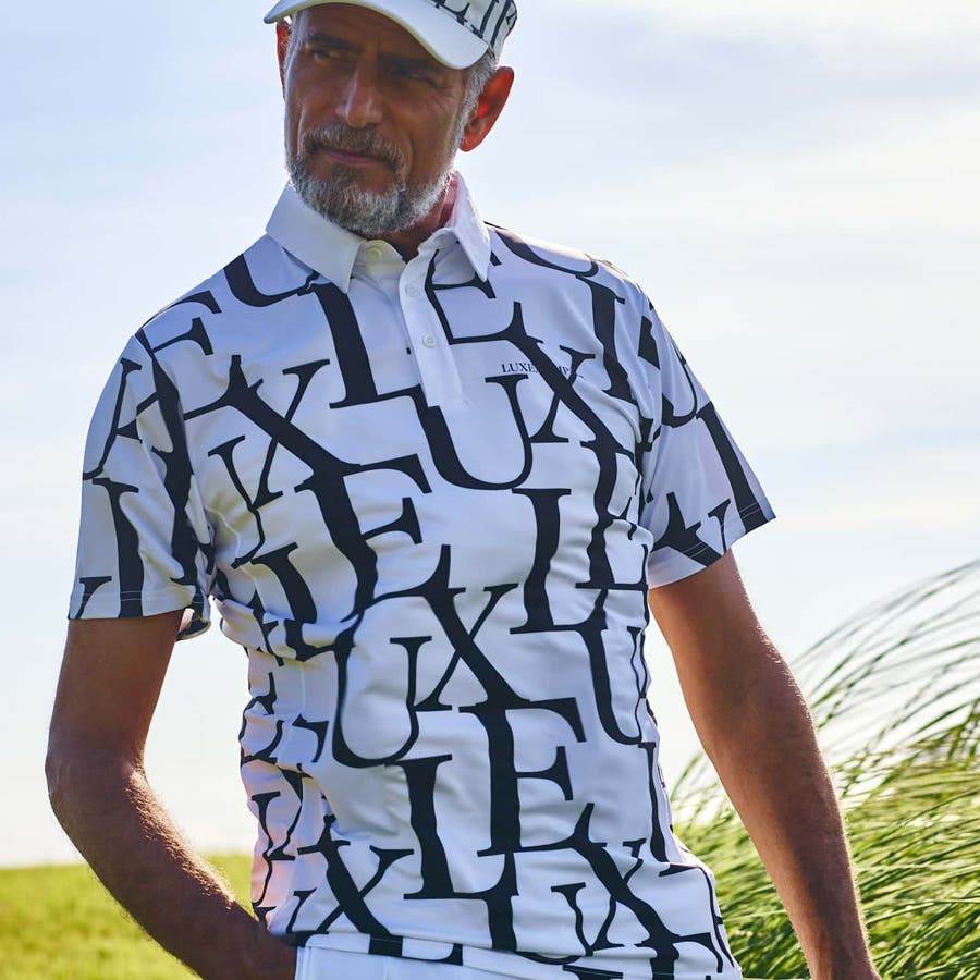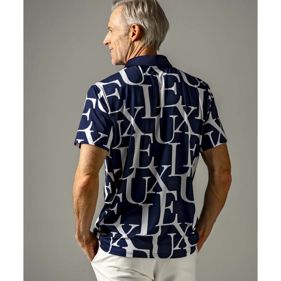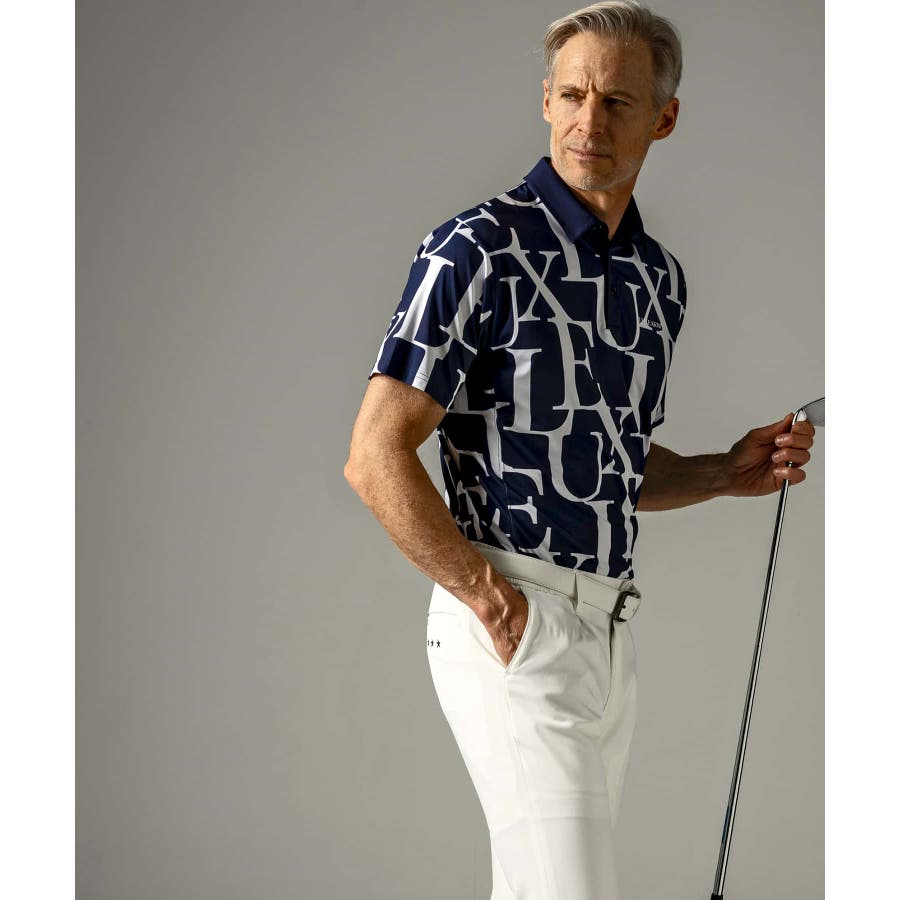 ブランドロゴを全面に配置した総柄デザインが目を惹くポロシャツ。