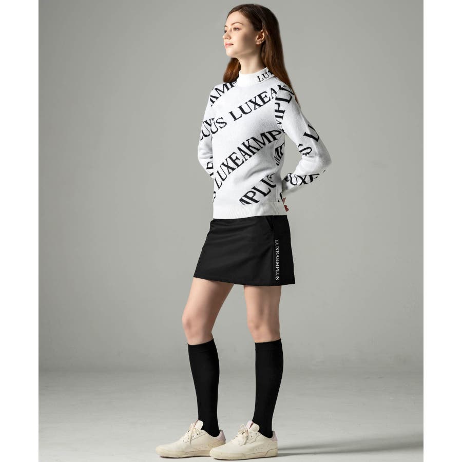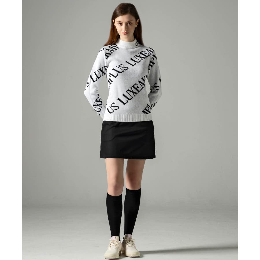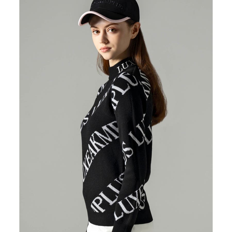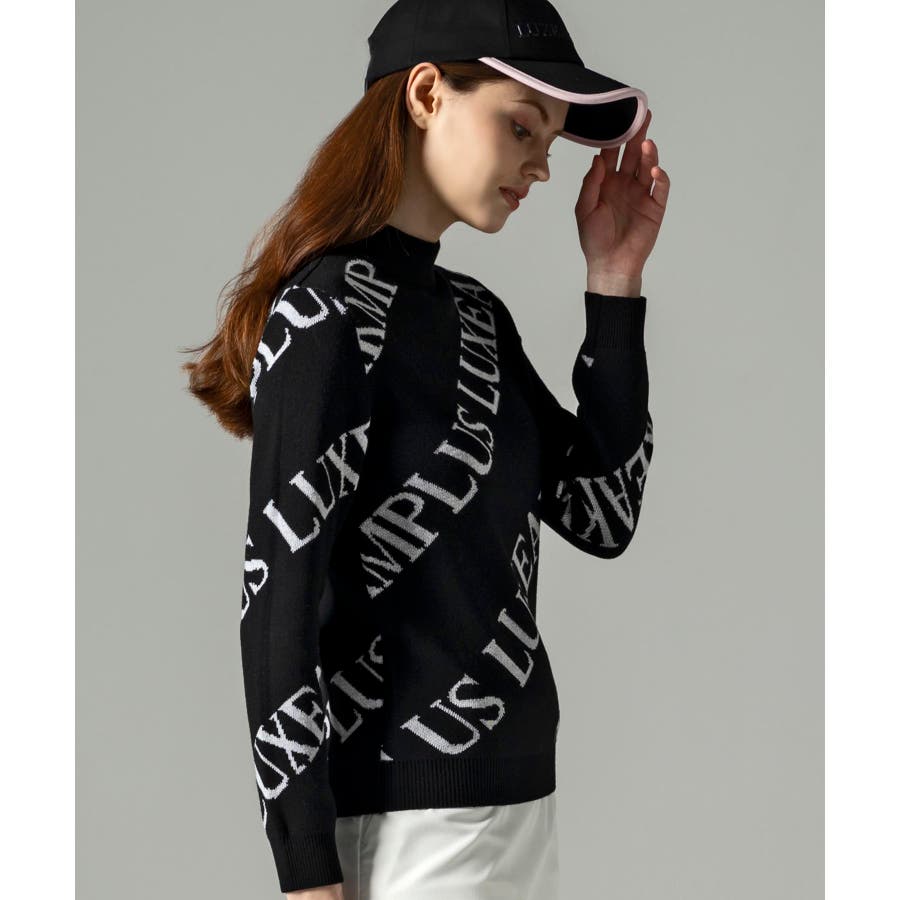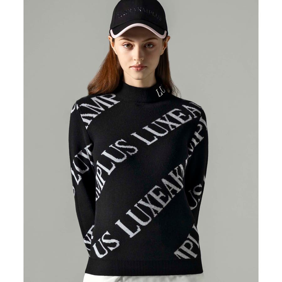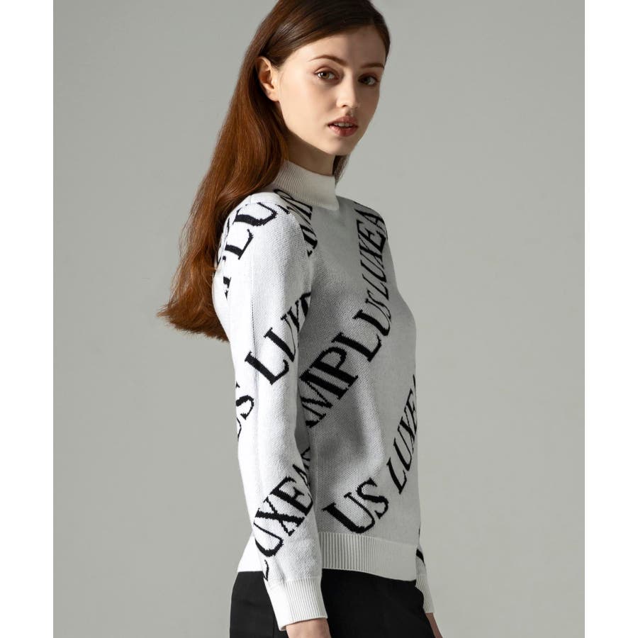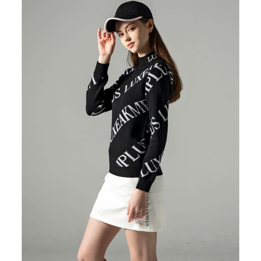 大胆に配置したブランドロゴがスタイリングを華やかに彩るモックネックニット。