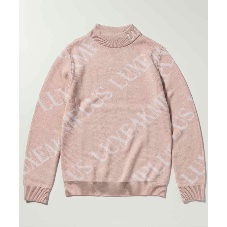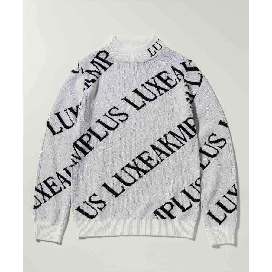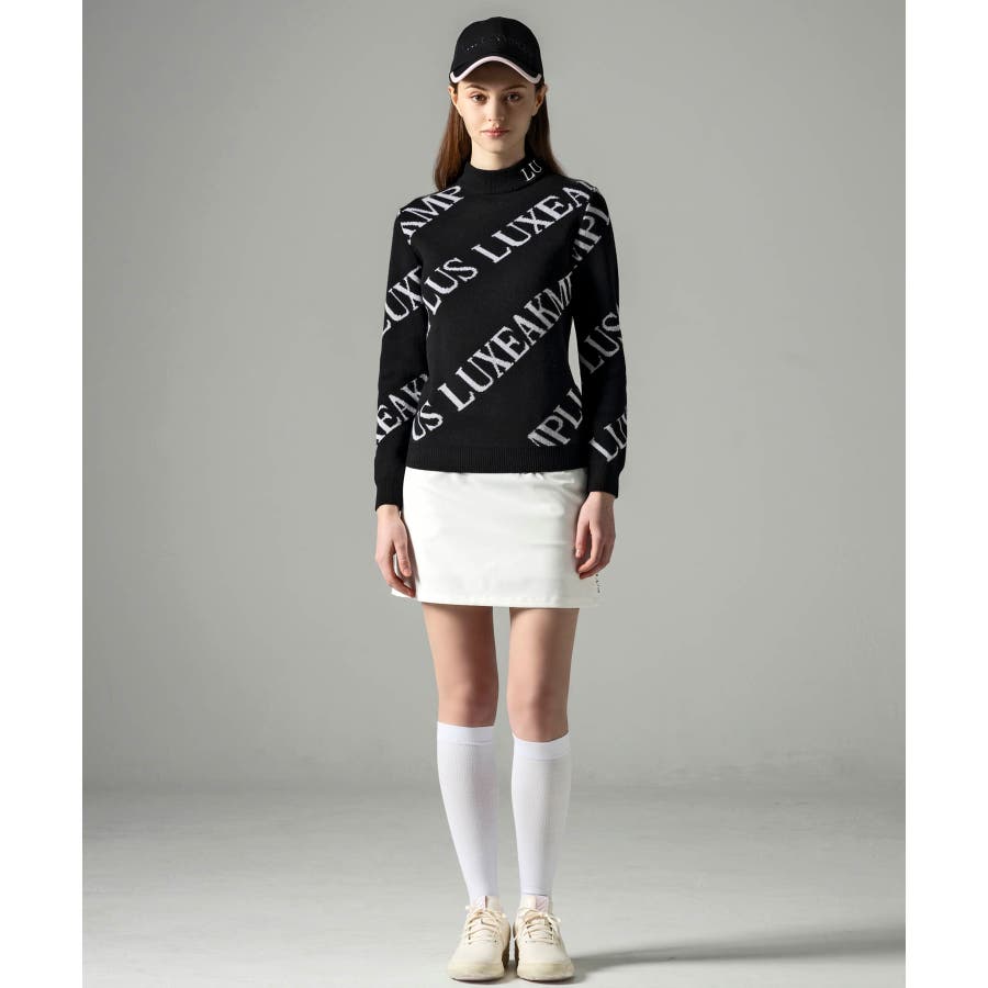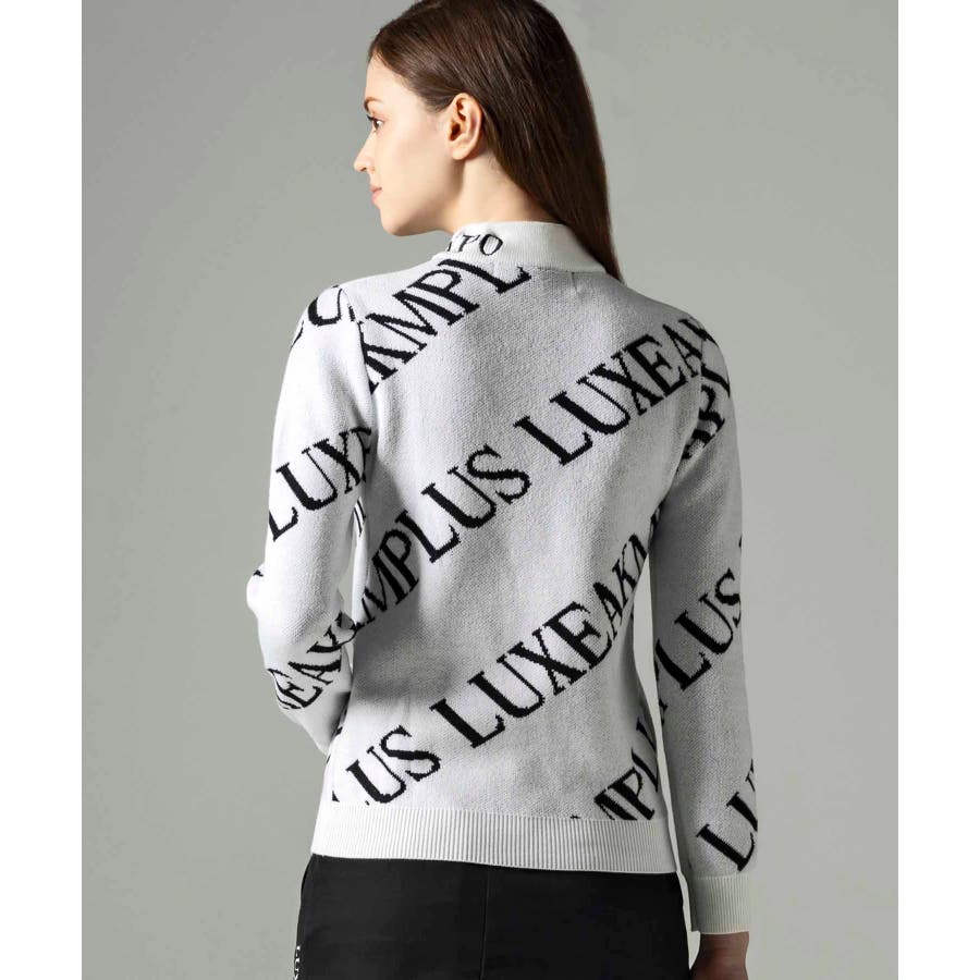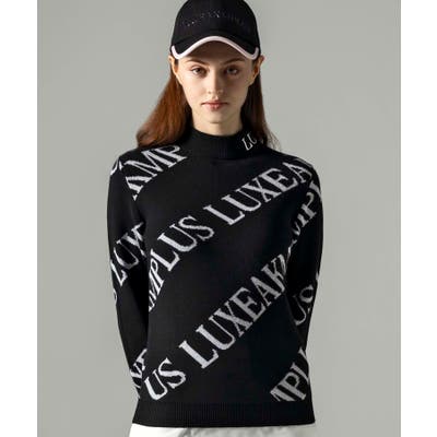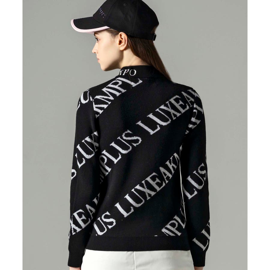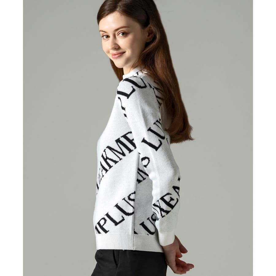 大胆に配置したブランドロゴがスタイリングを華やかに彩るモックネックニット。