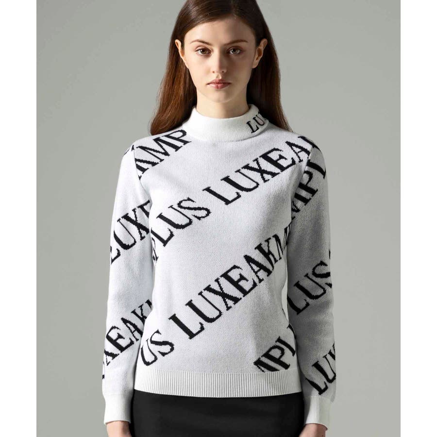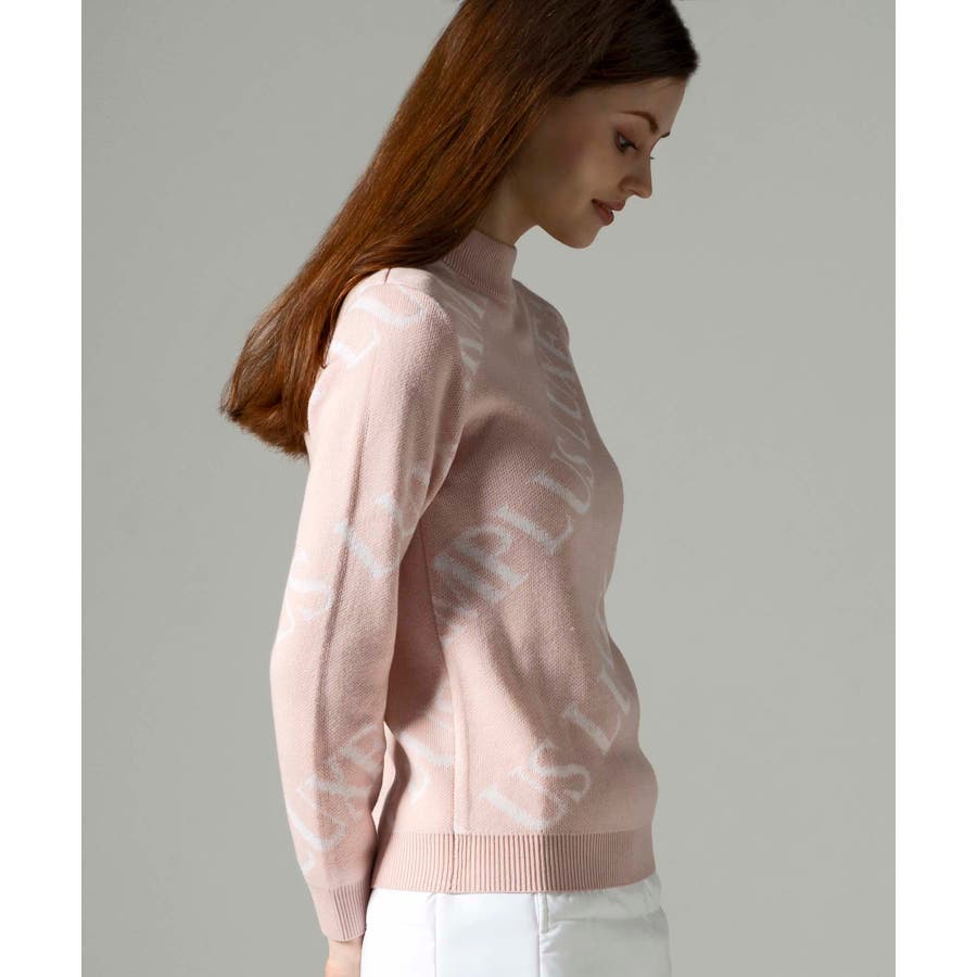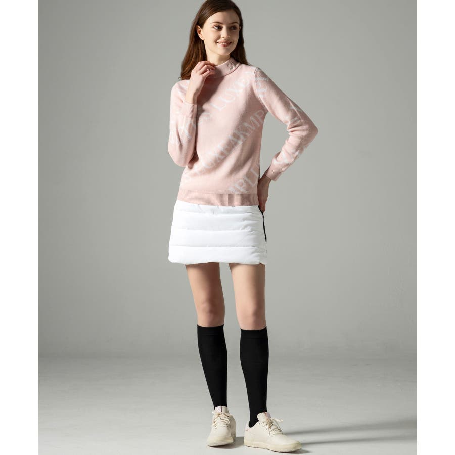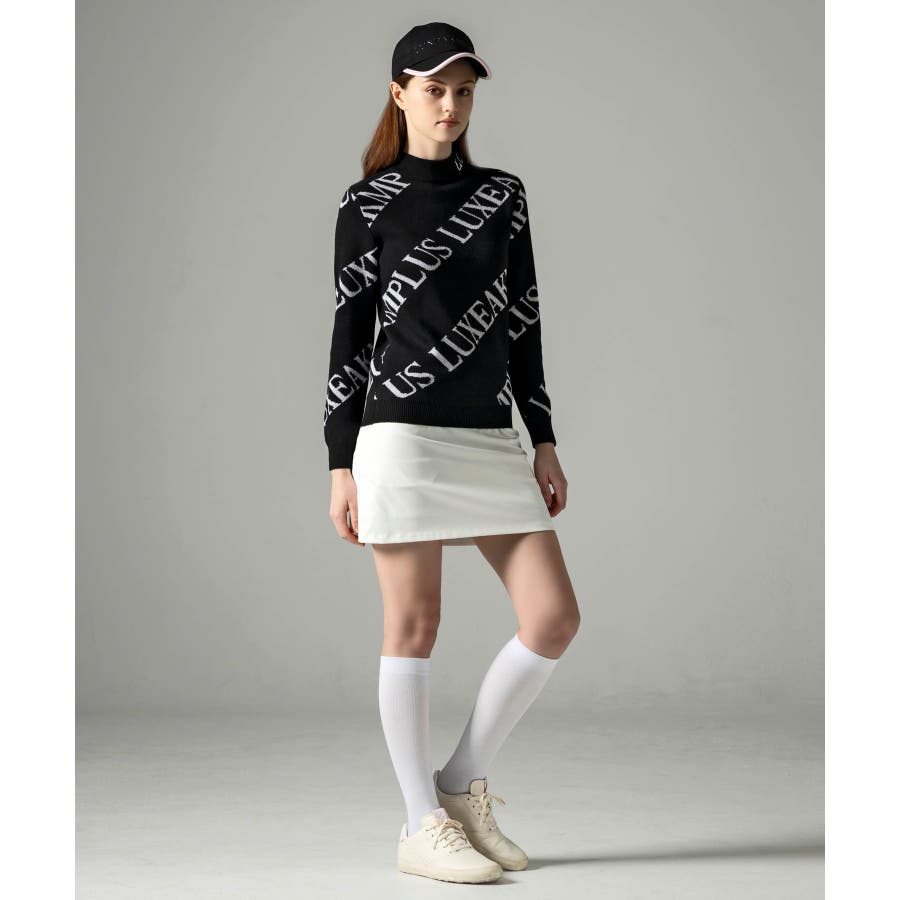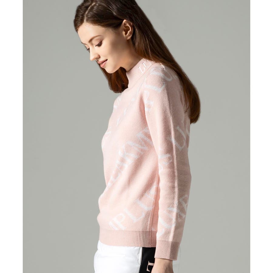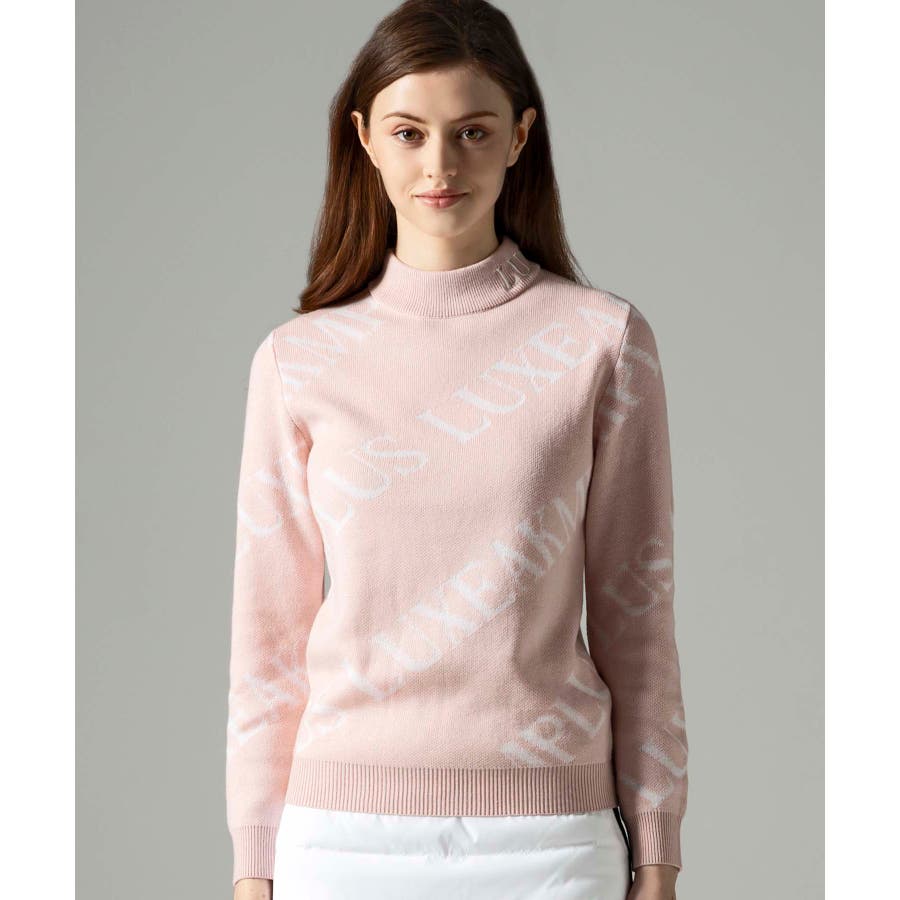 大胆に配置したブランドロゴがスタイリングを華やかに彩るモックネックニット。
