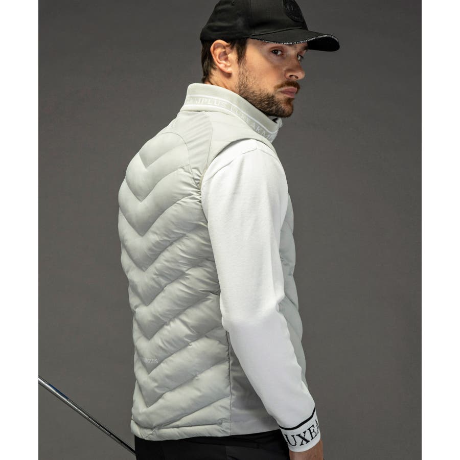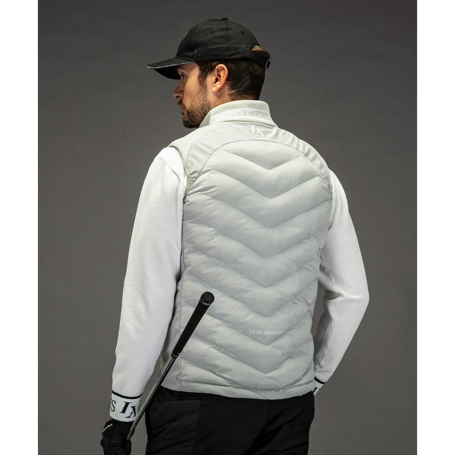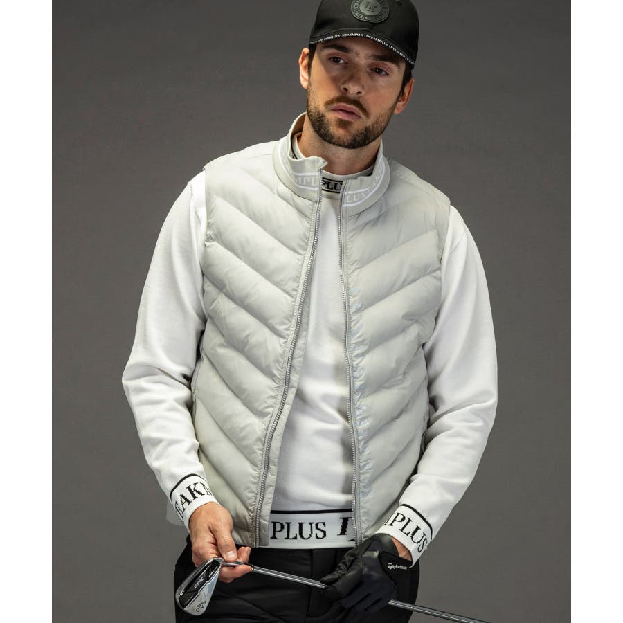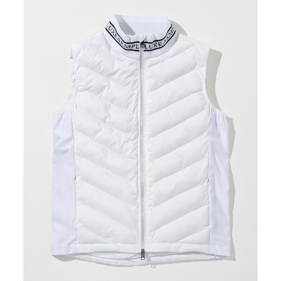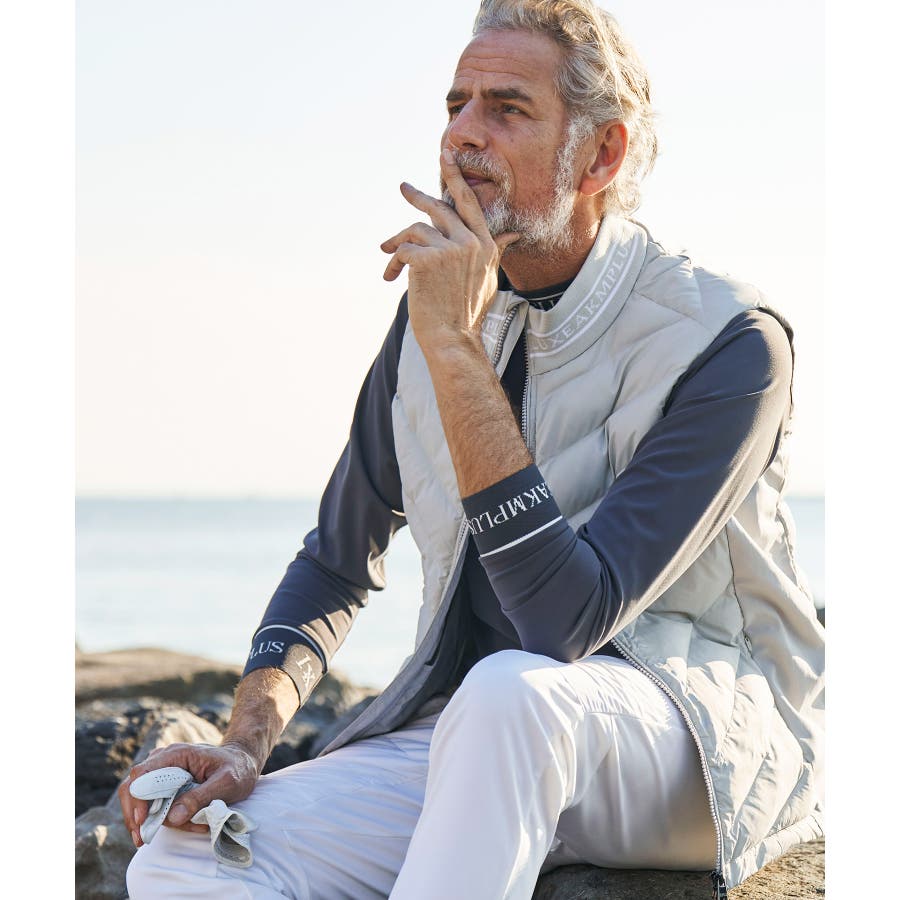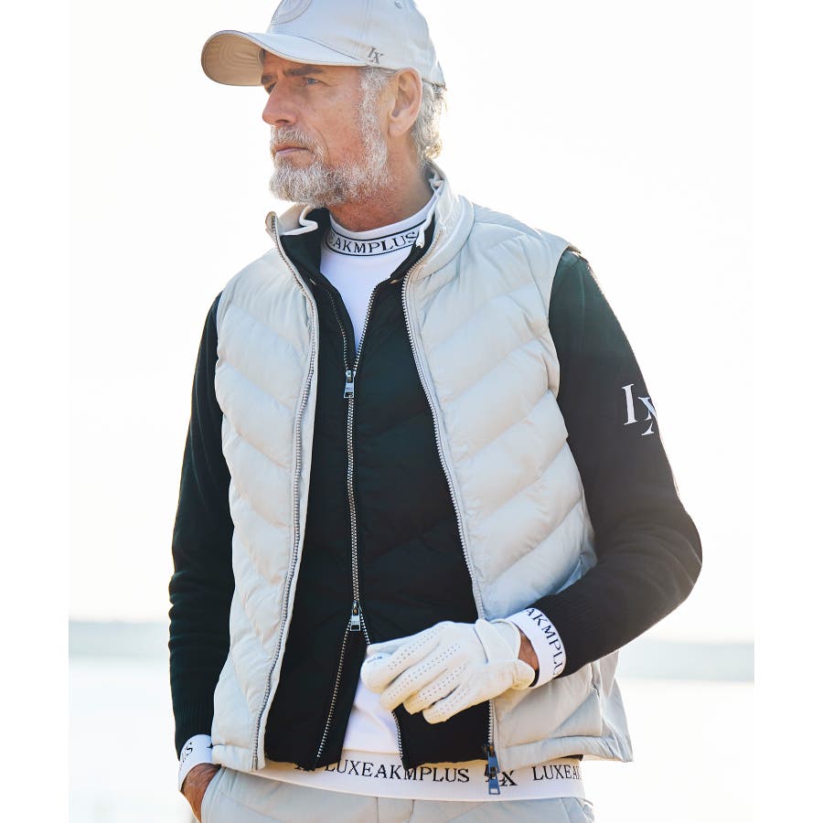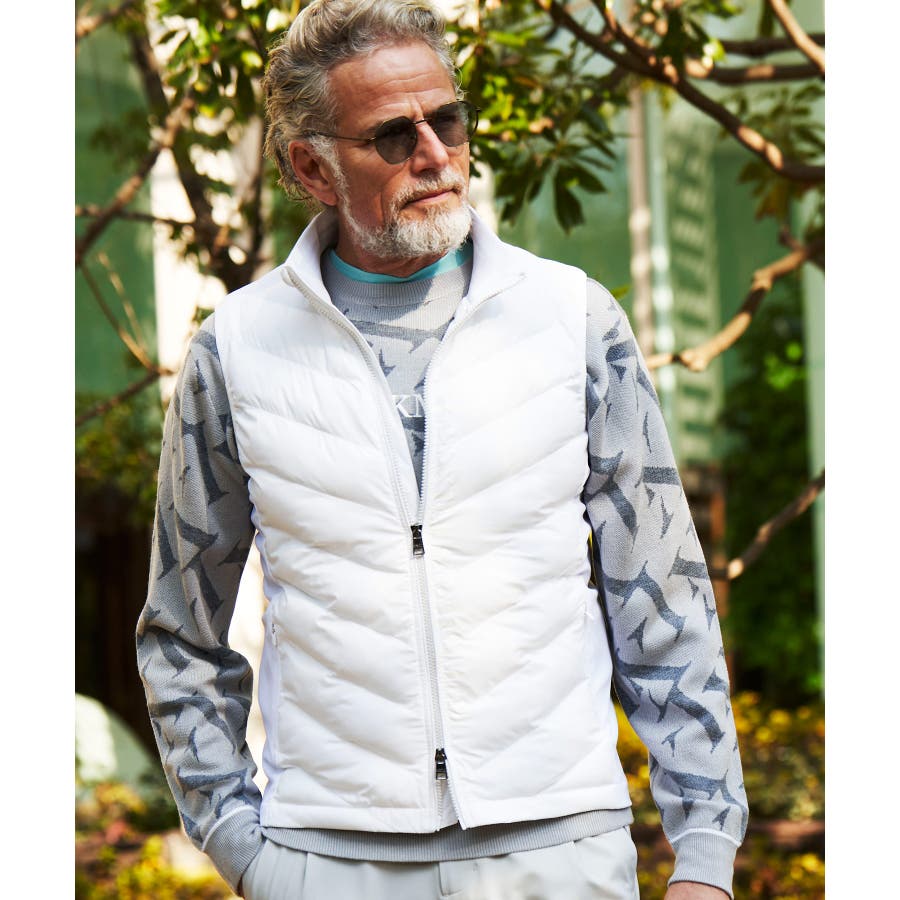ロゴ入りのジャガードリブネックが特徴的な、多機能ベスト。