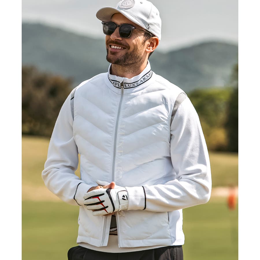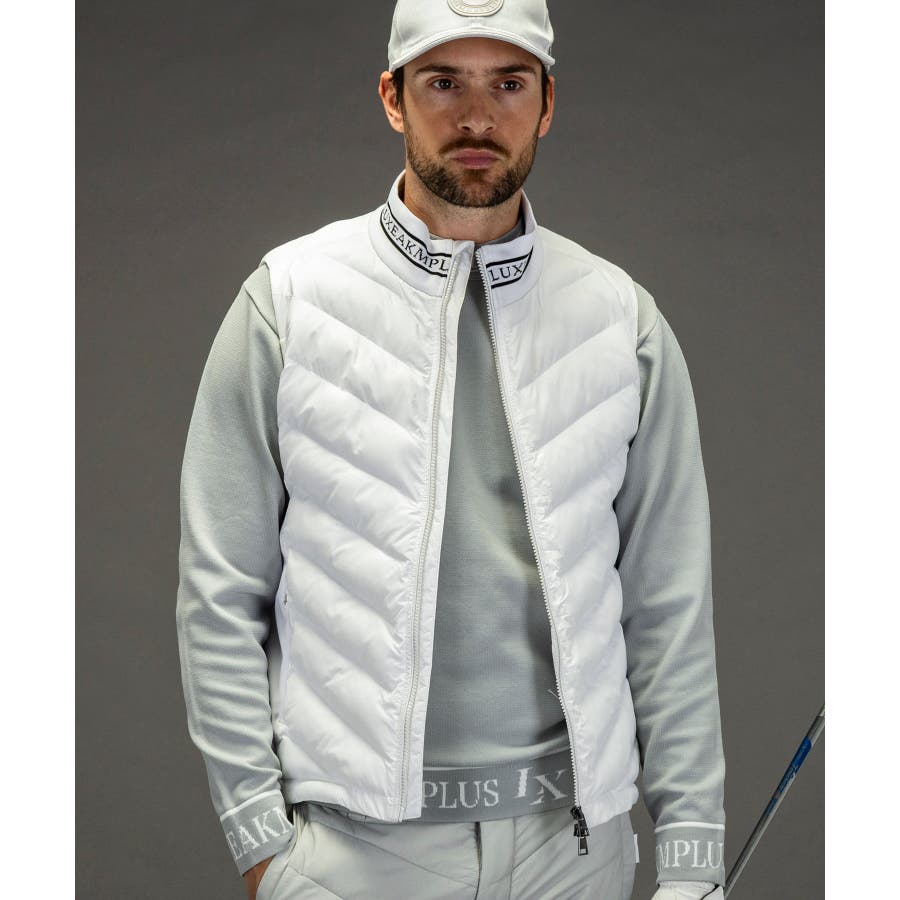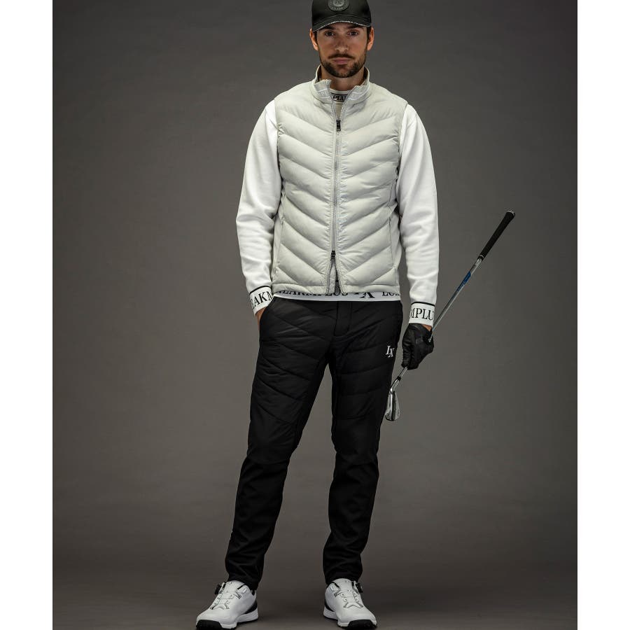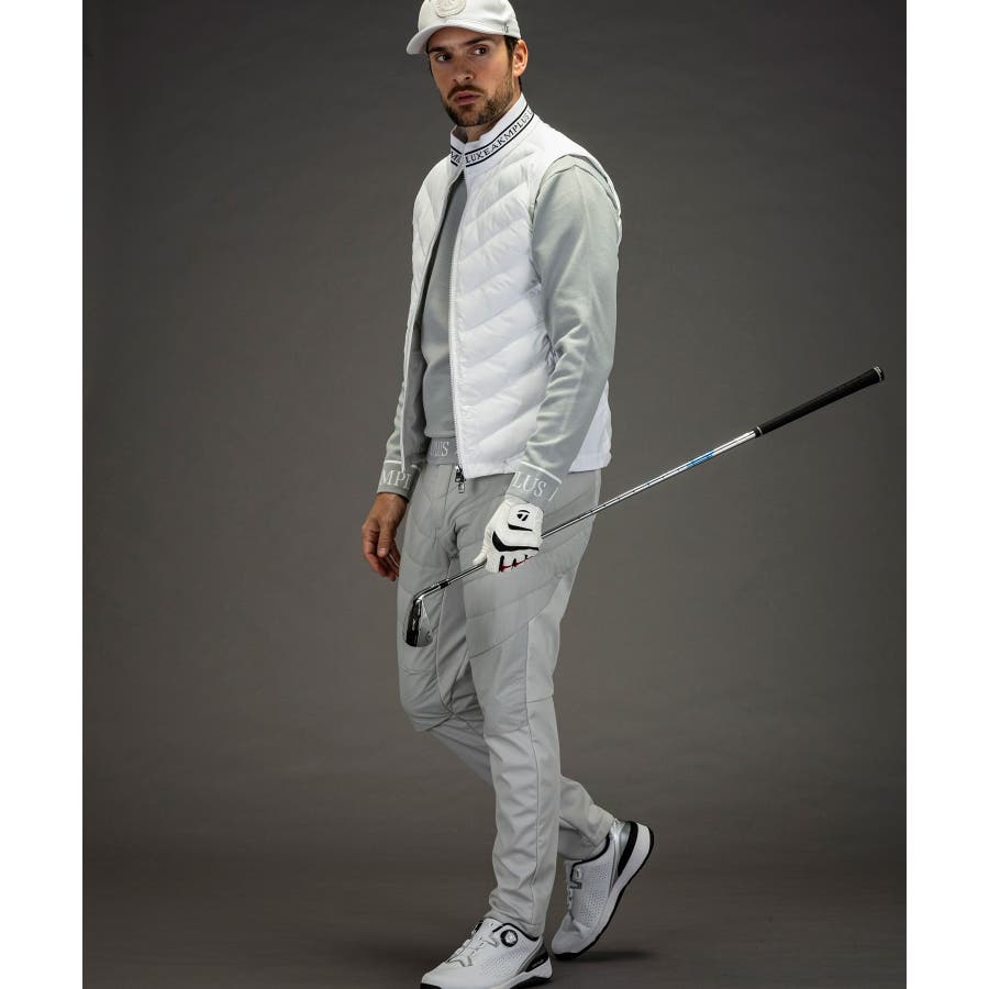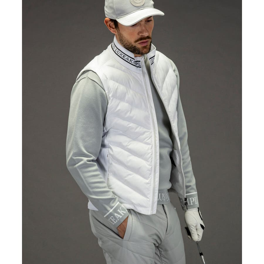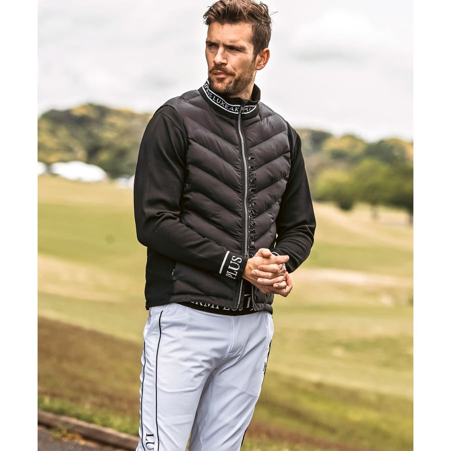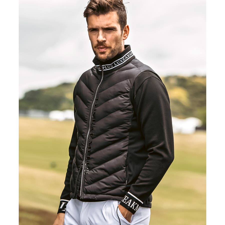 ロゴ入りのジャガードリブネックが特徴的な、多機能ベスト。