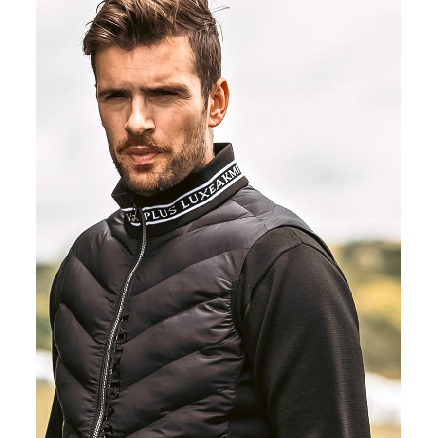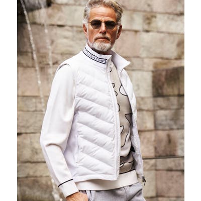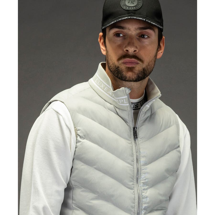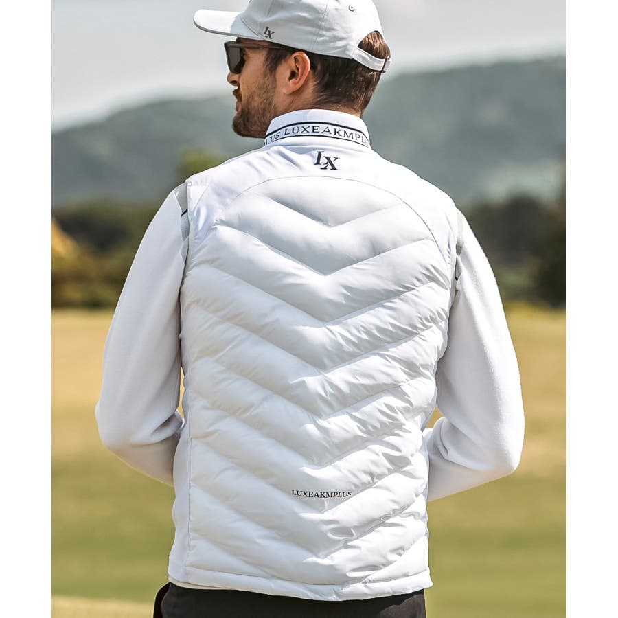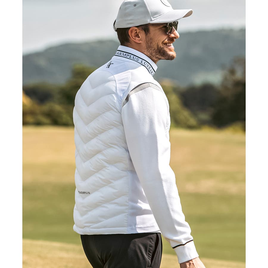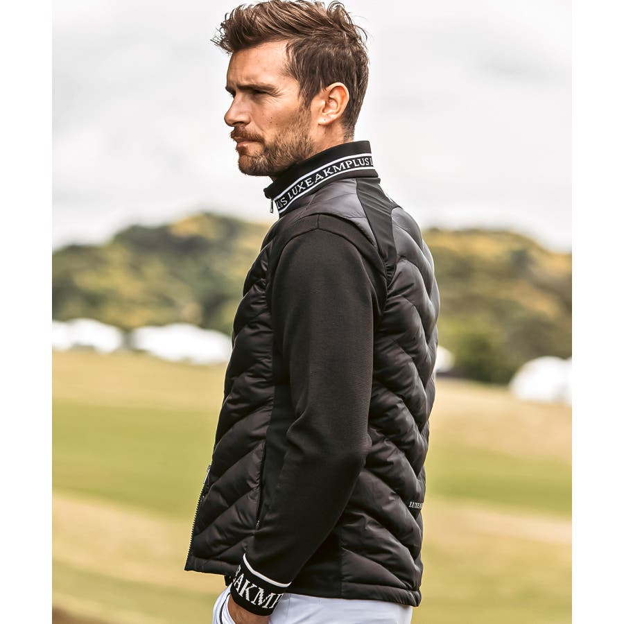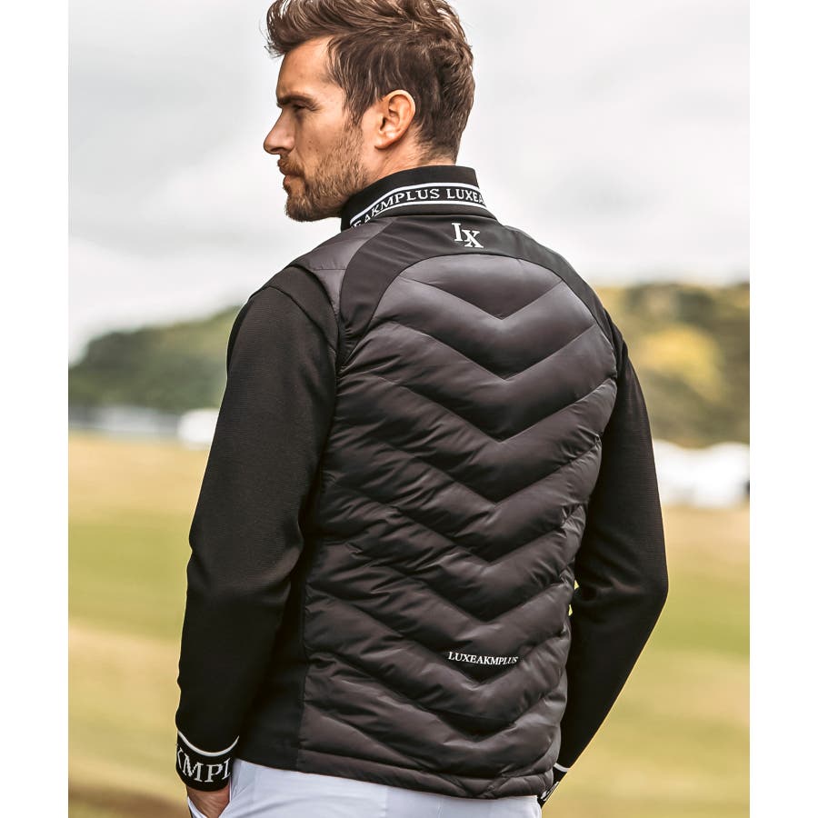 ロゴ入りのジャガードリブネックが特徴的な、多機能ベスト。