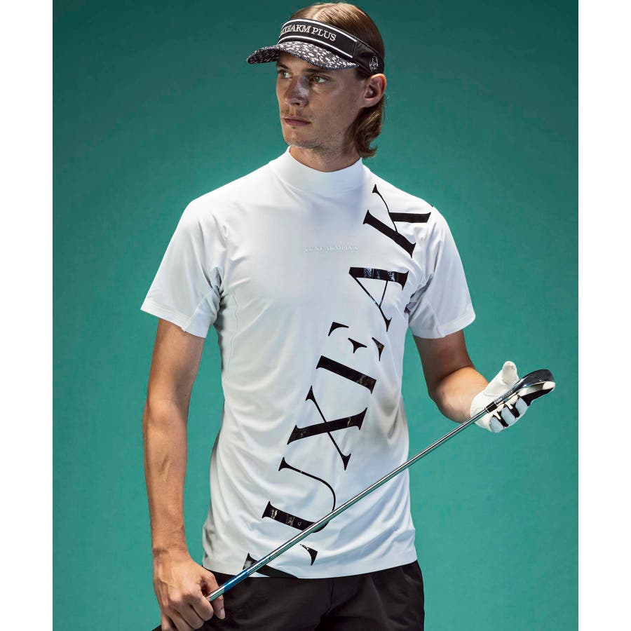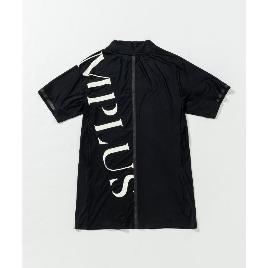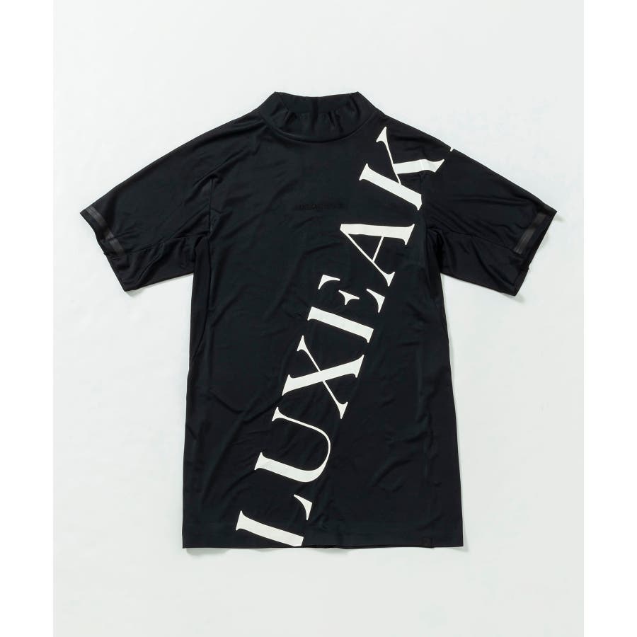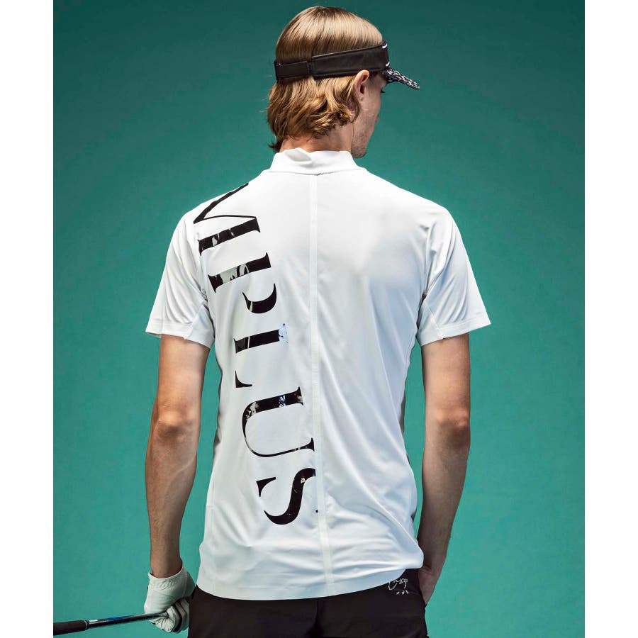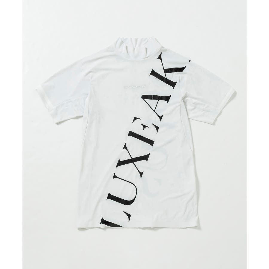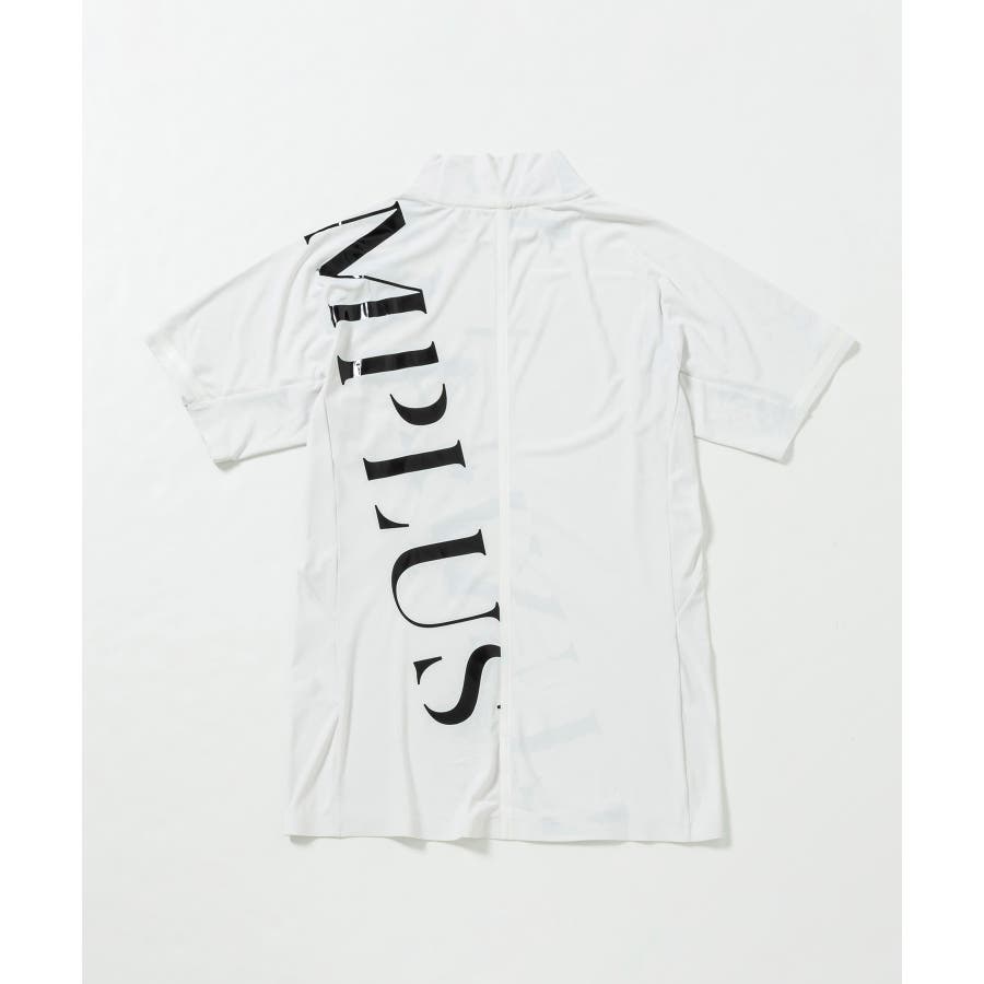 両面に入ったブランドロゴがインパクトのあるモックネックTシャツ。